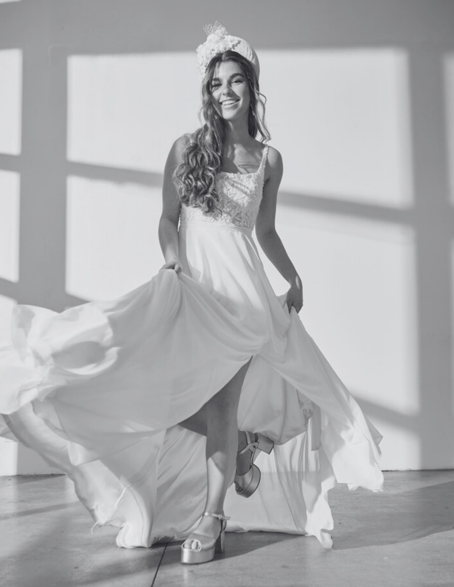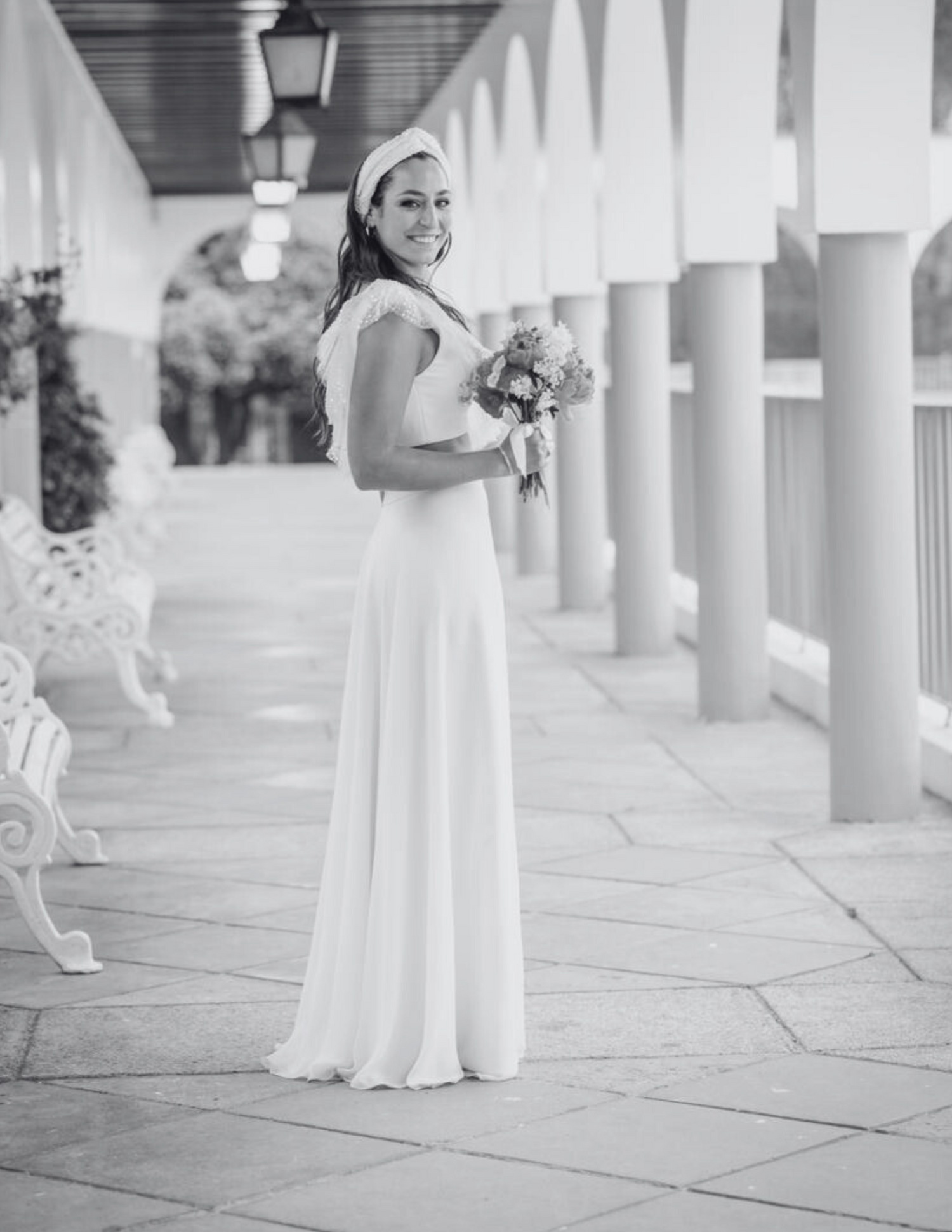 Sutil y lleno de carácter, este turbante entrelaza crepé de seda y encaje, ofreciendo un toque romántico y contemporáneo para novias que buscan destacar con elegancia natural.