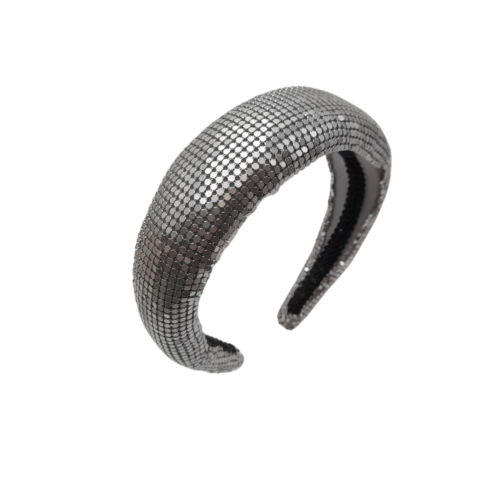 Diadema alta y ancha, confeccionada con tela metálica y adornada con strass, que aporta un brillo deslumbrante y un toque de elegancia moderna a tu peinado.