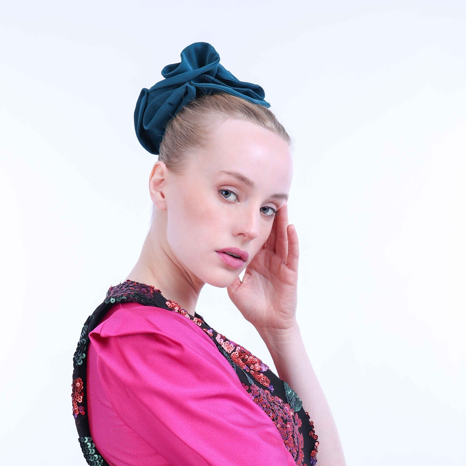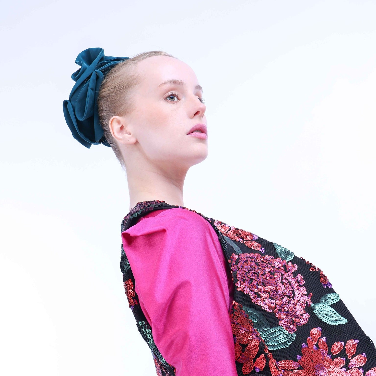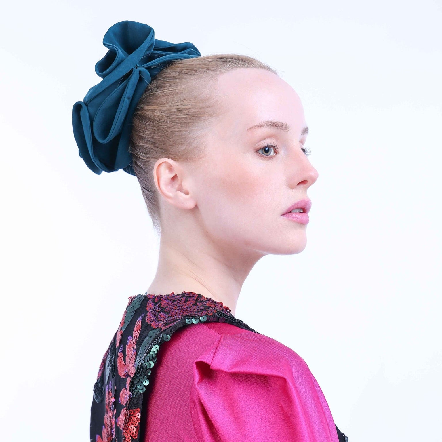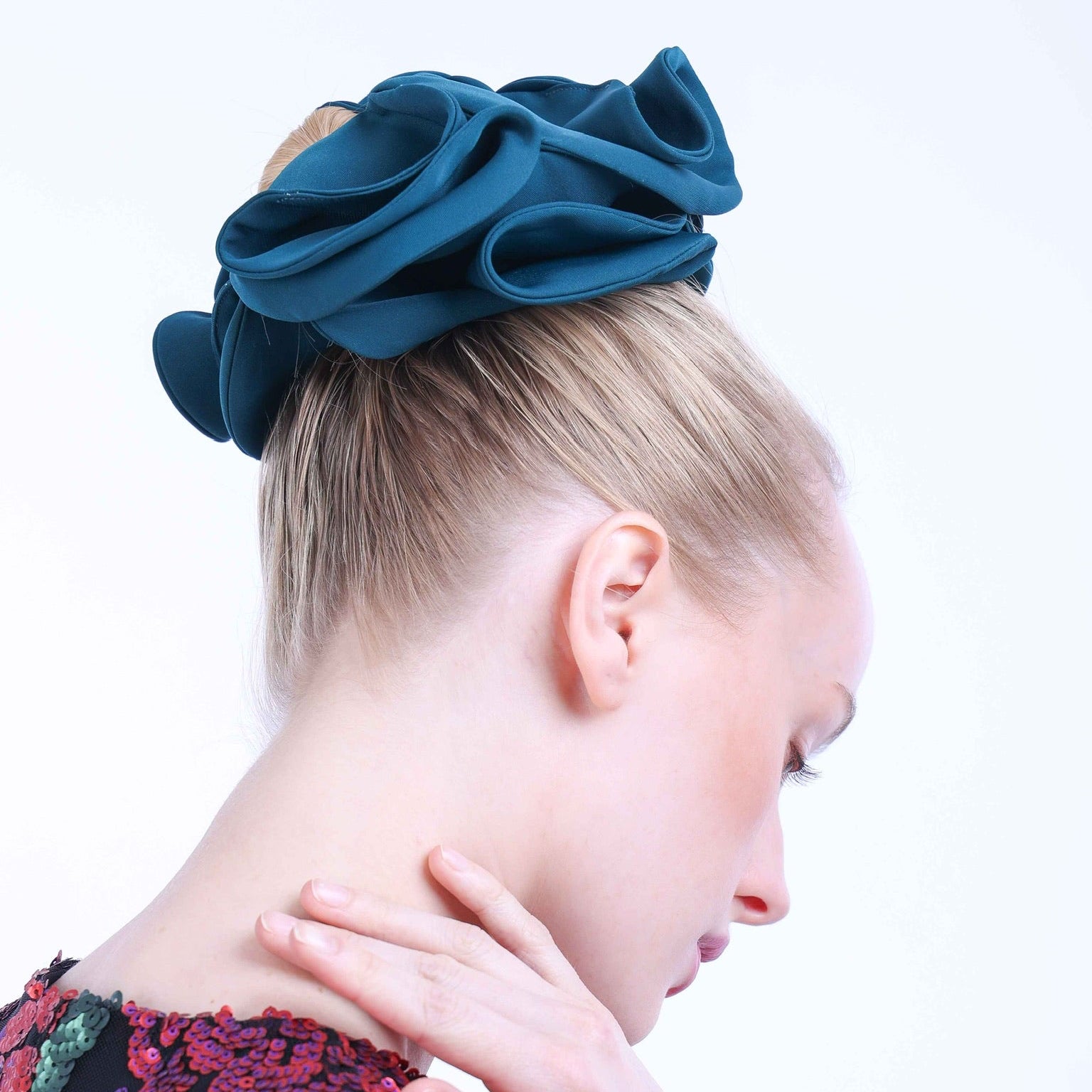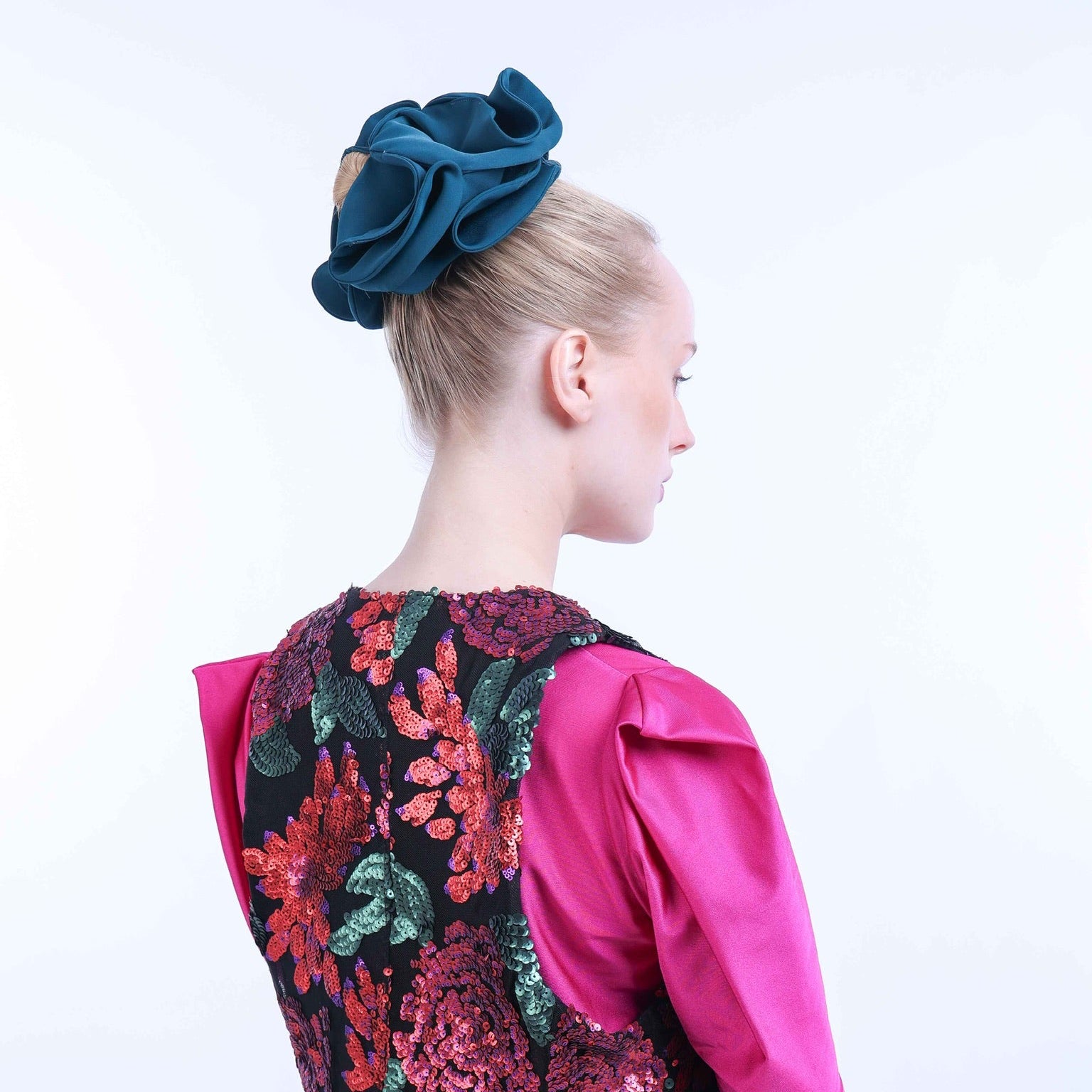 Pin confeccionado a mano en nuestro taller, utilizando crepé de seda de doble cara, drapeado cuidadosamente en forma circular para aportar textura y volumen. Cada pieza está forrada en tela, logrando un acabado suave, delicado y elegante.