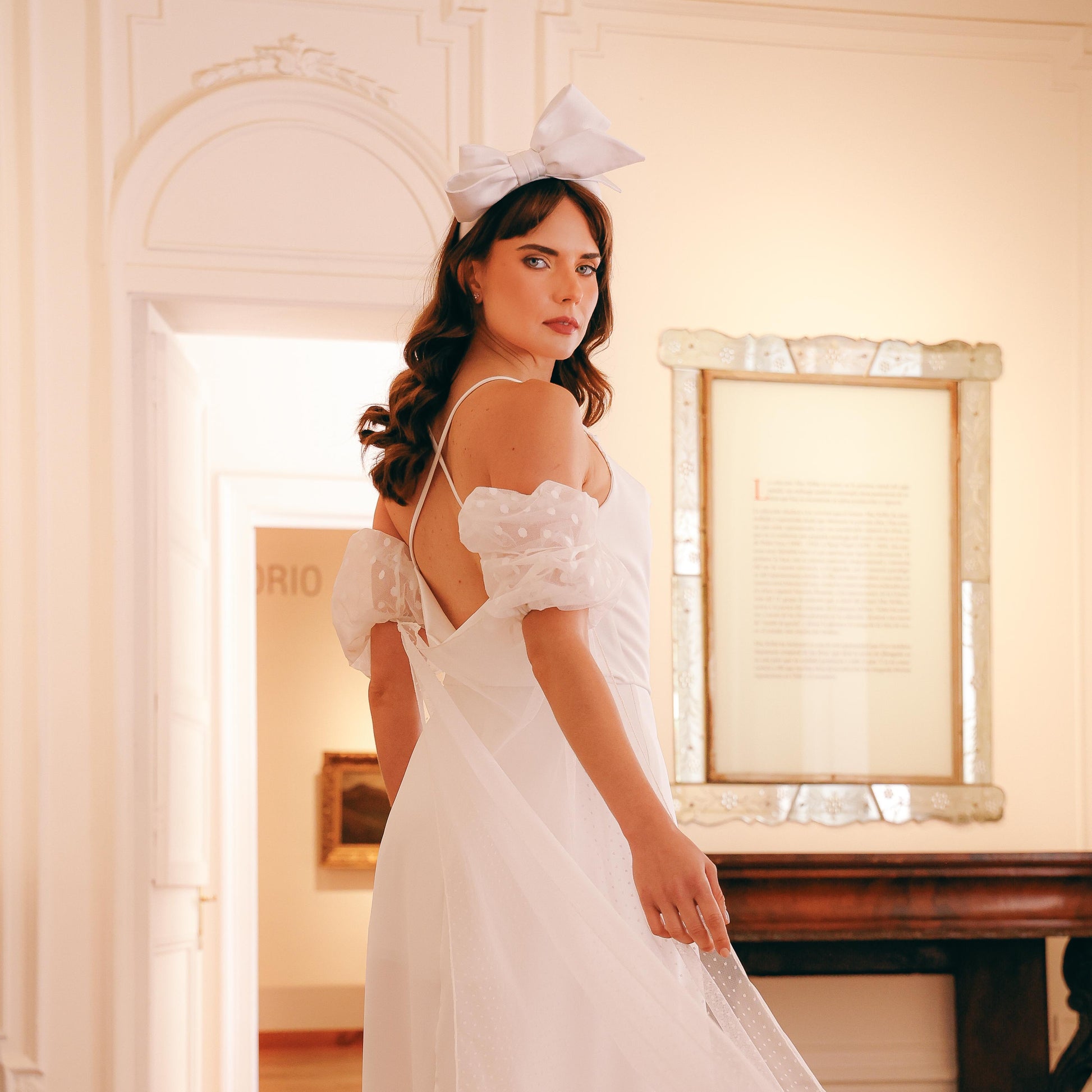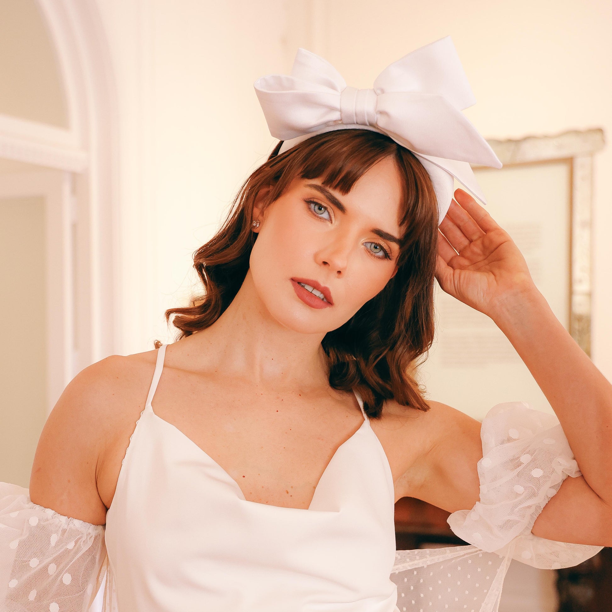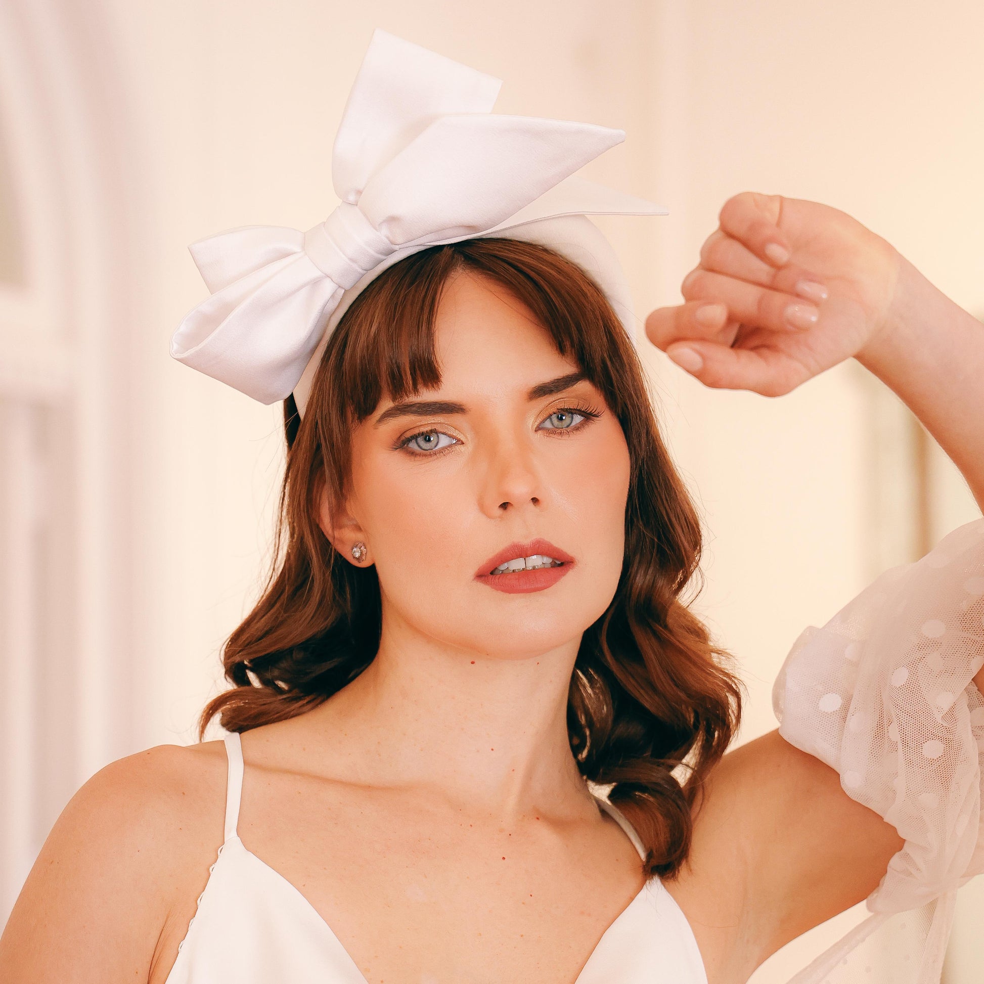 Diadema alta con un lazo asimétrico en crepé de seda, que aporta un toque sofisticado y contemporáneo a tu peinado
