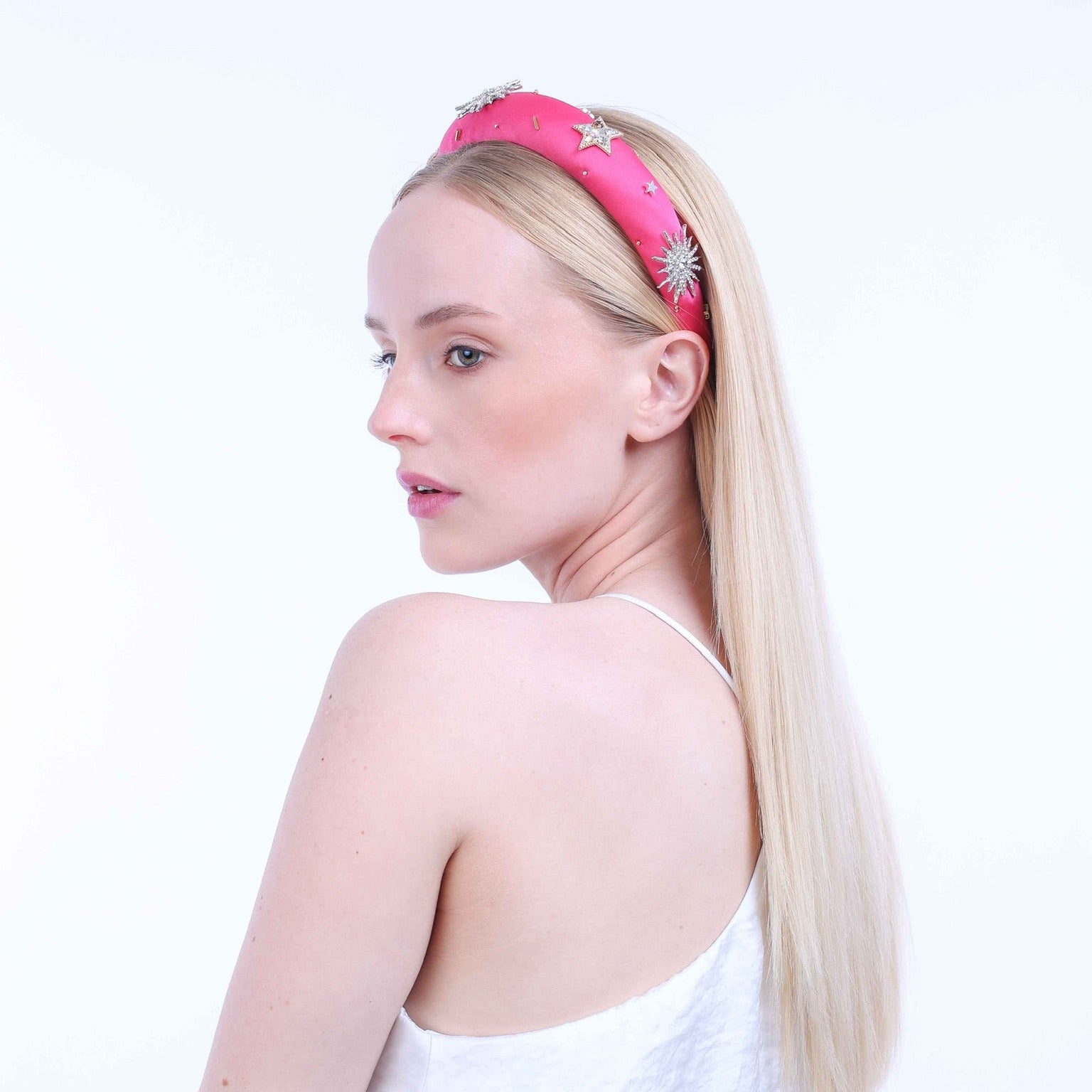 Diadema alta y ancha, cuidadosamente bordada con lentejuelas, mostacillas y aplicaciones de estrellas. Un accesorio llamativo y lleno de brillo, ideal para dar un toque de fantasía y estilo único a looks festivos o especiales.