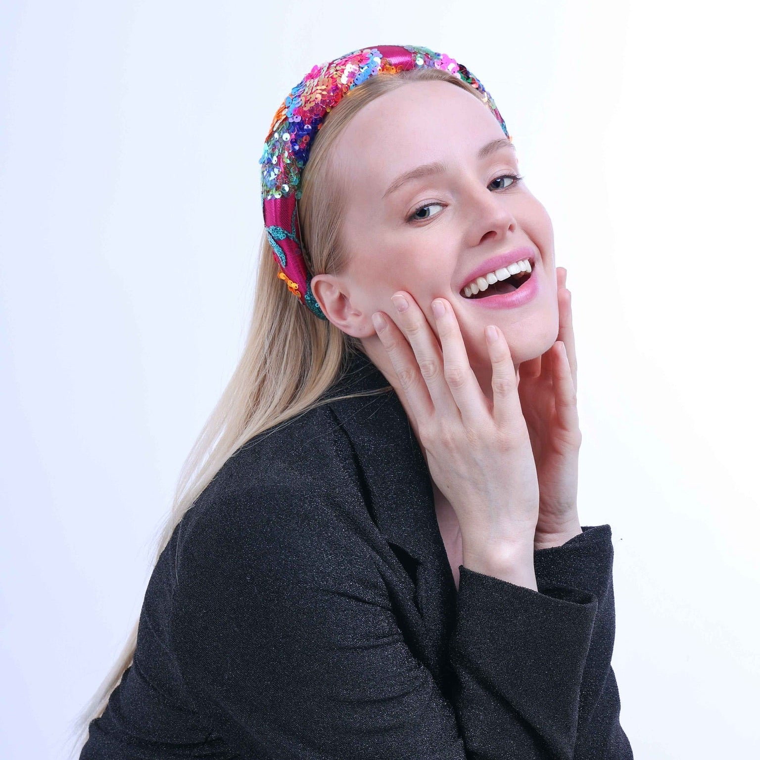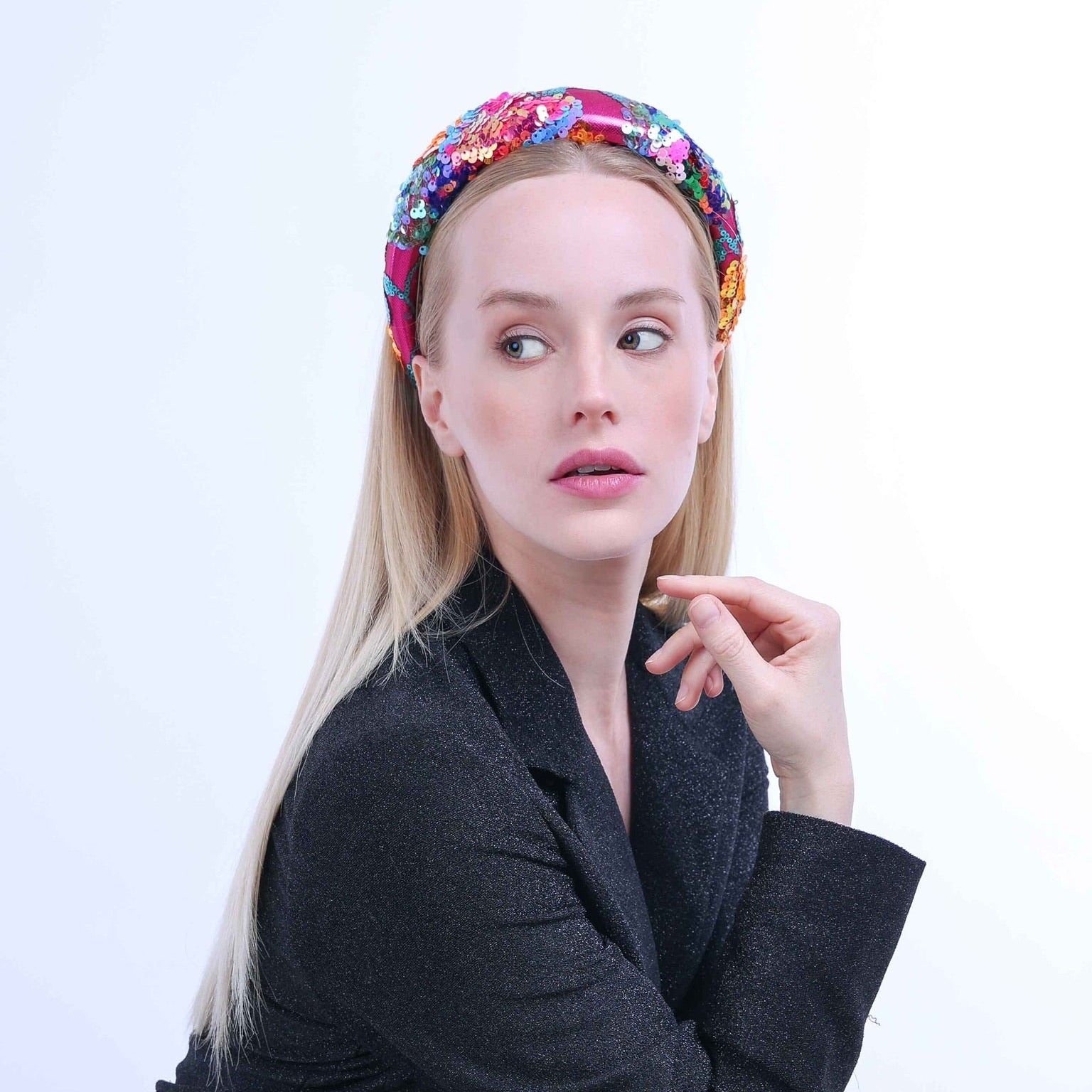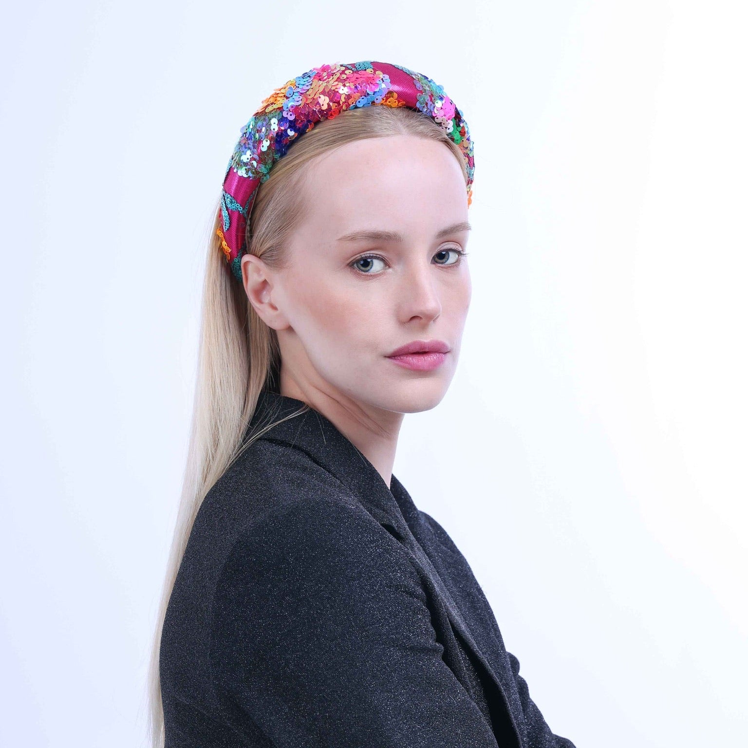 Diadema alta y ancha, confeccionada con tul decorado con lentejuelas, que aporta un brillo sutil y elegante. Perfecta para realzar peinados con un toque glamuroso y delicado, ideal para ocasiones especiales o para darle luz a tu look diario.