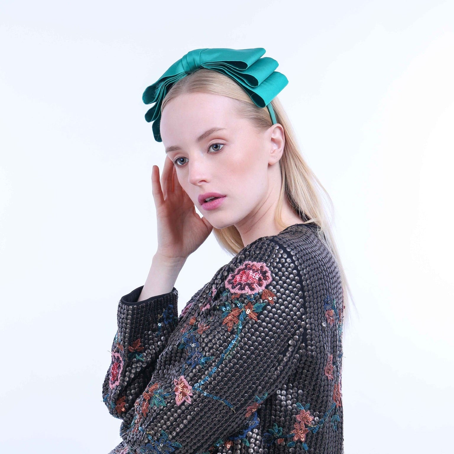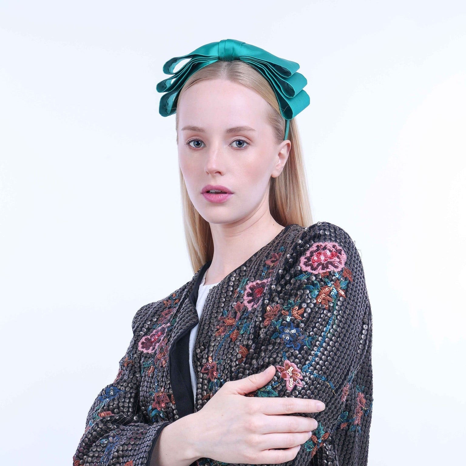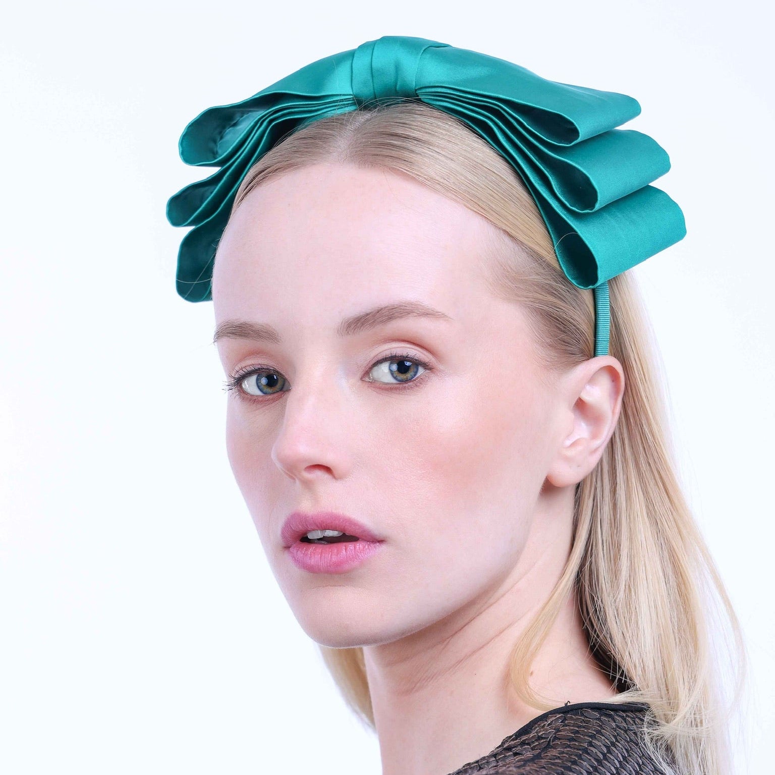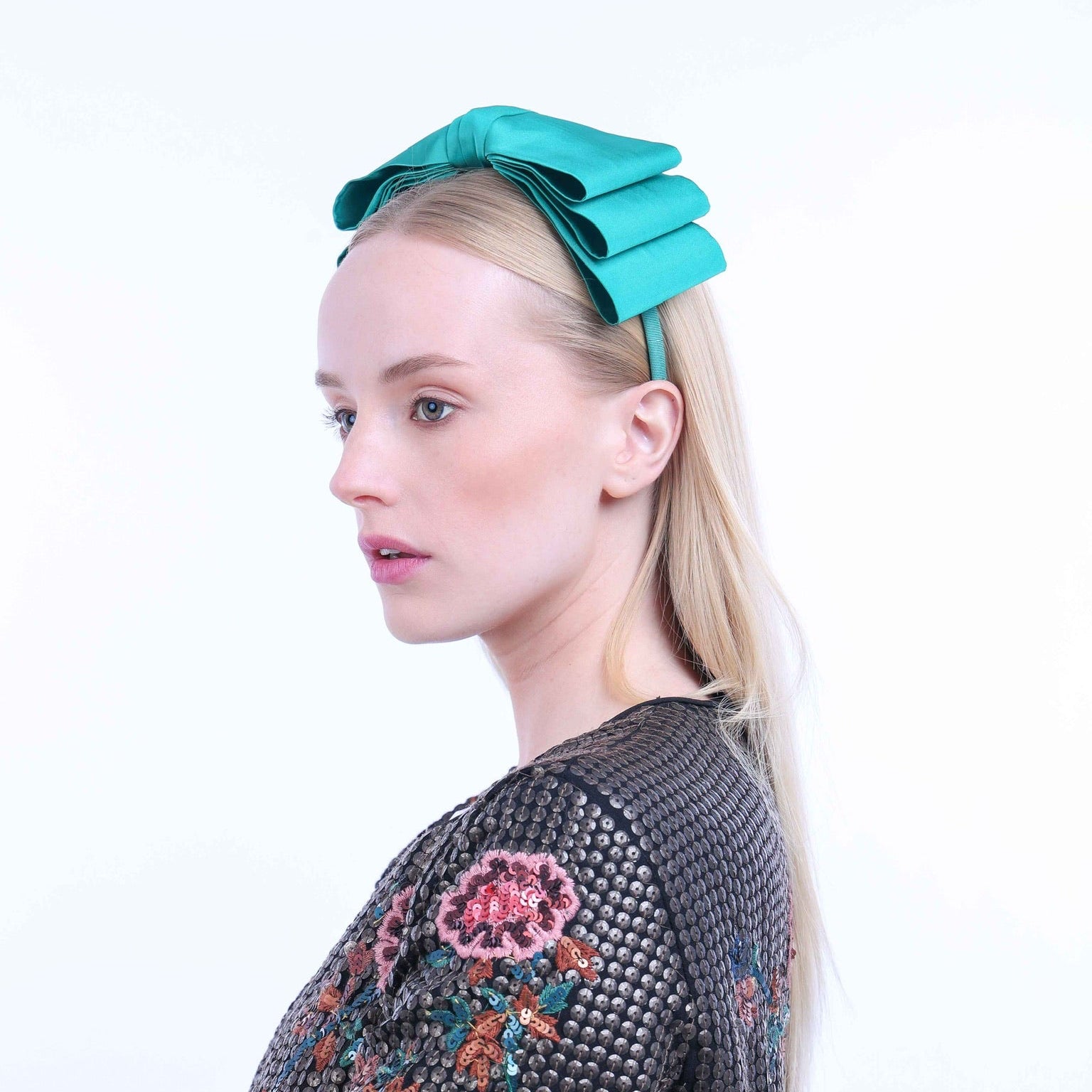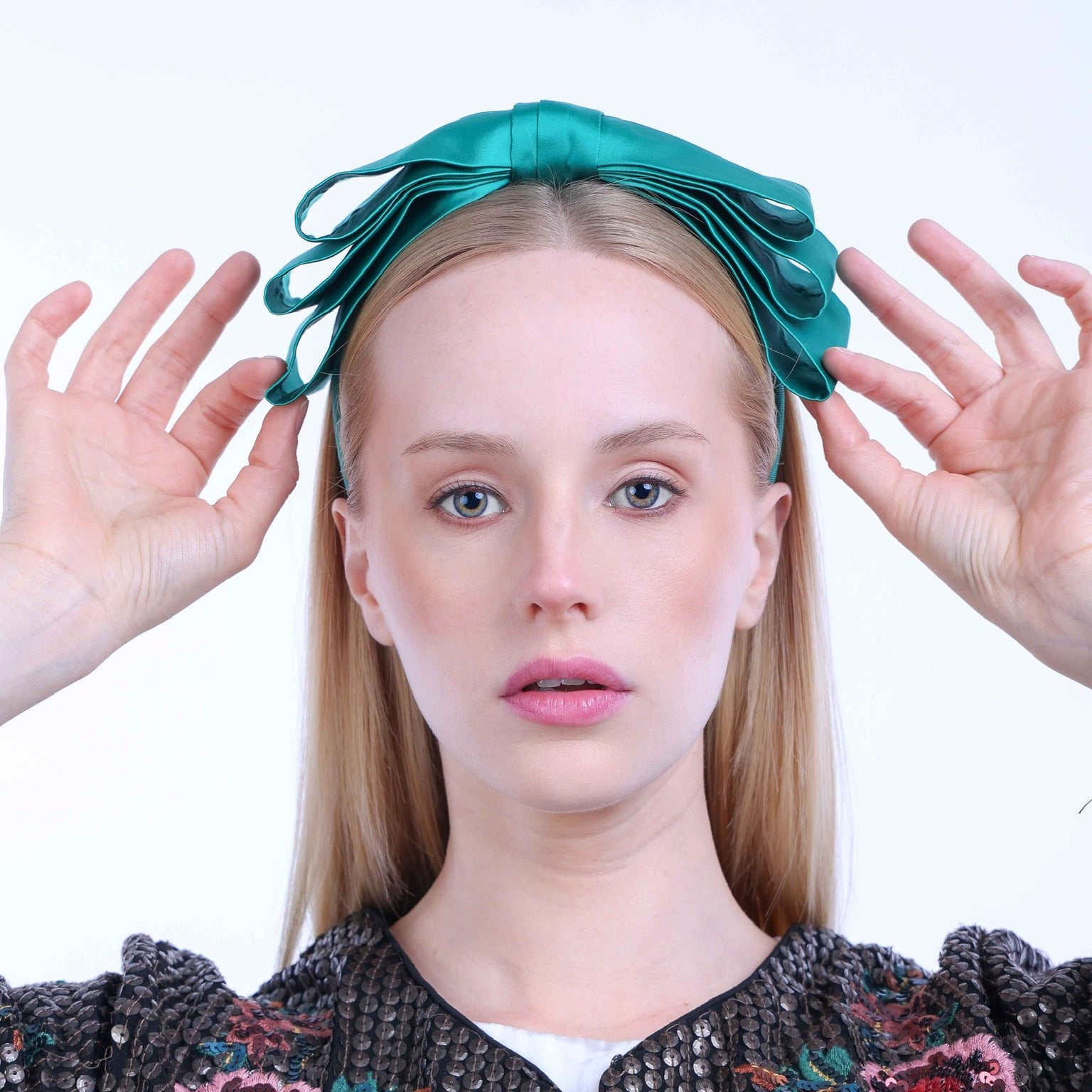 Diadema delgada con lazo triple, confeccionada en seda, que aporta un toque refinado y femenino. Ideal para complementar peinados con un detalle sutil, elegante y con movimiento.