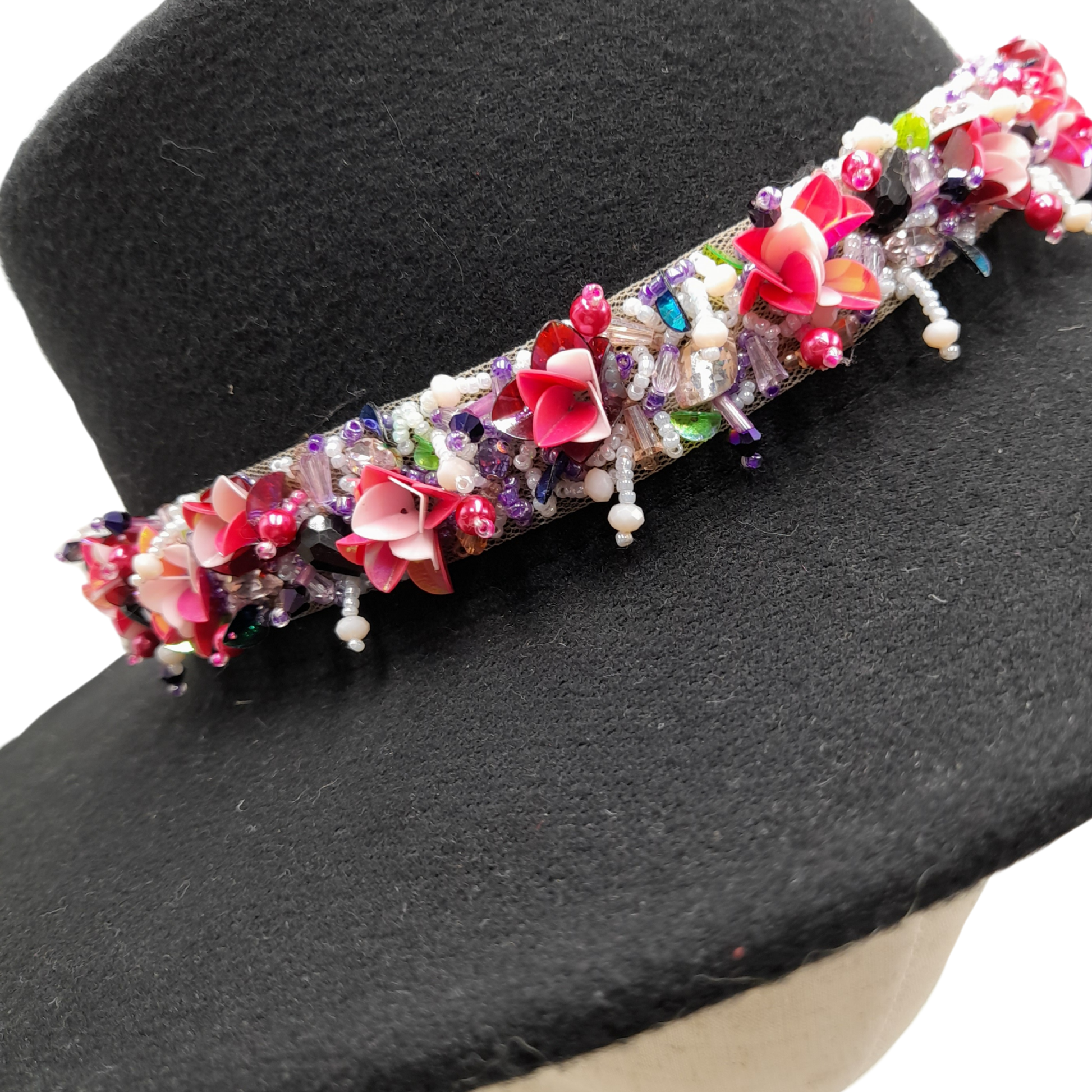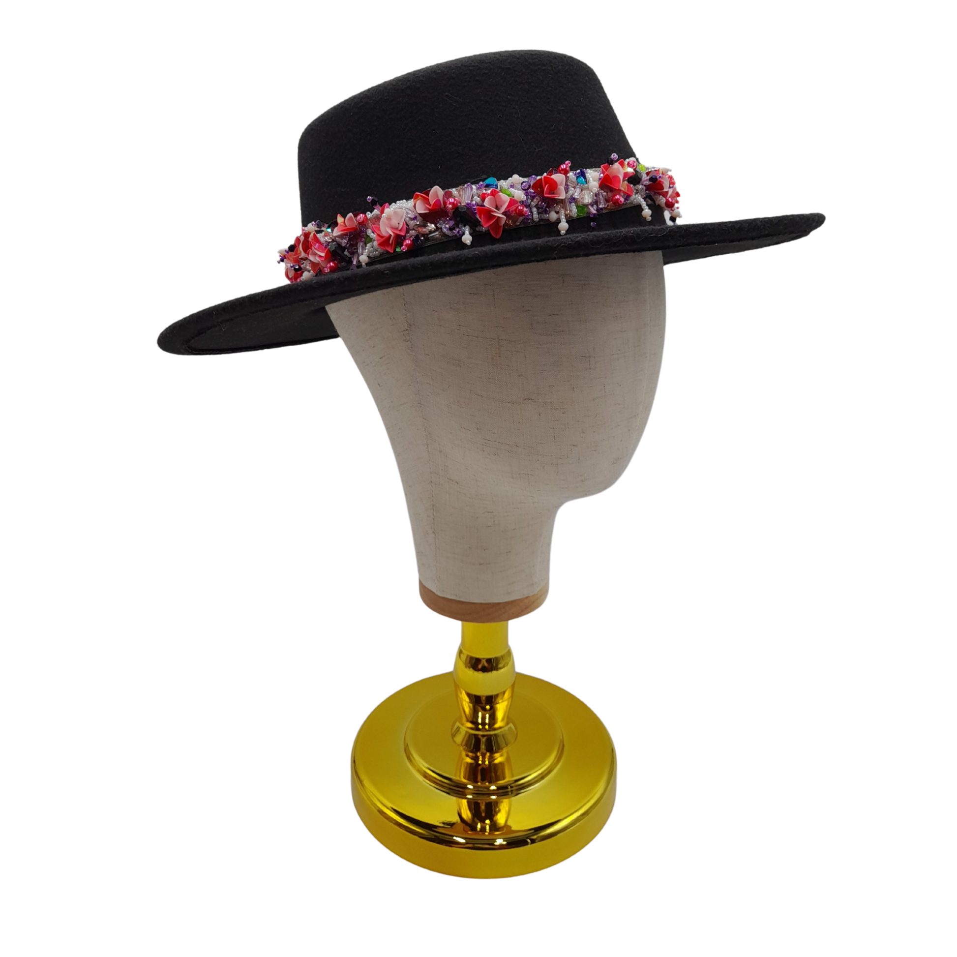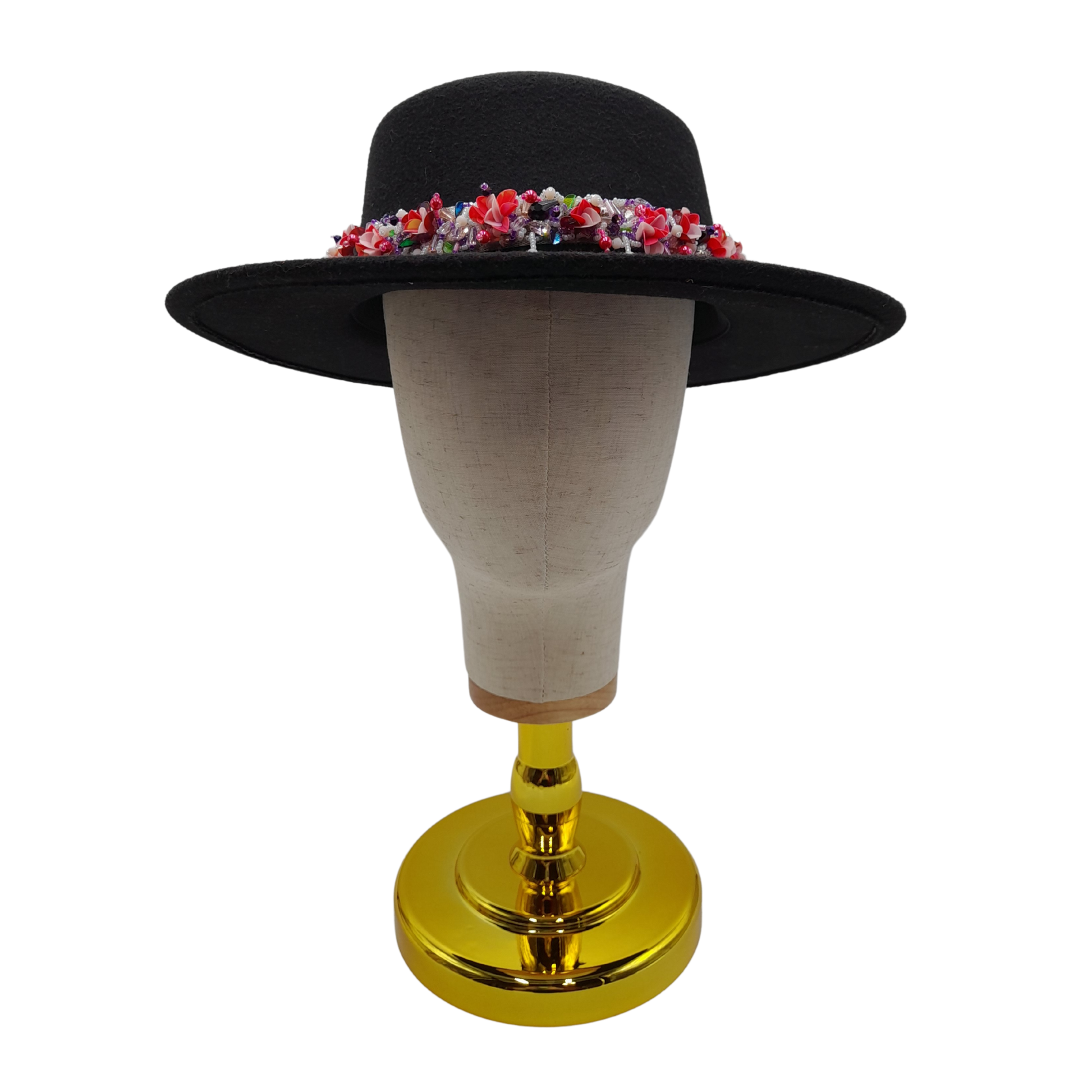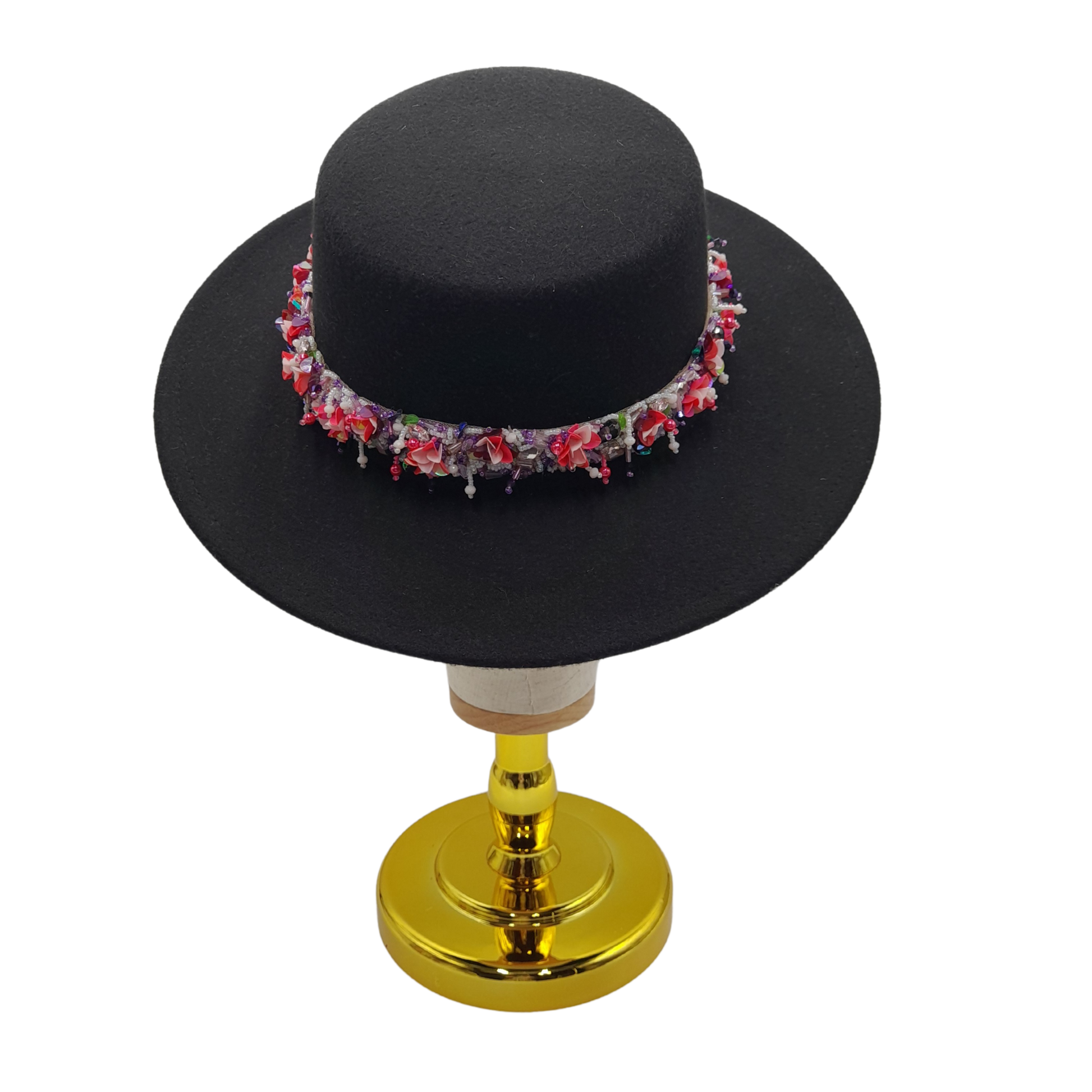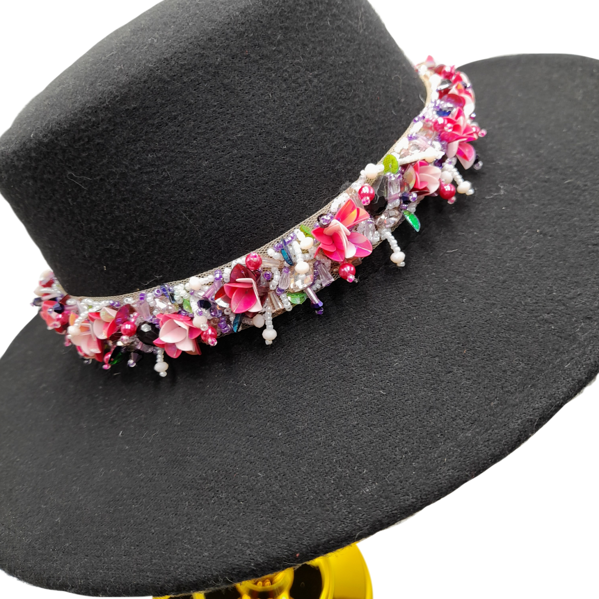 Sombrero Boater en color negro, adornado con una cinta de lentejuelas que aporta brillo y sofisticación, perfecto para complementar cualquier look con un toque elegante y moderno.