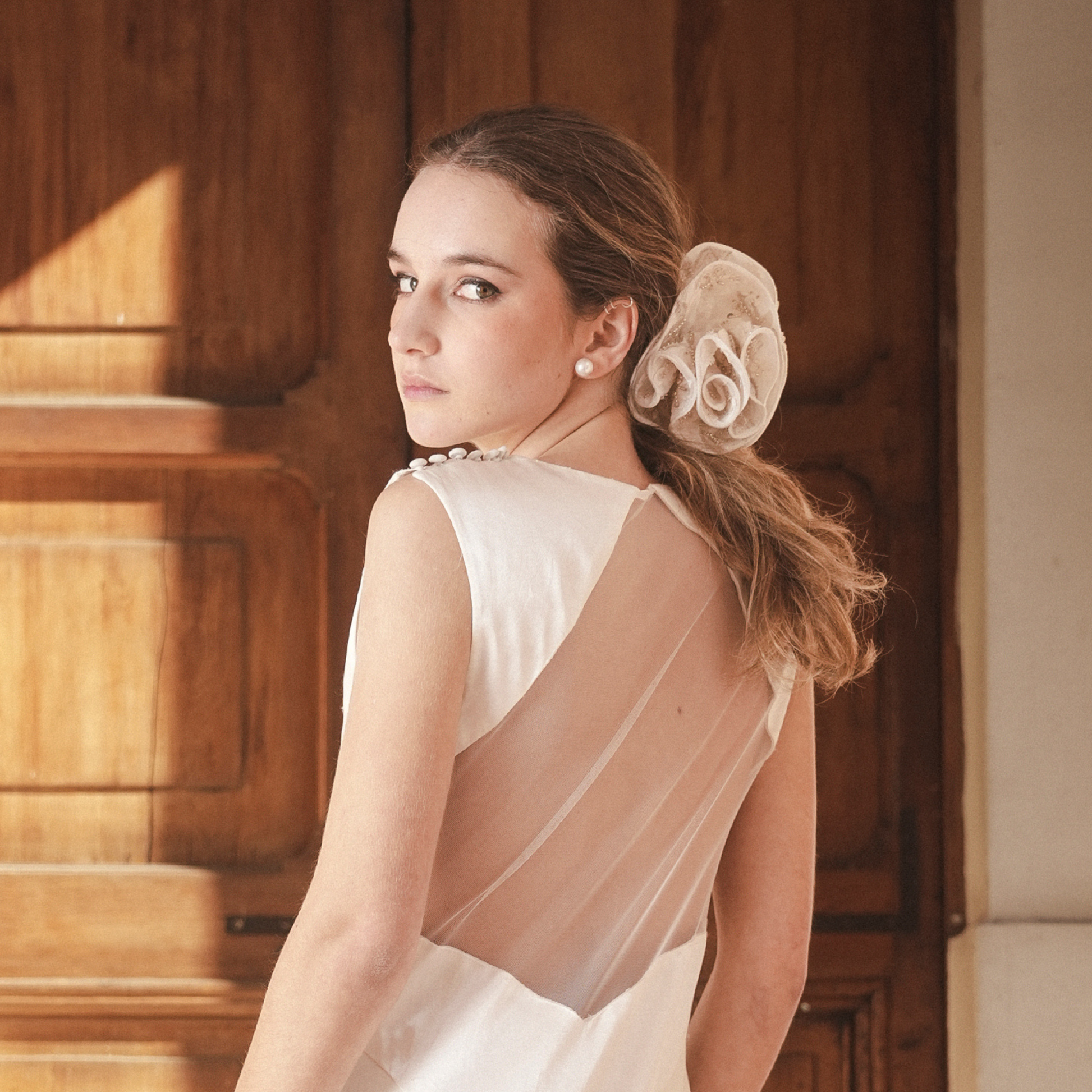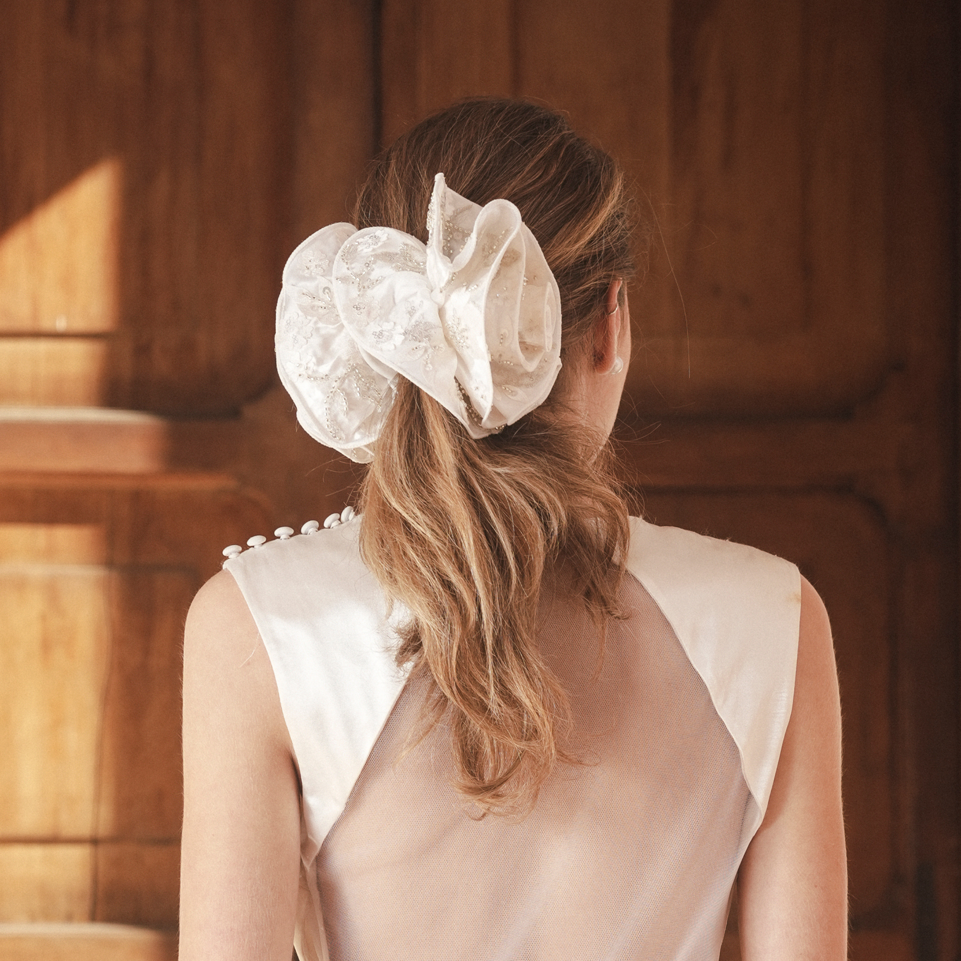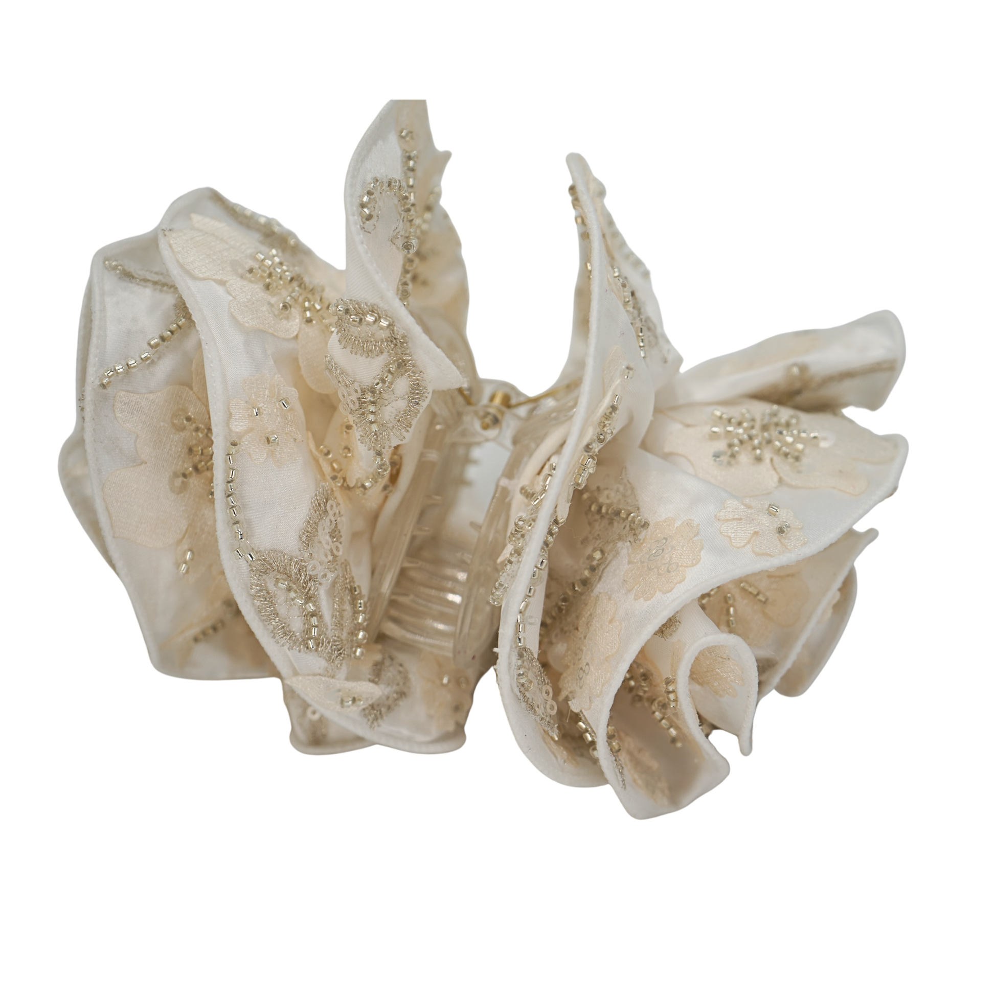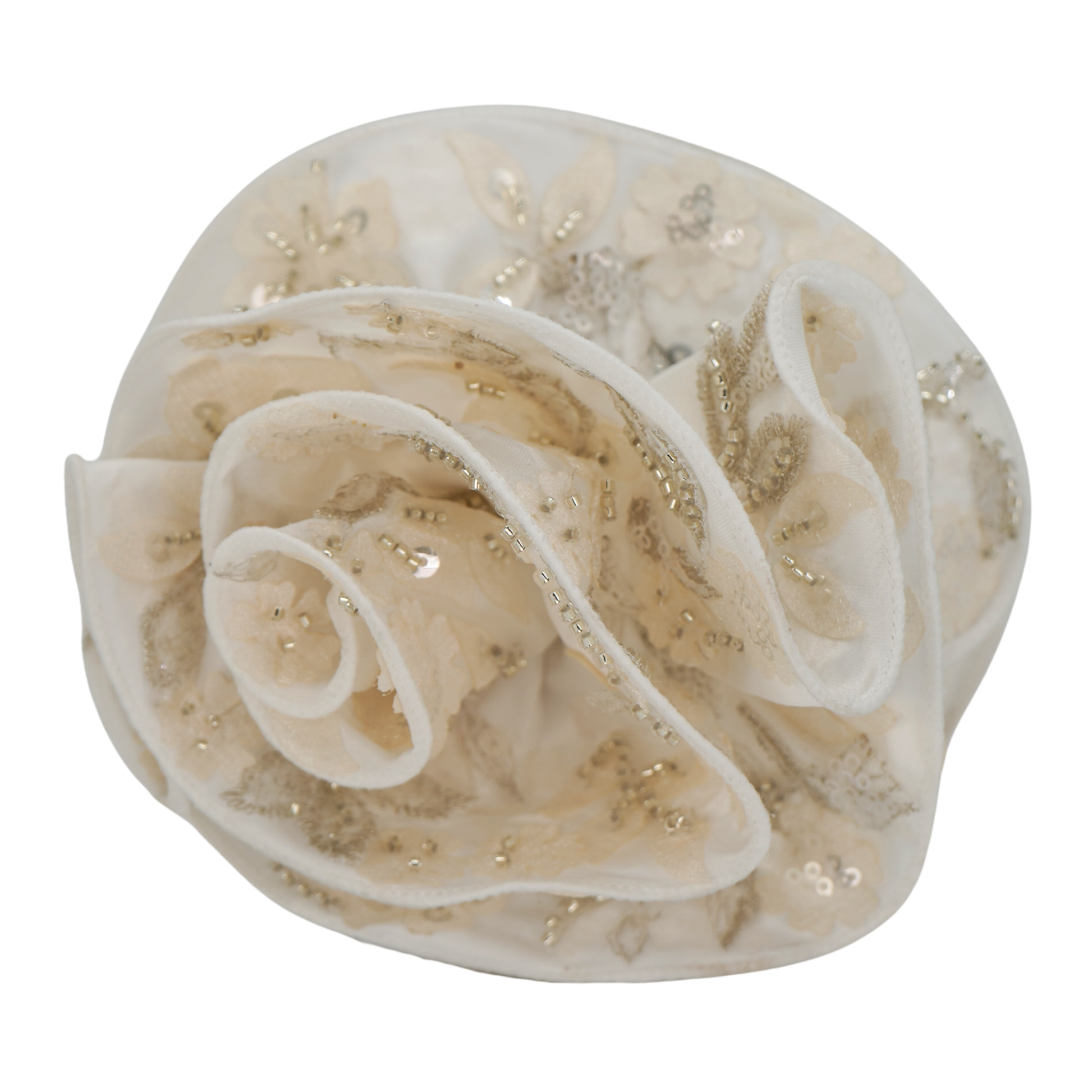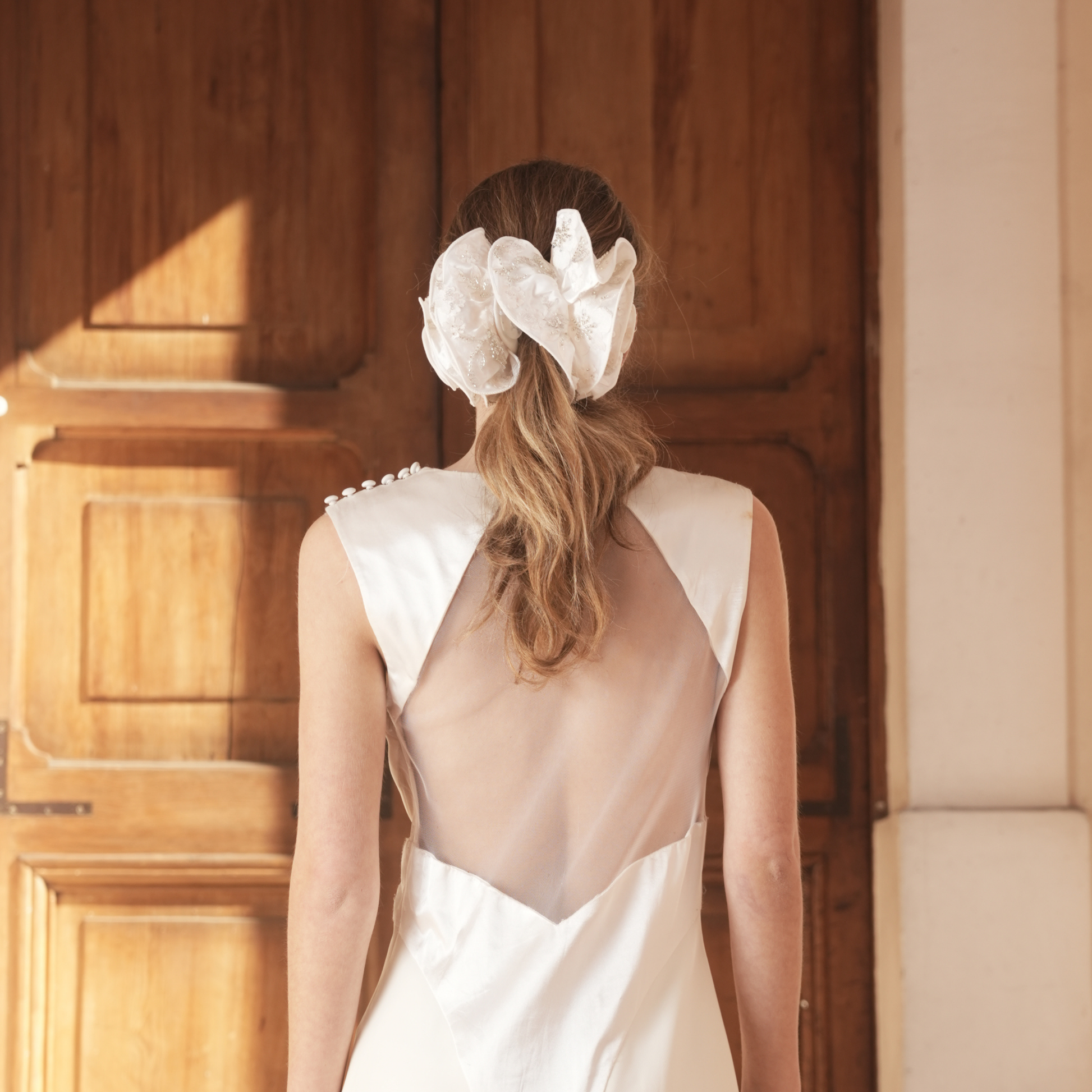 Pin decorado con flores confeccionadas en satén y detalles en pedrería, que aporta un acento delicado y sofisticado al peinado. Ideal para complementar el look de la novia con un toque sutil y luminoso.