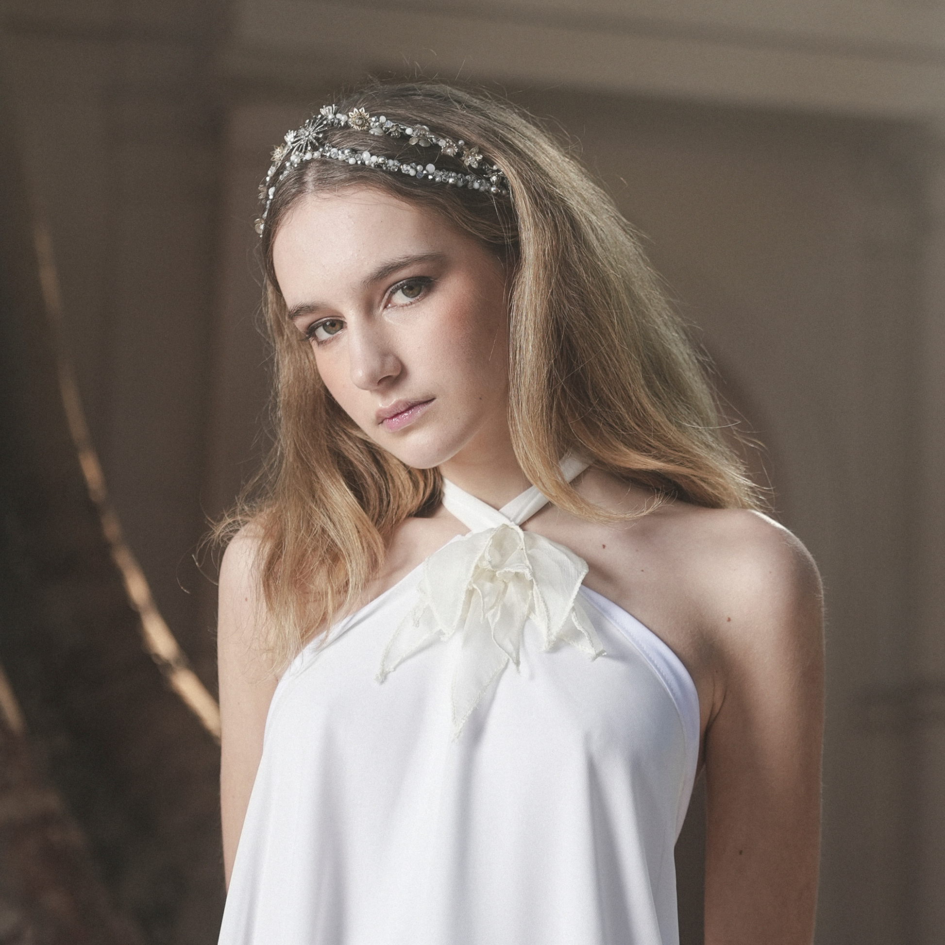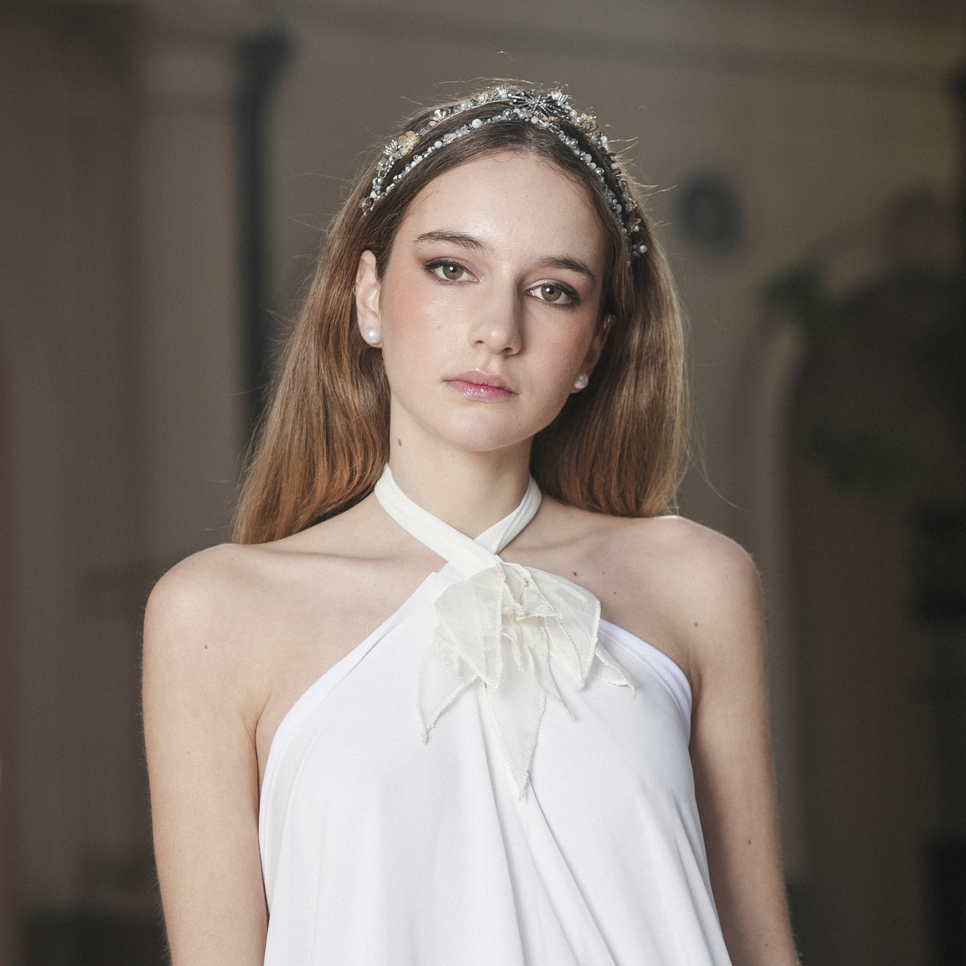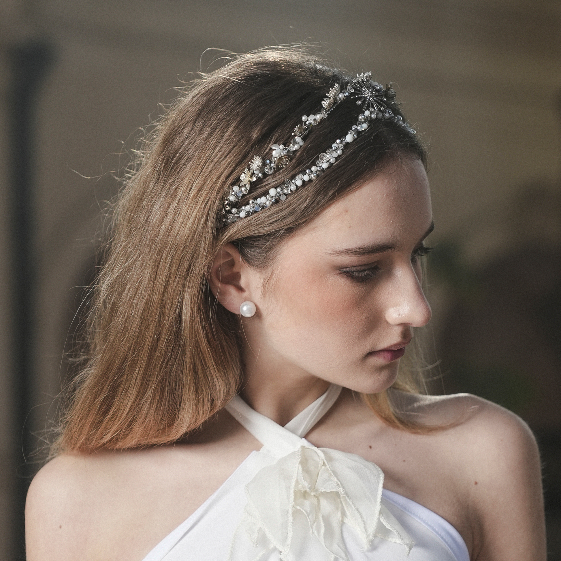 Semi corona doble elaborada con pedrería y flores en tono plateado, bordadas cuidadosamente con alambre. Un accesorio delicado y sofisticado que aporta un toque elegante y luminoso al look nupcial.