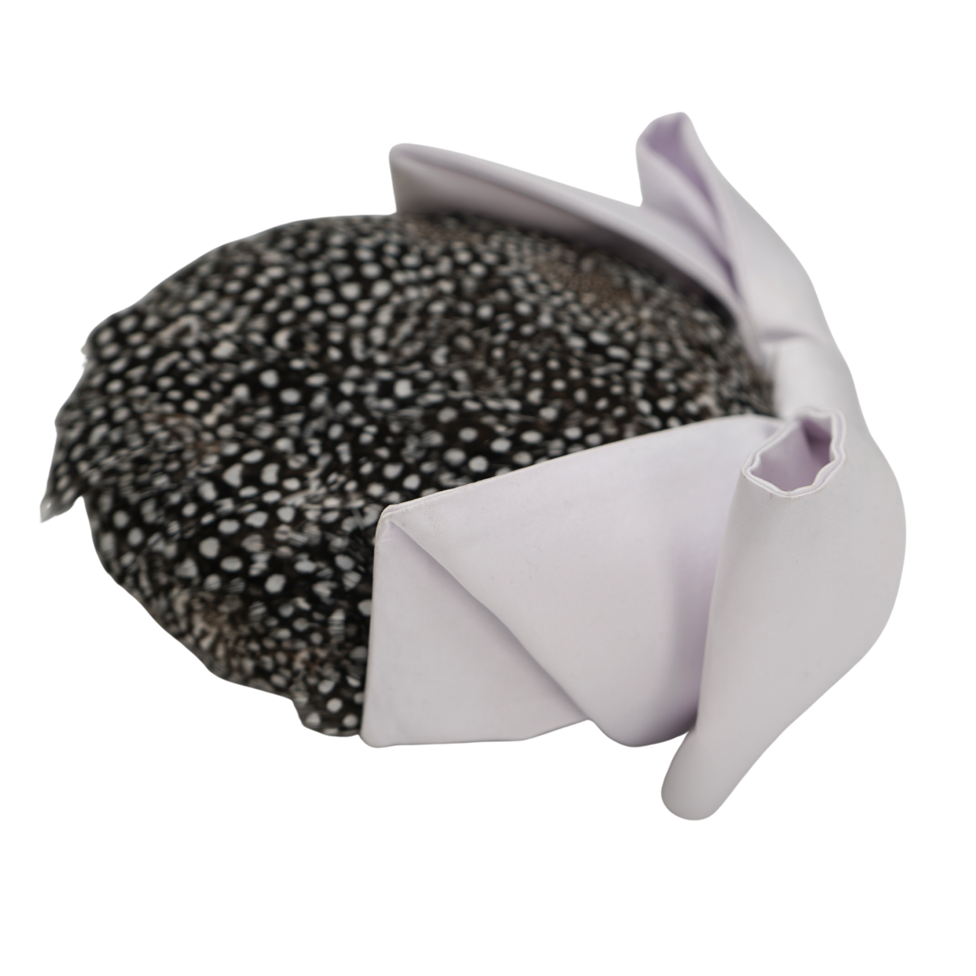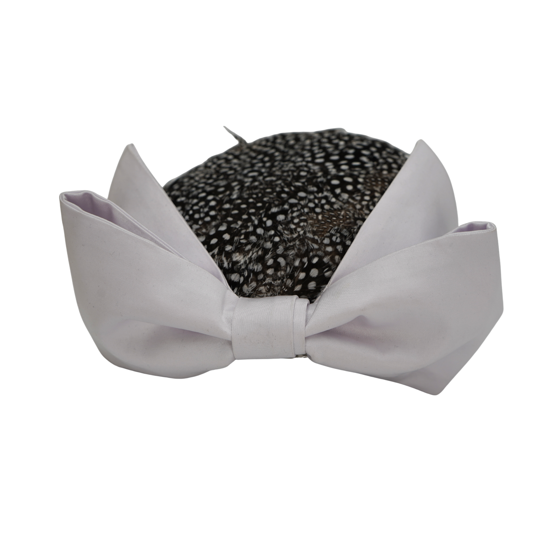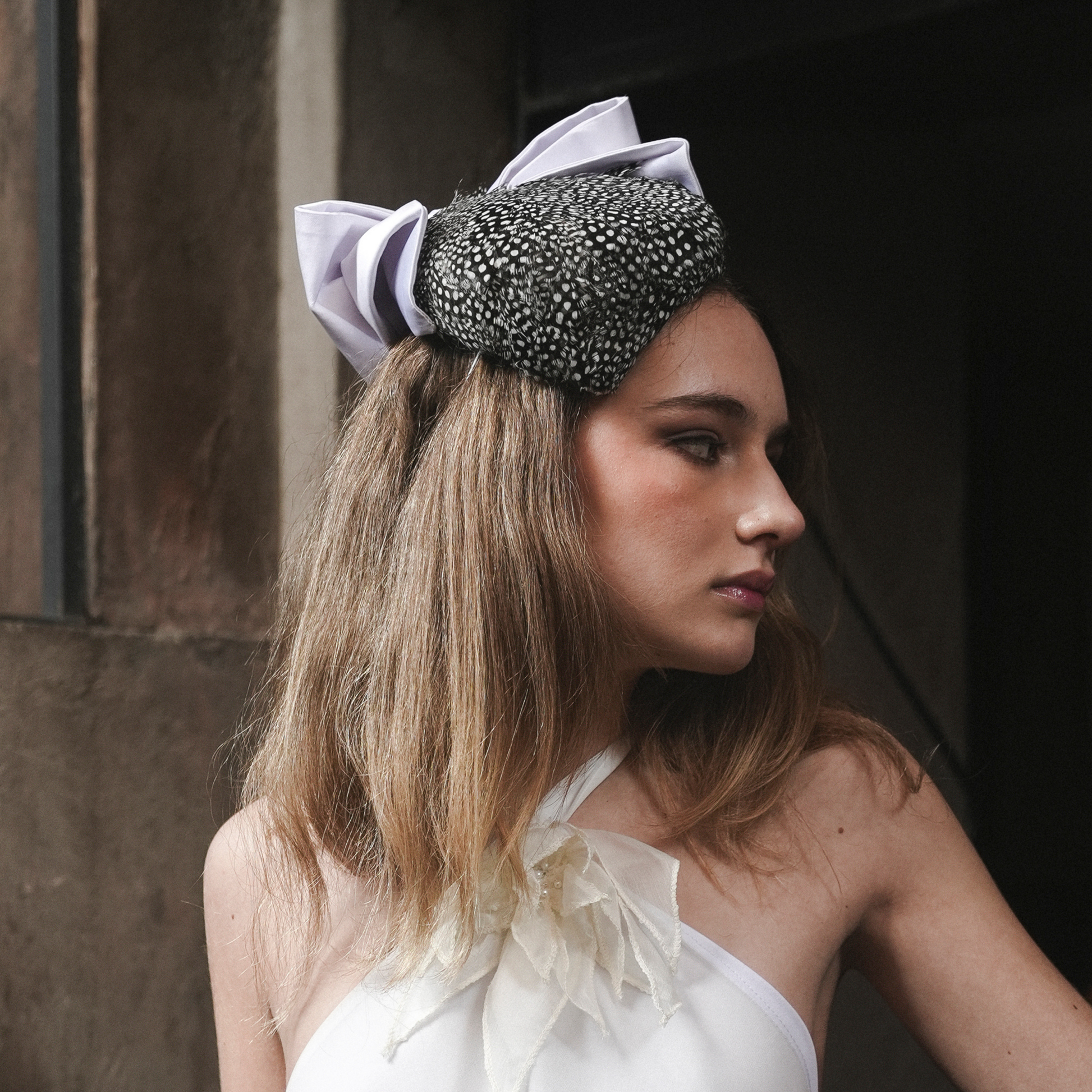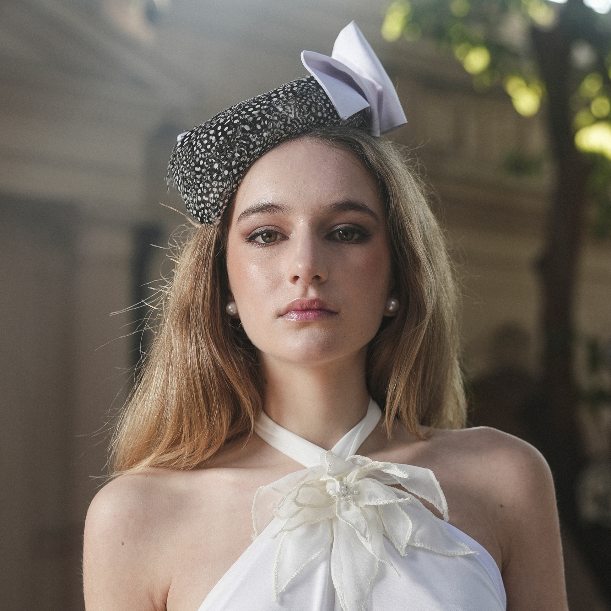 Casquete adornado con plumas blancas y negras, y decorado con un lazo grande en la parte trasera elaborado en seda. Un diseño elegante y sofisticado que aporta carácter y distinción al look nupcial.