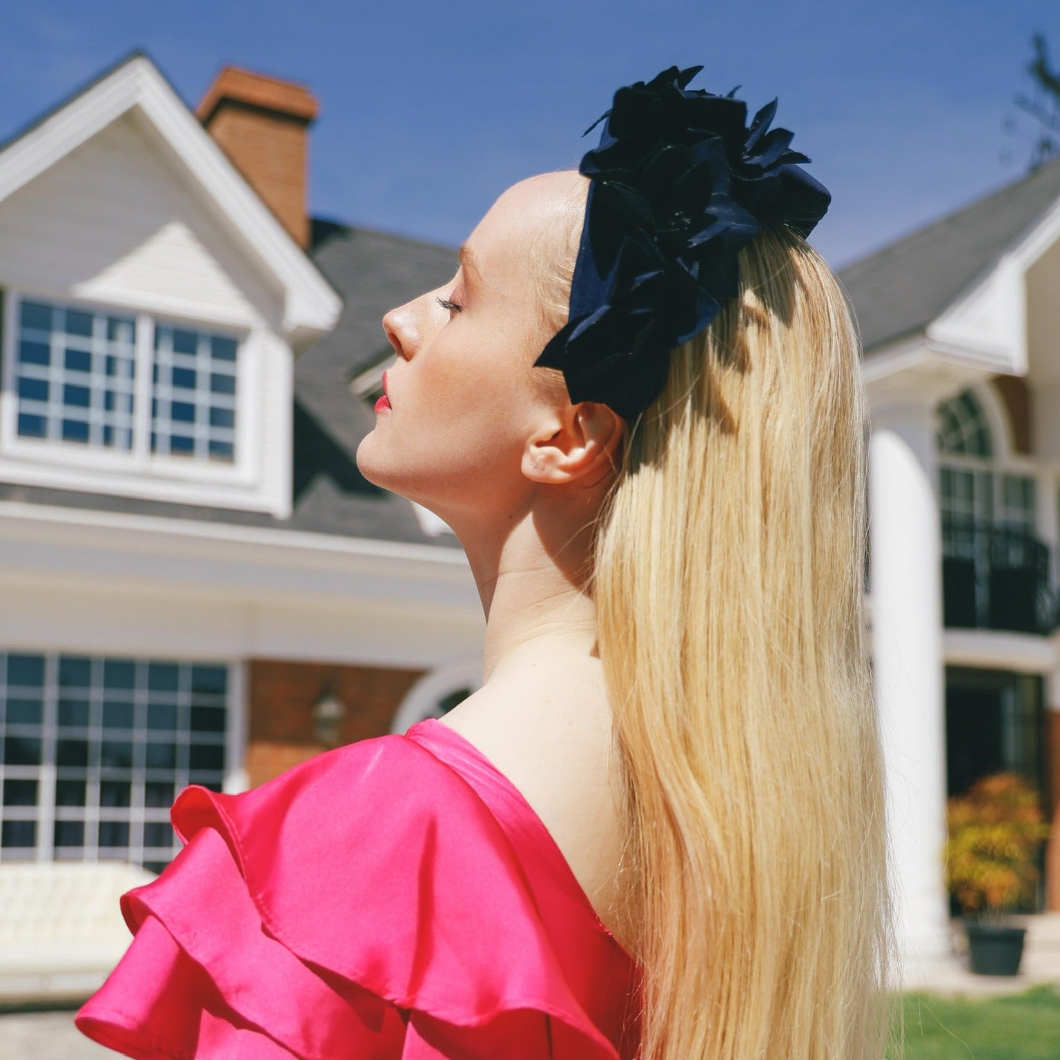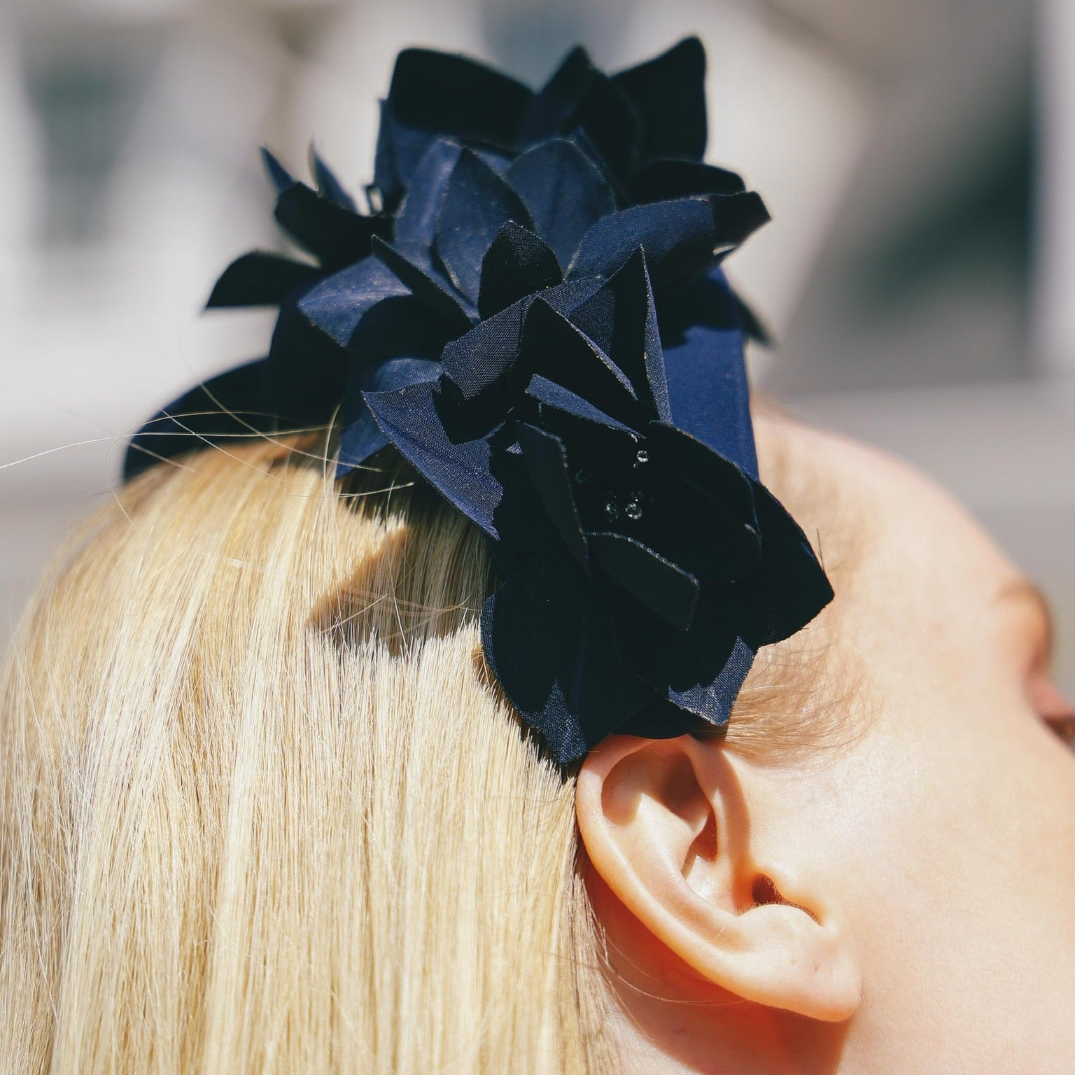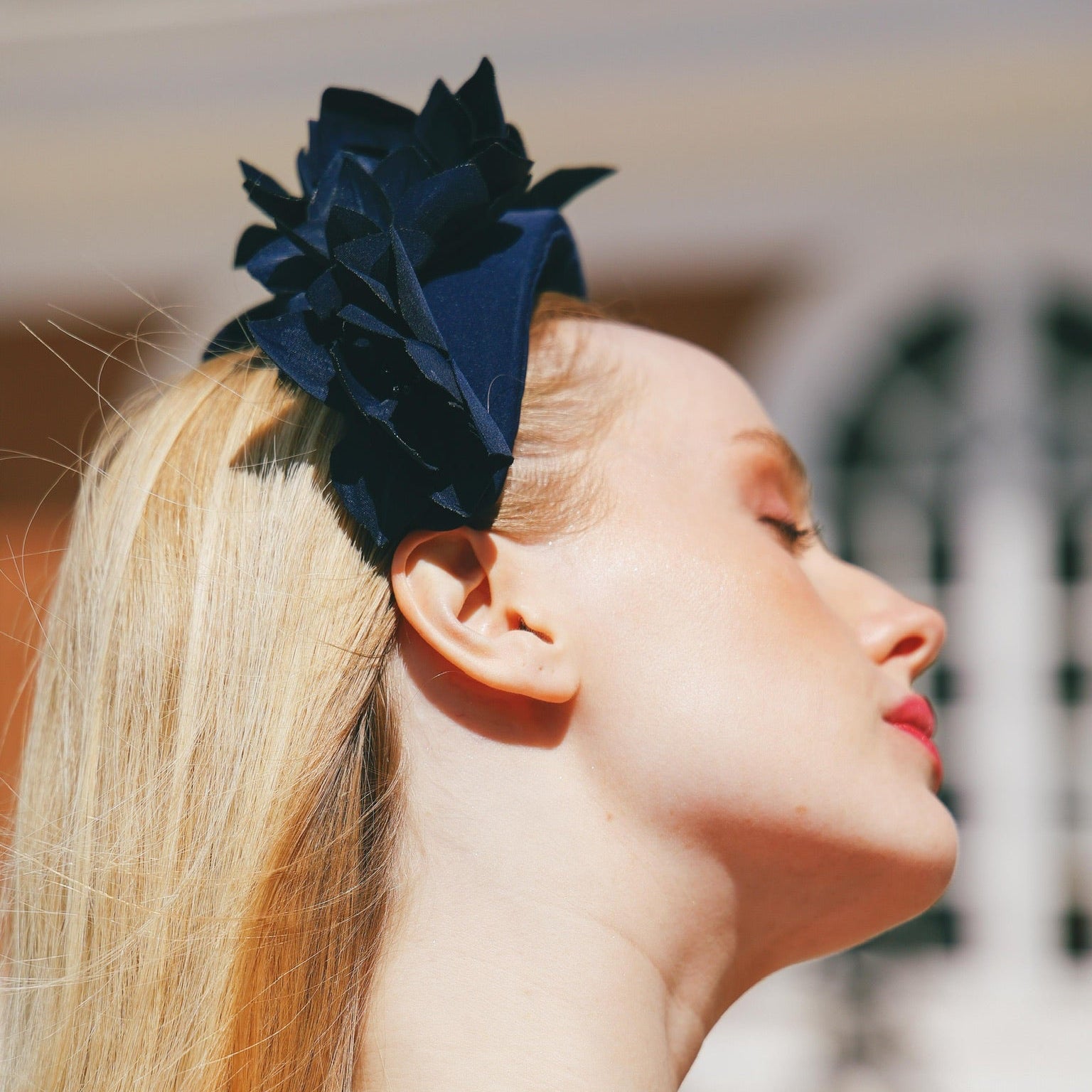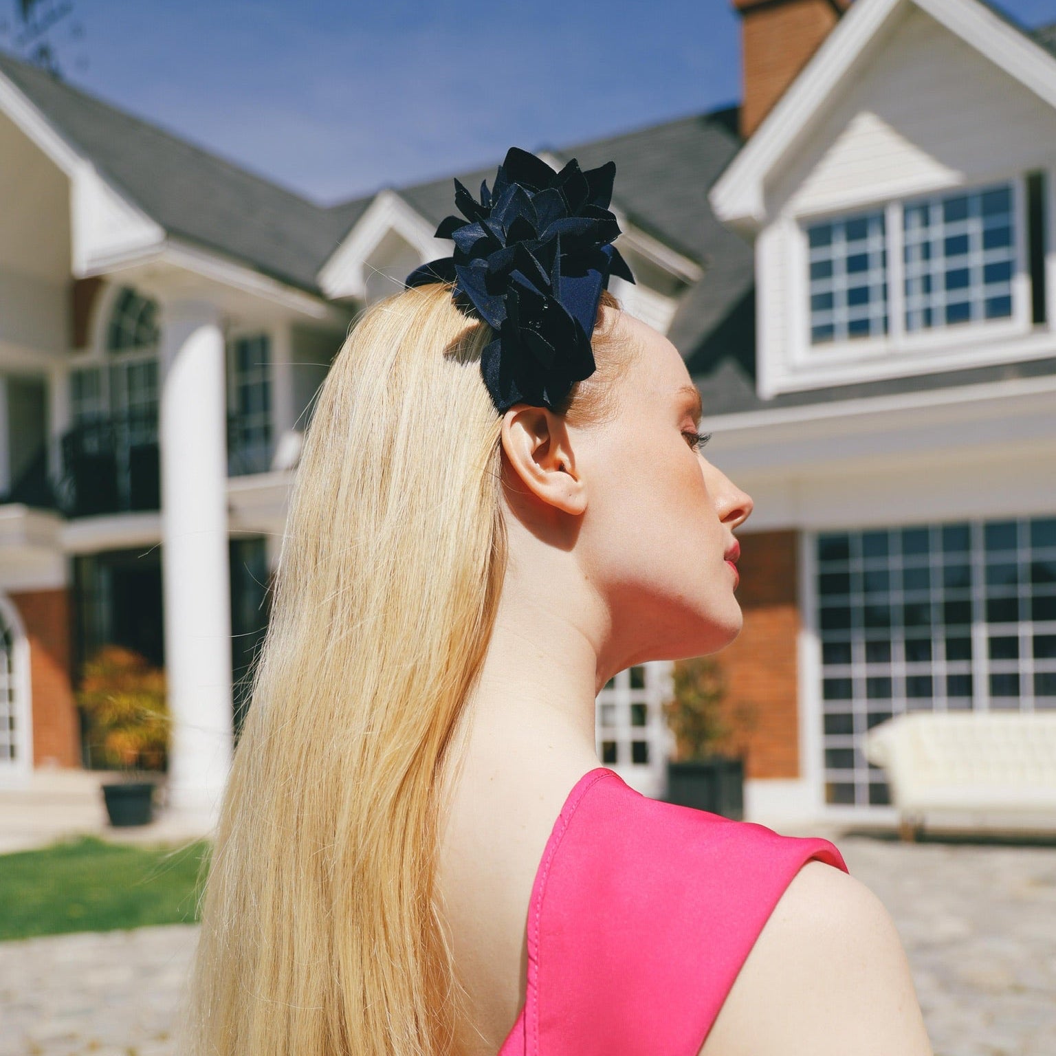 Tocado doble confeccionado en crepé de seda, decorado con flores que aportan un aire romántico y sofisticado. Ideal para complementar peinados en ocasiones especiales, bodas o celebraciones, con un detalle artesanal lleno de encanto.
