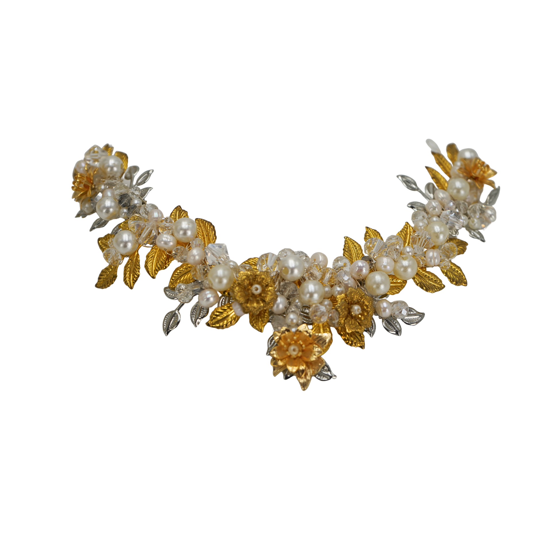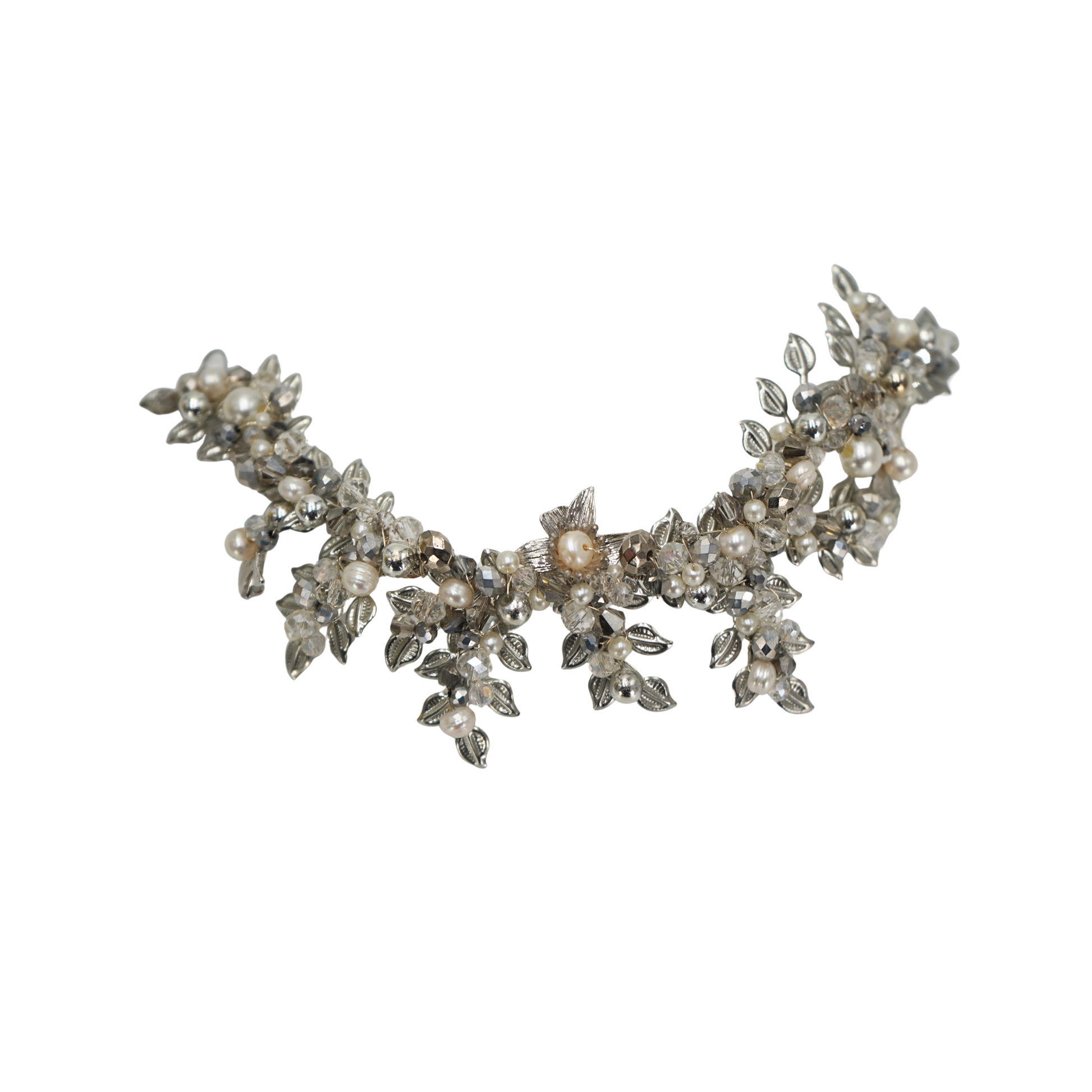 Tiara elaborada con alambre y decorada con flores, hojas y detalles de pedrería. Un diseño delicado y luminoso que aporta un toque romántico y sofisticado al look nupcial.