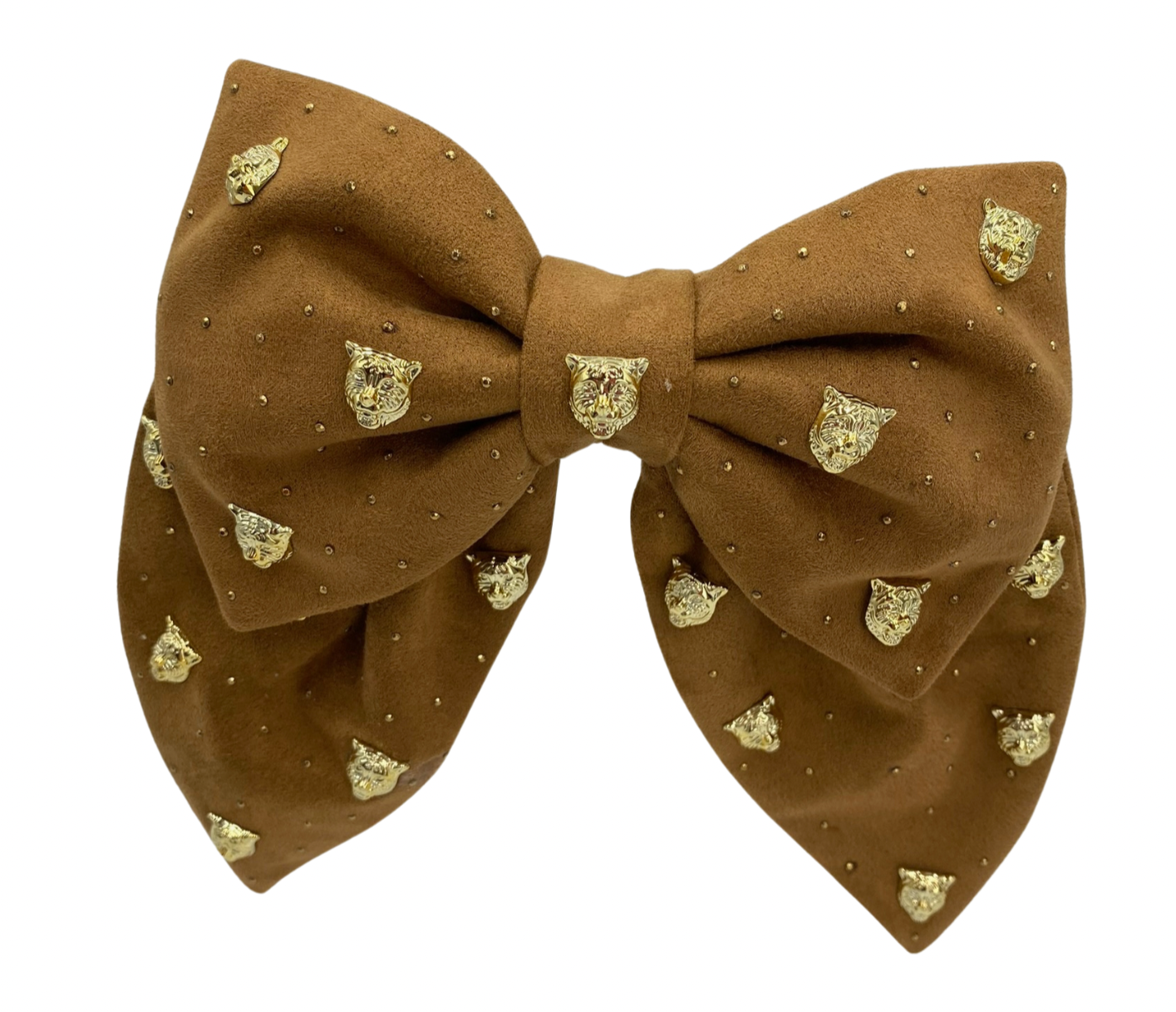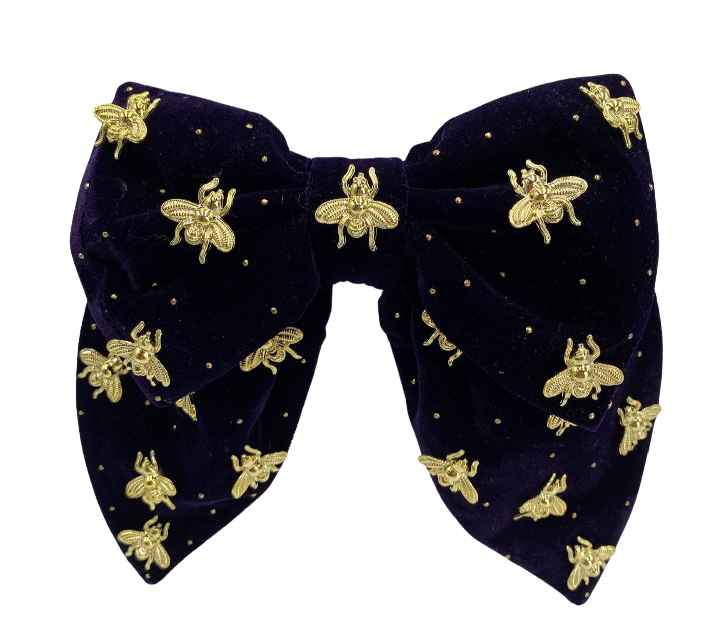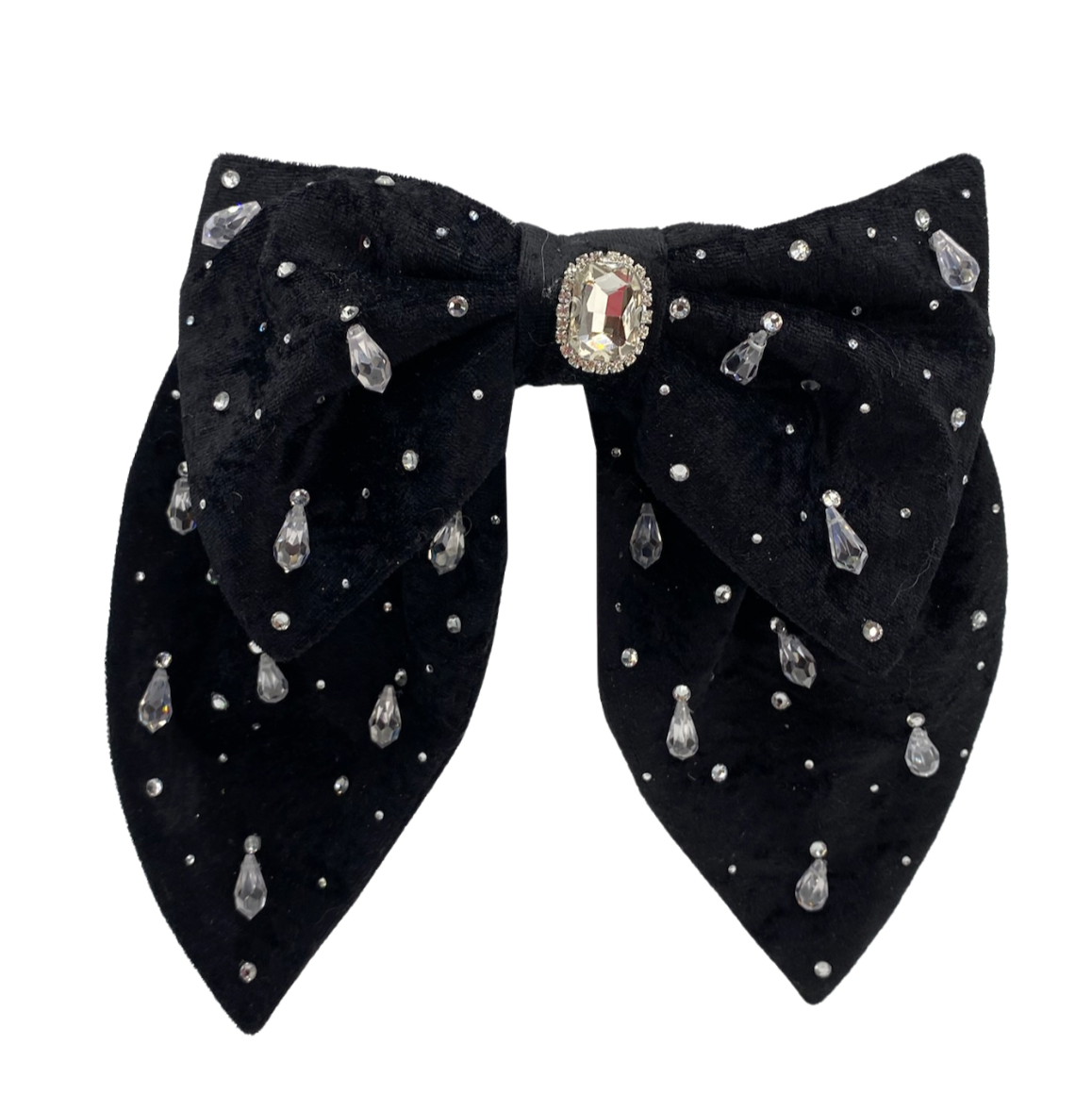 Lazo grande con tiras anchas, confeccionado en terciopelo y adornado con aplicaciones bordadas y detalles de strass, que aportan un toque de sofisticación y brillo al diseño.