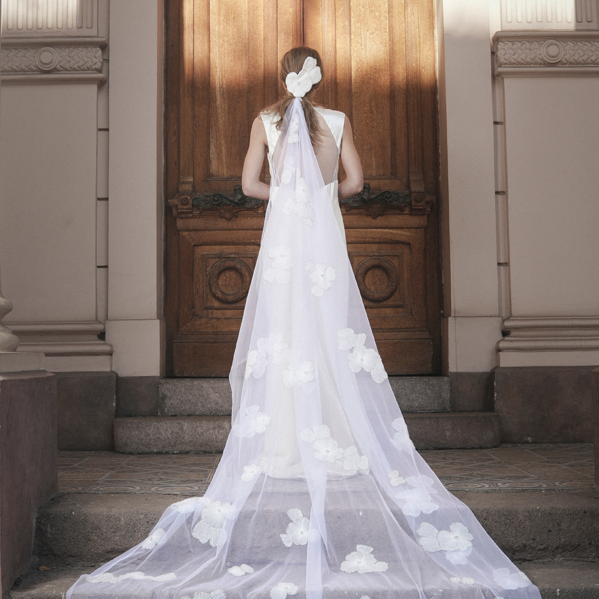 Peineta decorada con una flor grande de pedrería que aporta un toque brillante y sofisticado. El velo liso, adornado con flores a juego, completa el conjunto con elegancia y armonía.