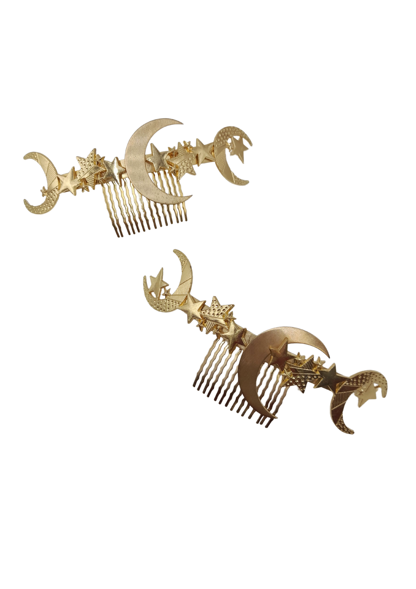 Peinetas doradas decoradas con aplicaciones de estrellas y lunas, que aportan un brillo celestial y sofisticado al peinado.