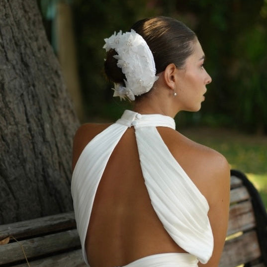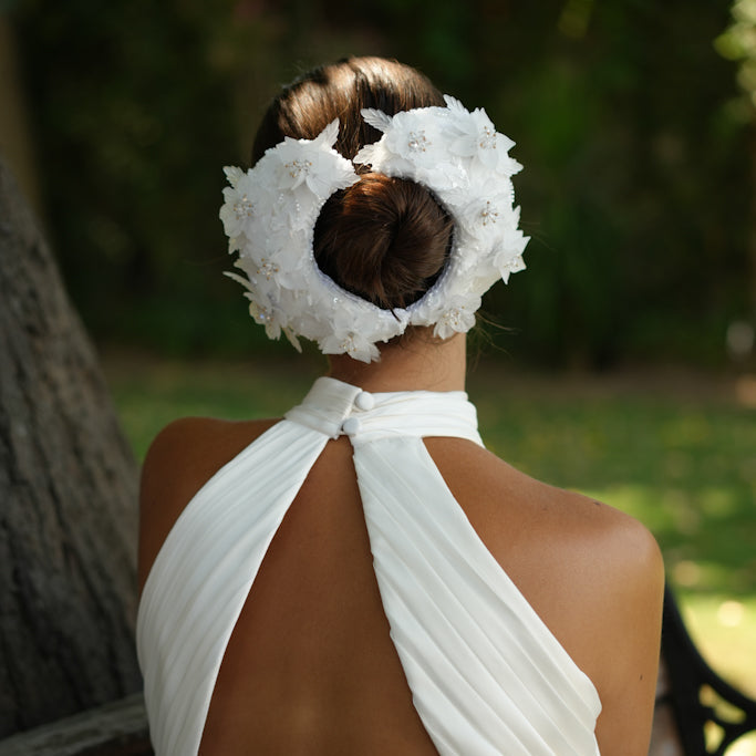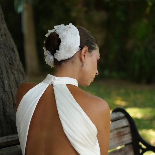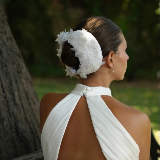 Tocado doble elaborado en crepé de seda, adornado con flores y hojas de acrílico que aportan un contraste sutil entre lo orgánico y lo moderno.
