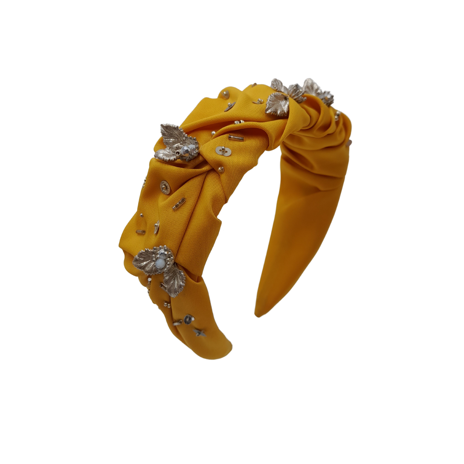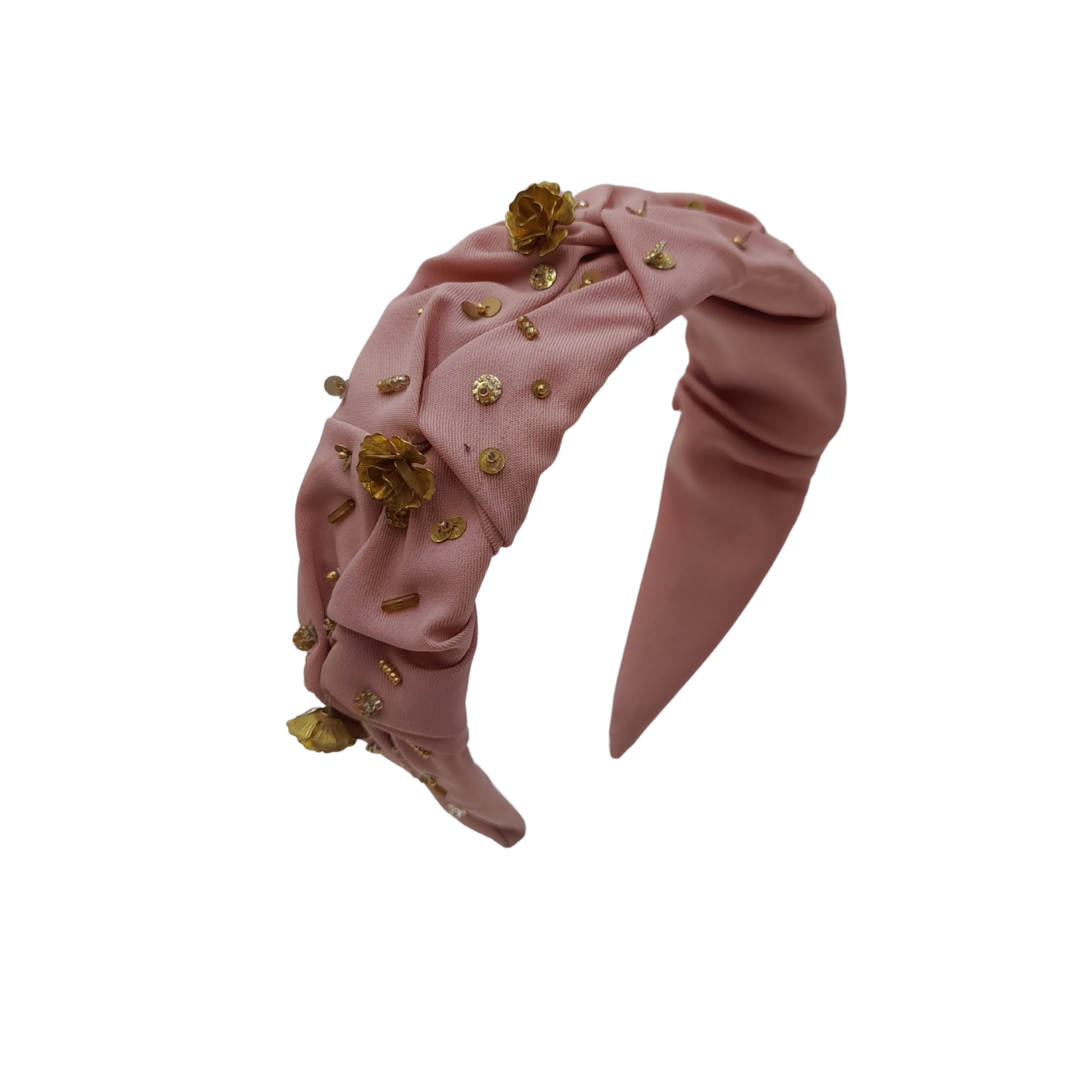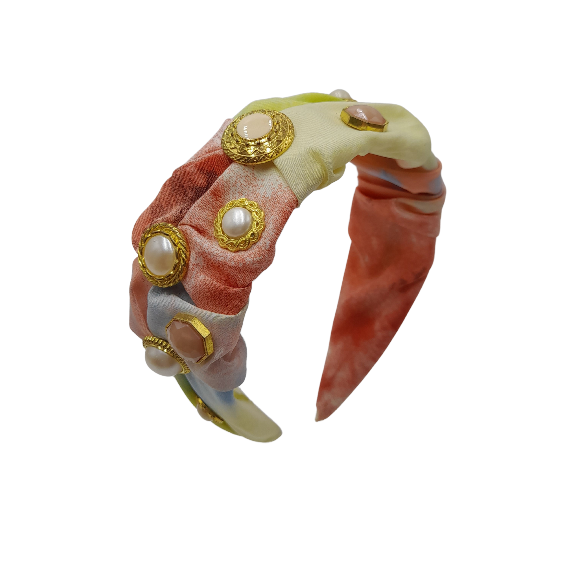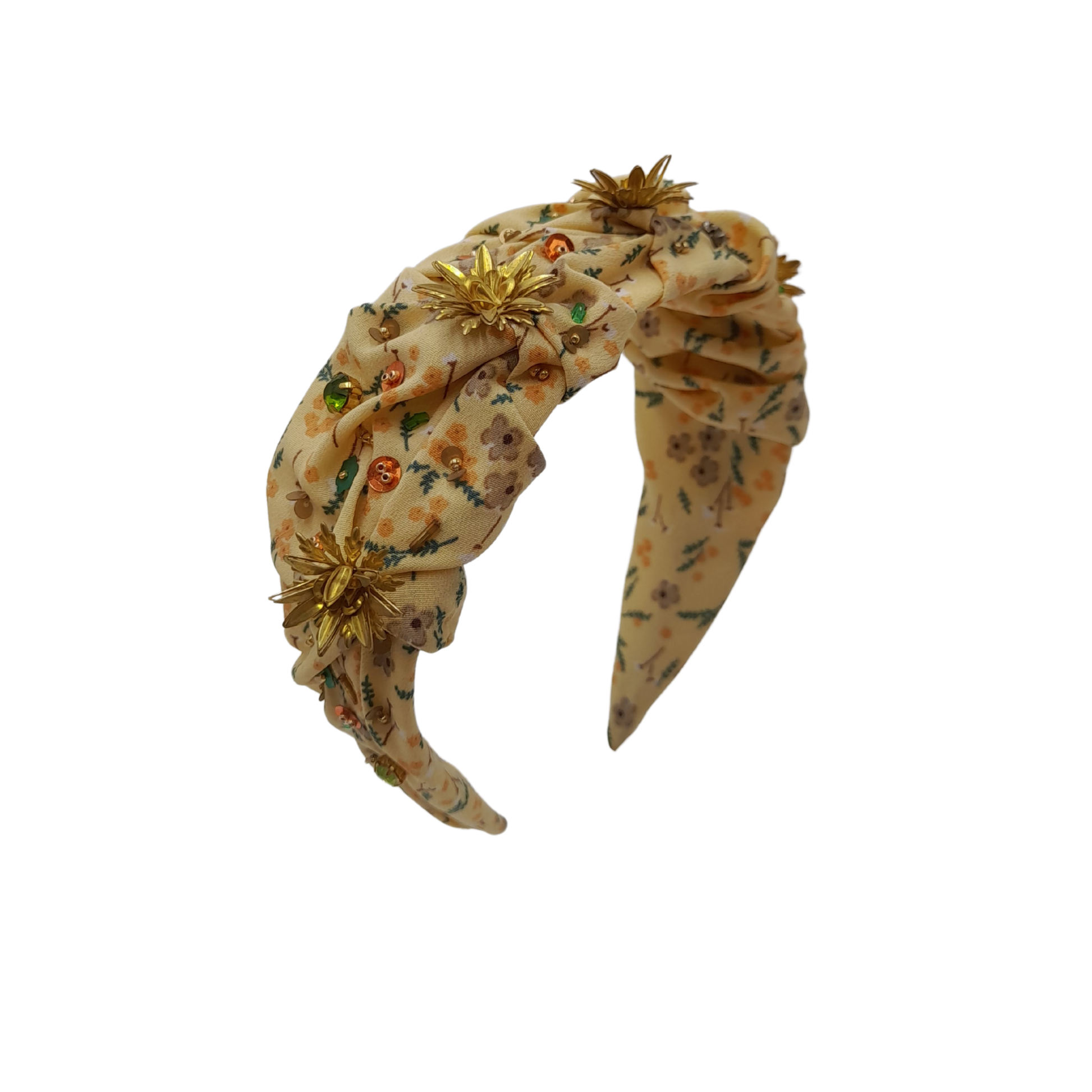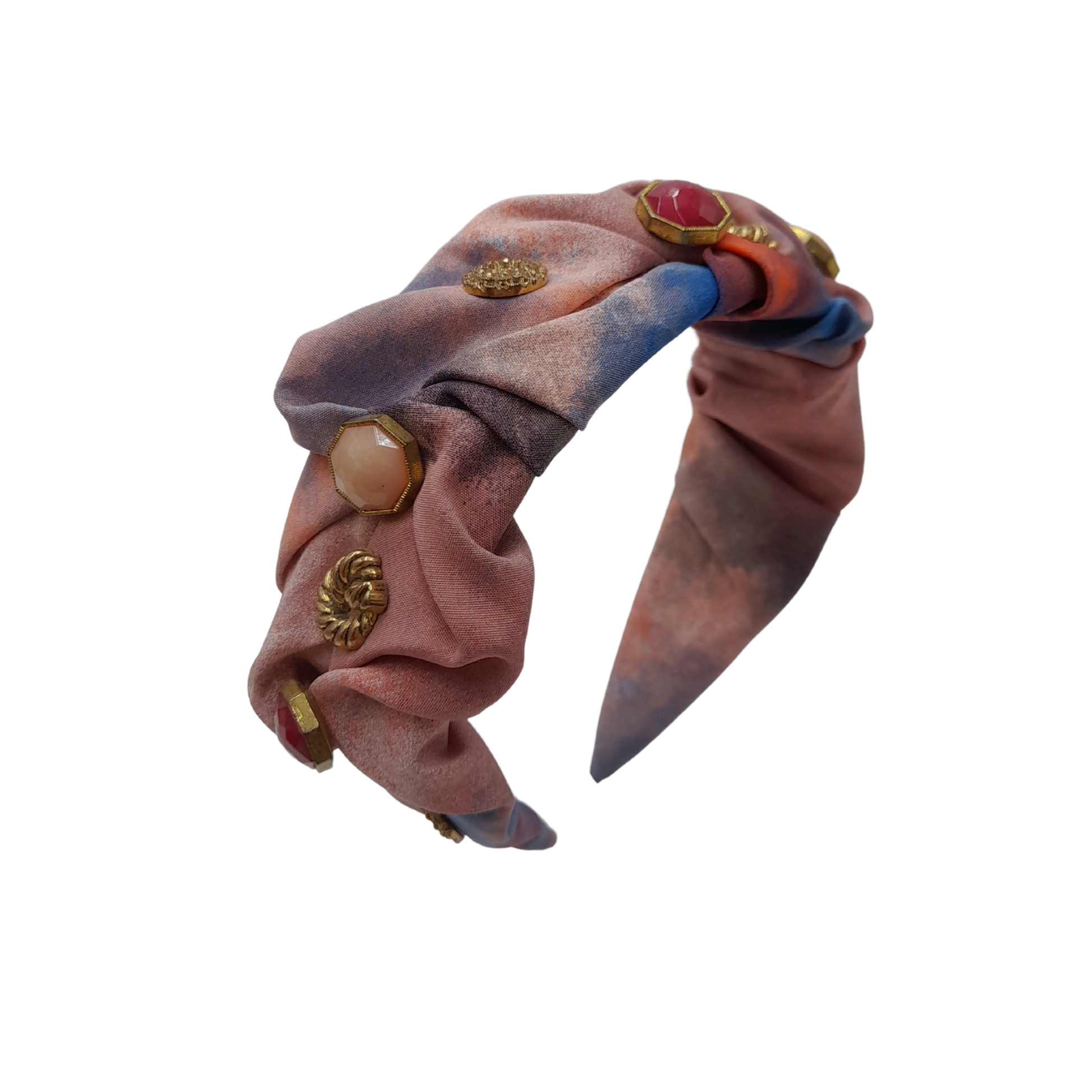 Diadema ancha confeccionada con tela estampada arrugada, adornada con botones, mostacillas, lentejuelas o flores, que combina texturas y detalles vibrantes para aportar un toque único y lleno de estilo a tu look.