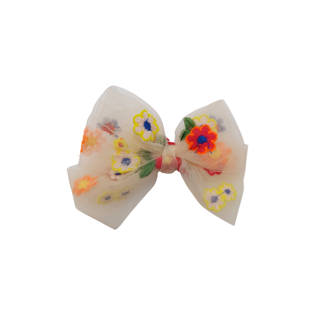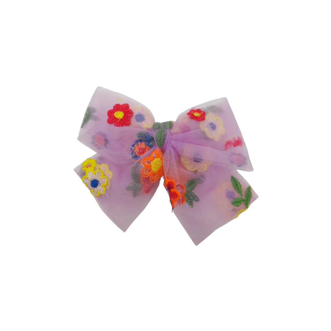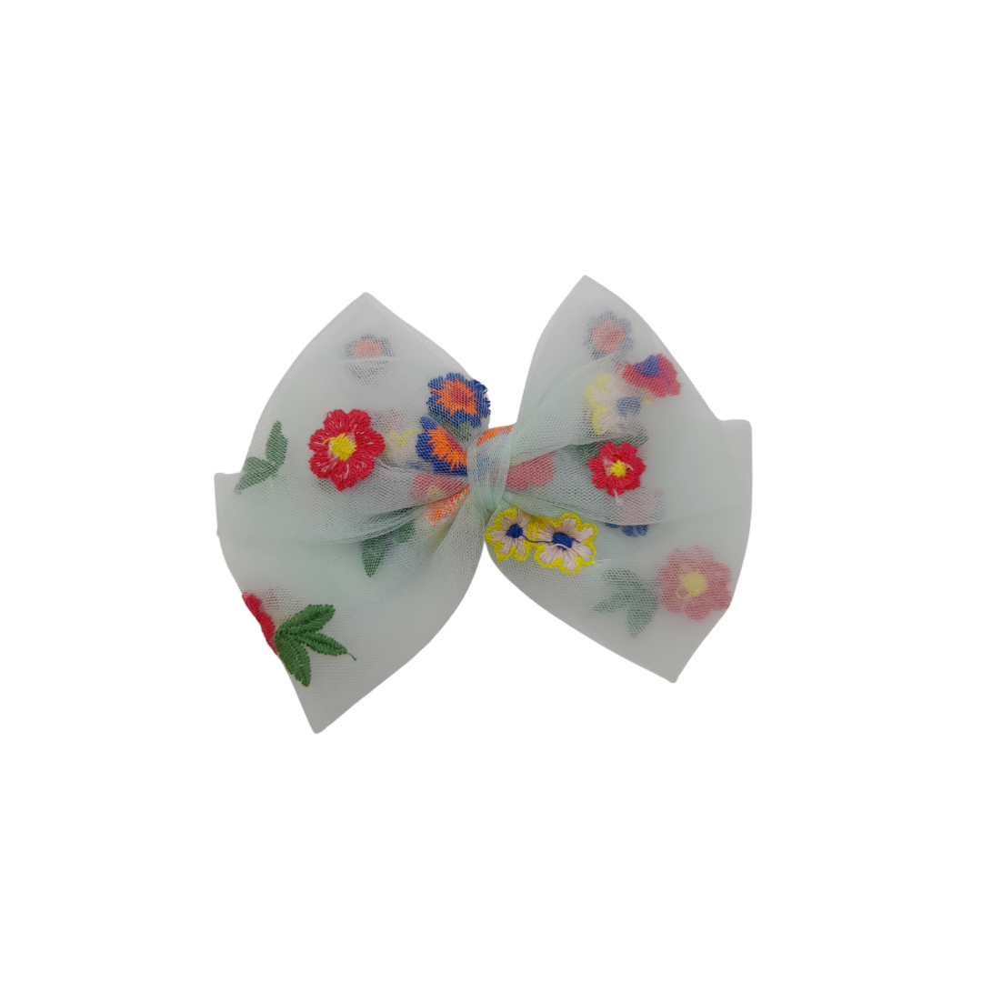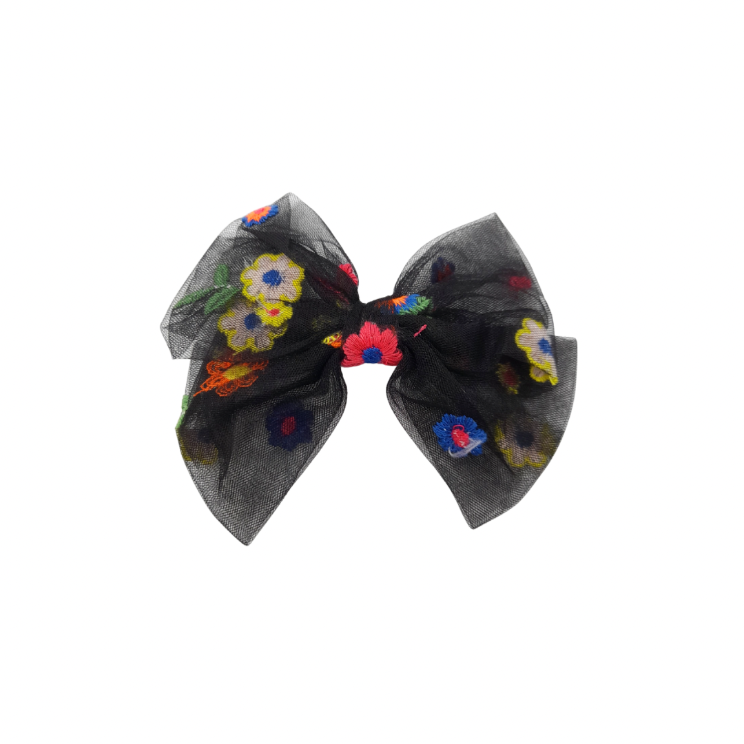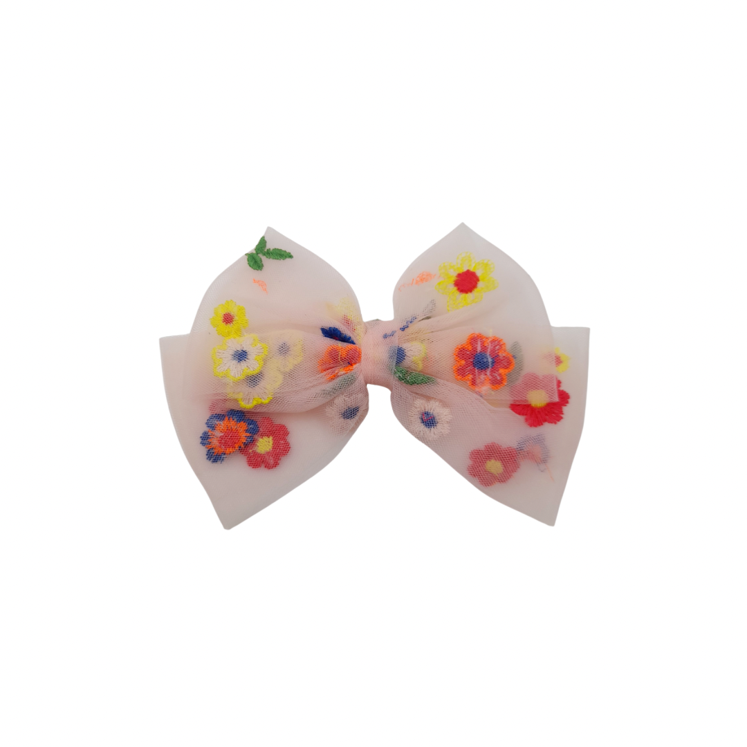 Lazo de tul con flores bordadas en diversos tonos, montado sobre una traba para una sujeción fácil y segura. Un detalle delicado y lleno de color para realzar cualquier peinado.