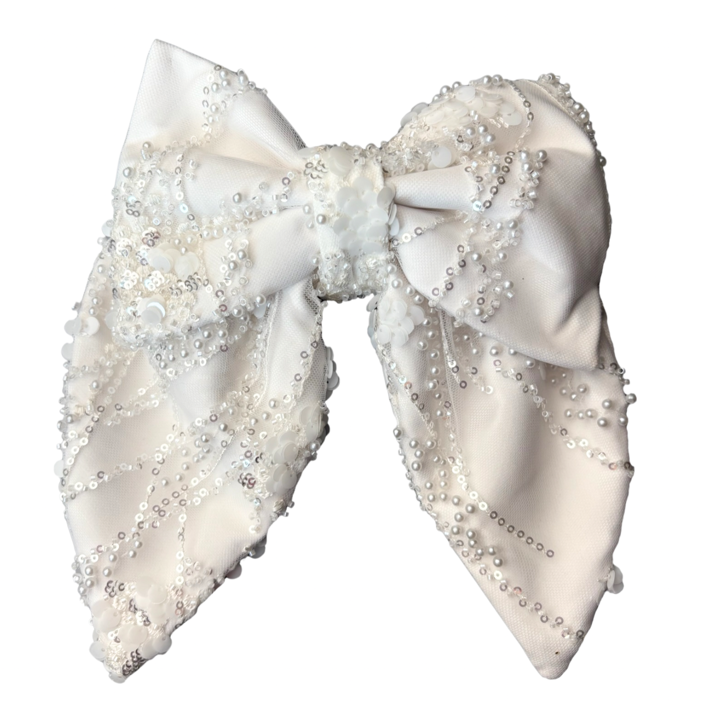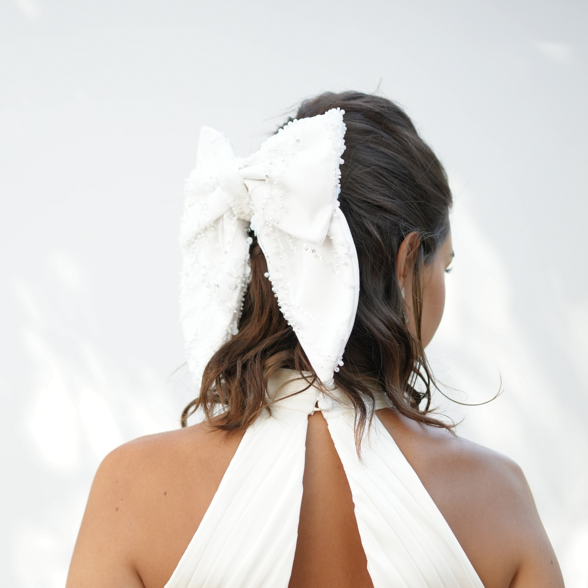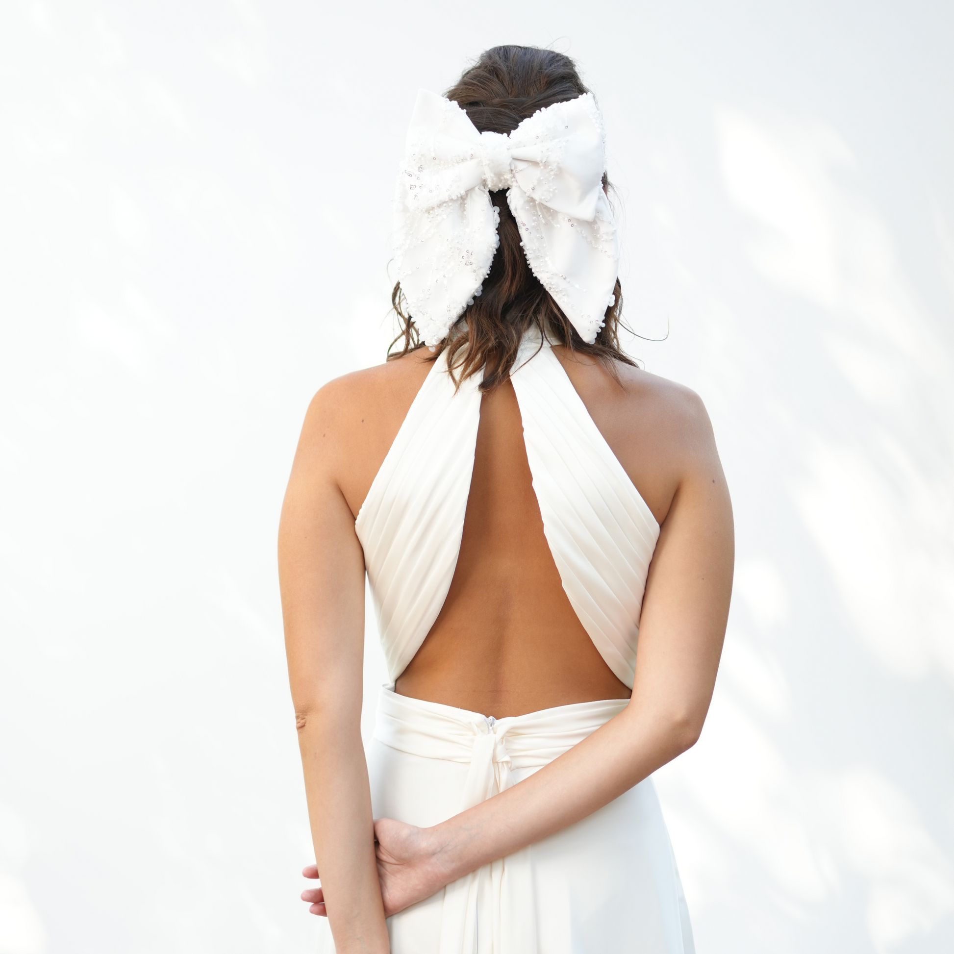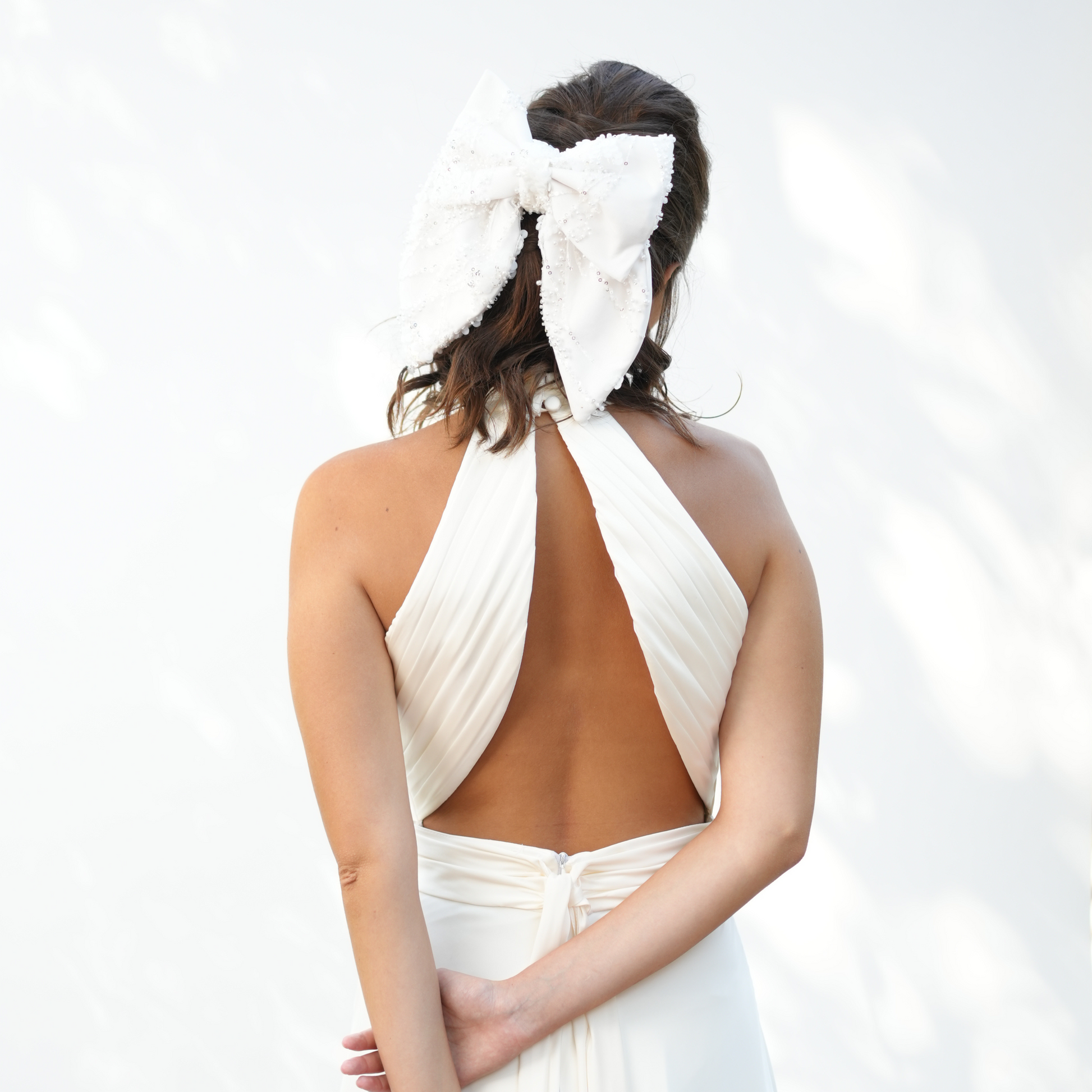 Traba con lazo en crepé de seda, adornada con pedrería que aporta un toque de brillo y sofisticación.
