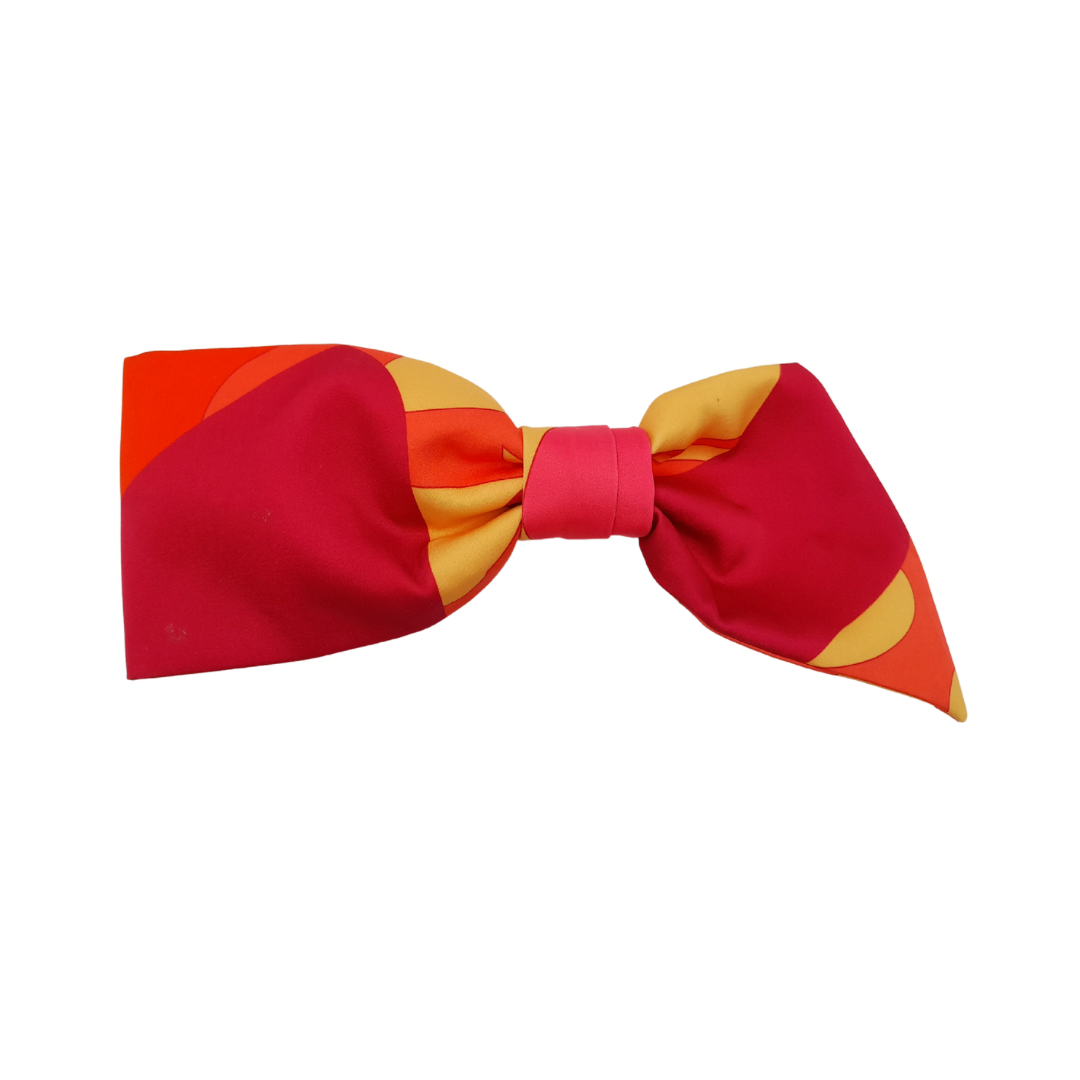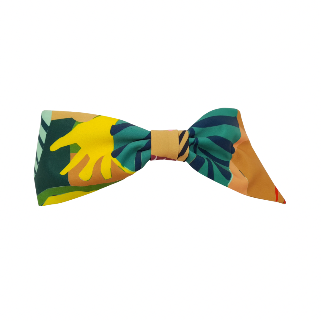 Traba con medio lazo, confeccionada en crepé de seda y tela estampada, que combina suavidad y estilo en un diseño delicado y femenino. Perfecta para dar un toque de color y elegancia a cualquier peinado