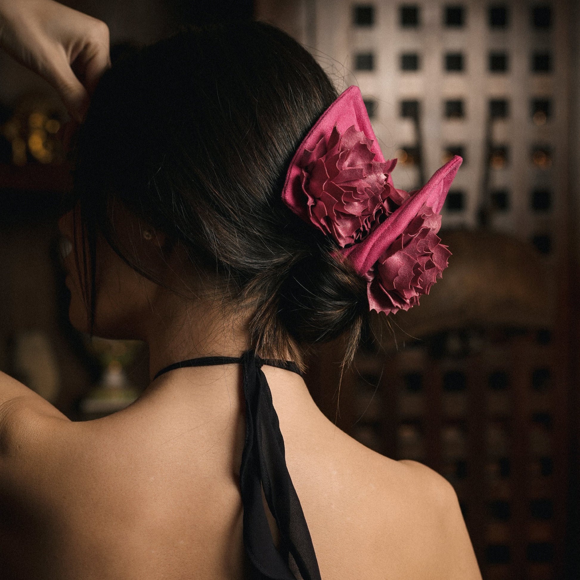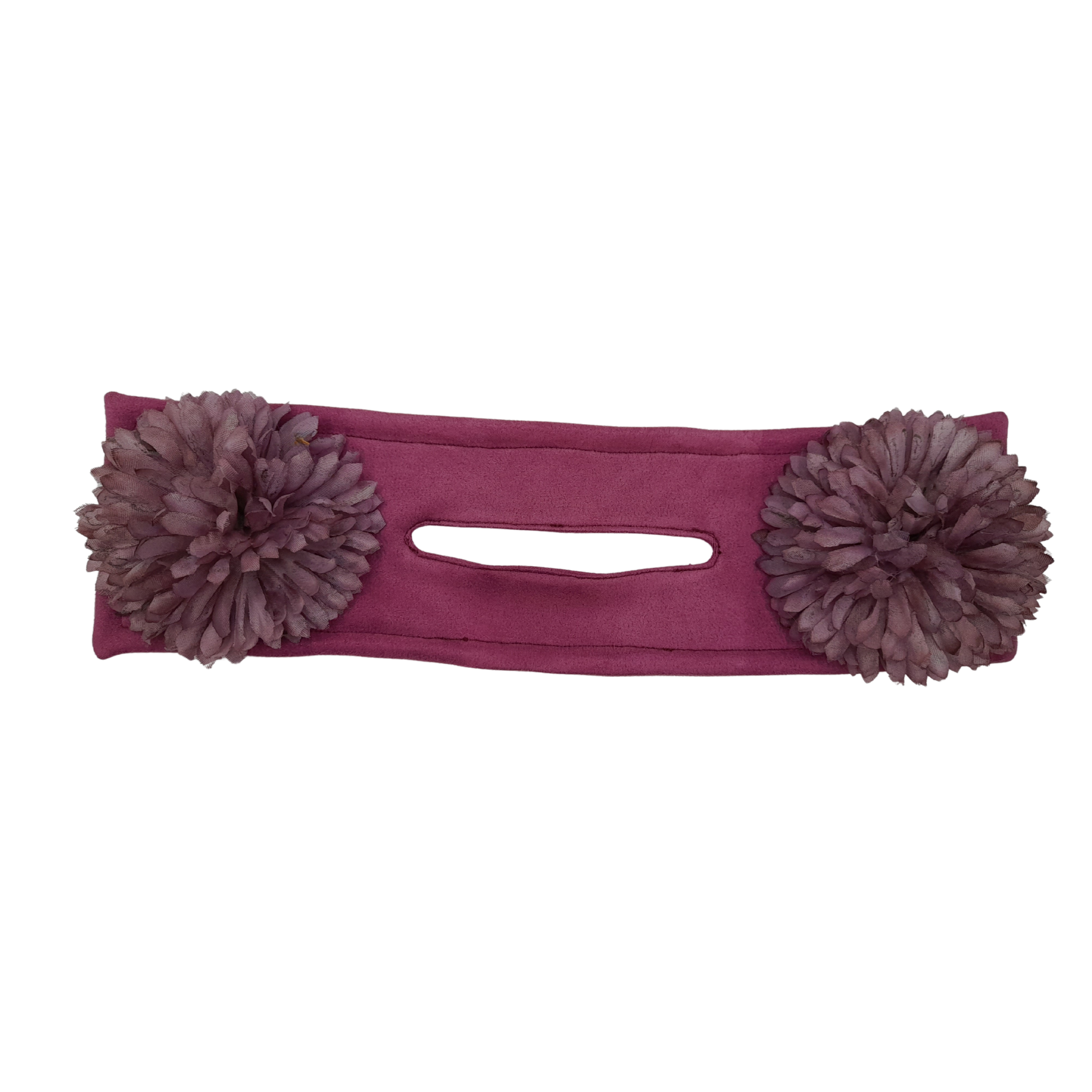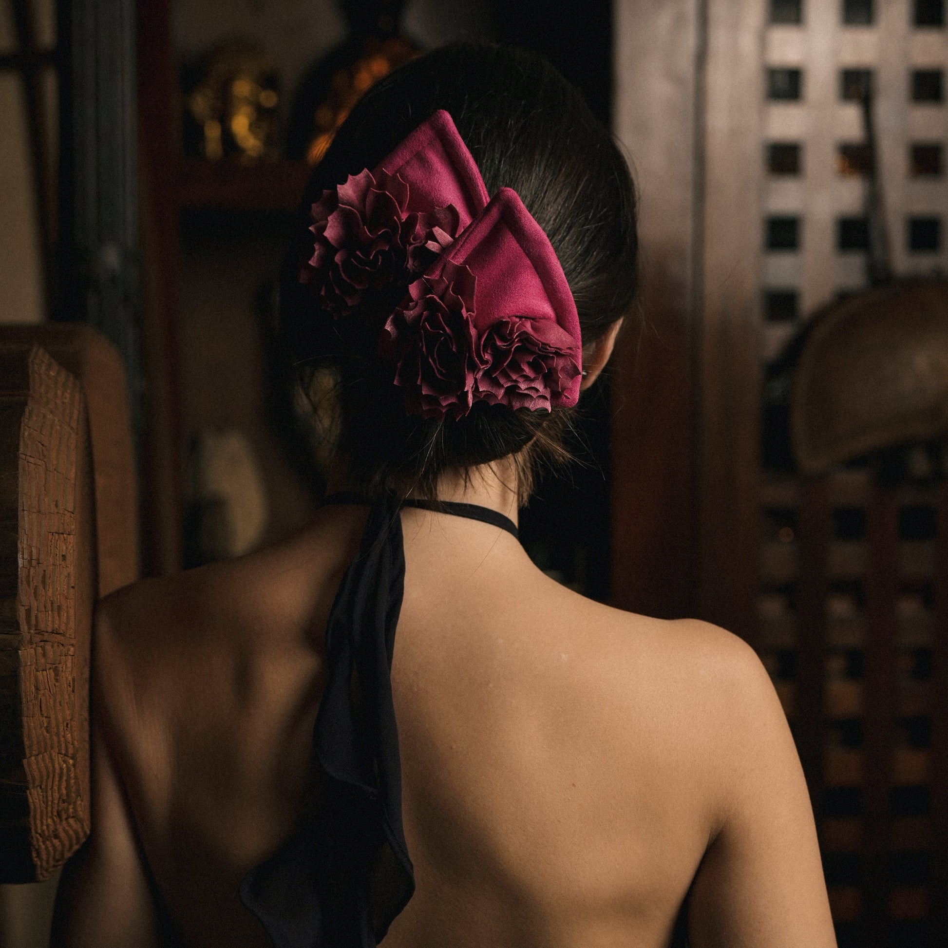 Colet con abertura central y alambre interno que permite moldearlo con facilidad, confeccionado en gamuza y adornado con flores, ideal para crear peinados con un toque creativo, femenino y delicado.
