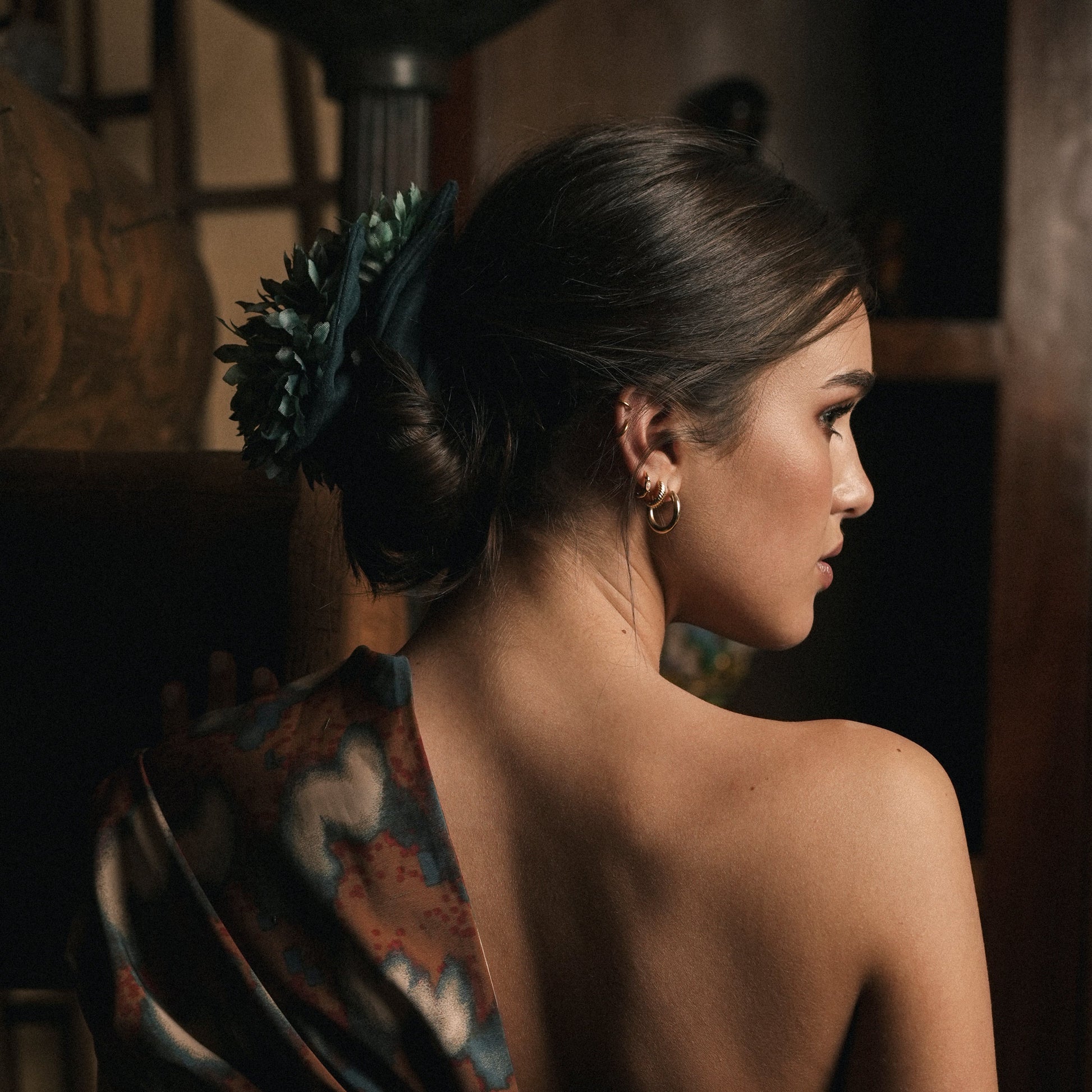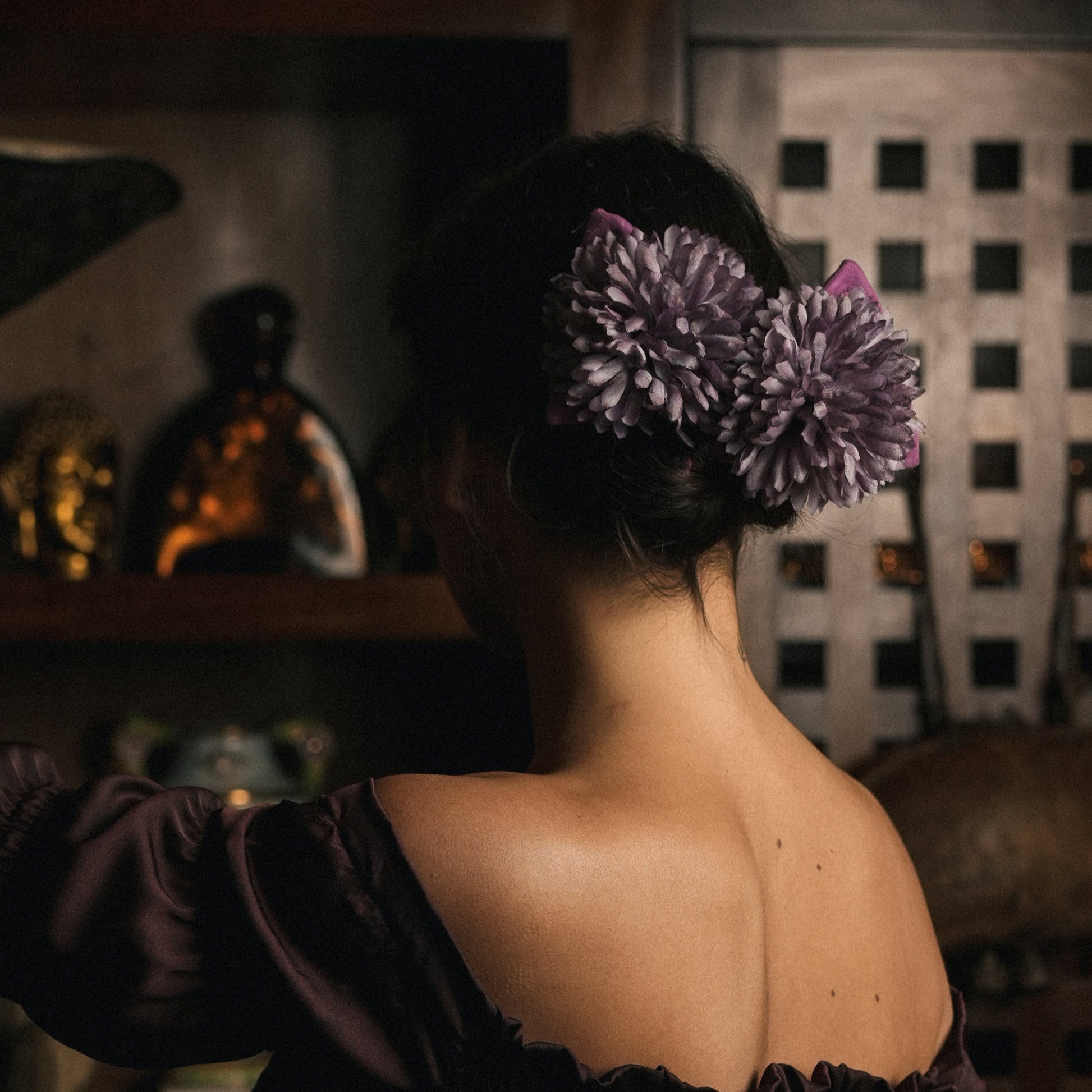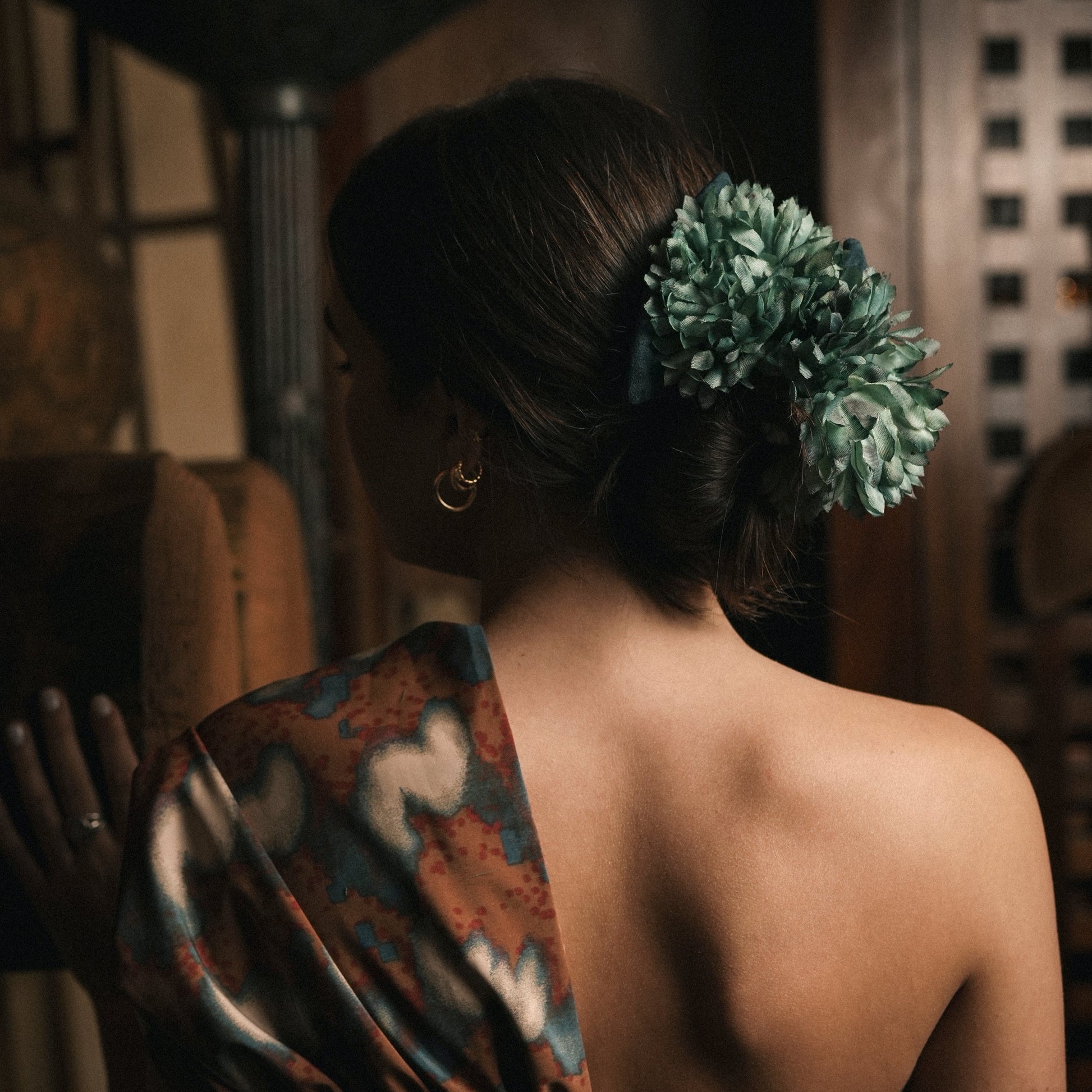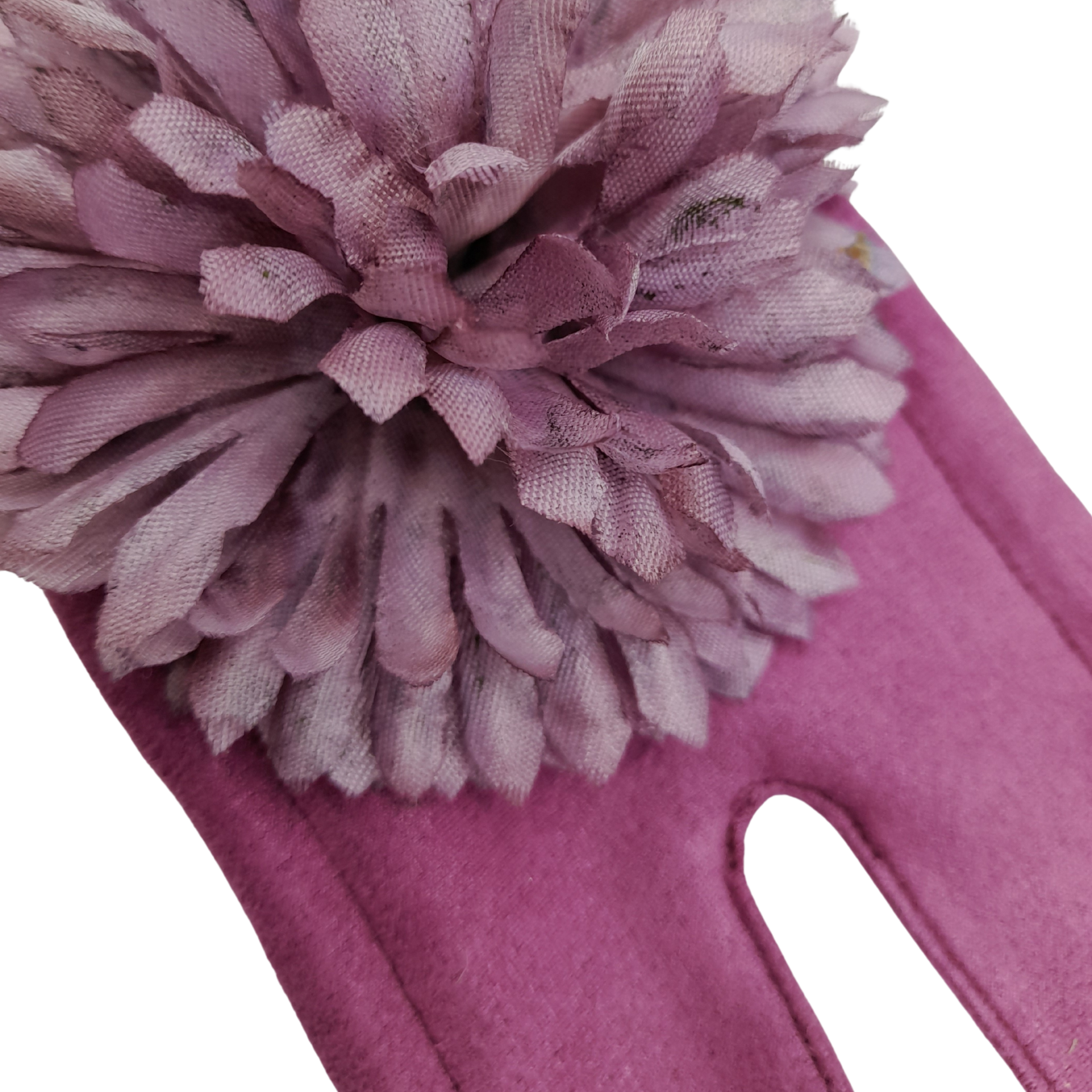 Colet con abertura central y alambre interno que permite moldearlo con facilidad, confeccionado en gamuza y adornado con flores, ideal para crear peinados con un toque creativo, femenino y delicado.
