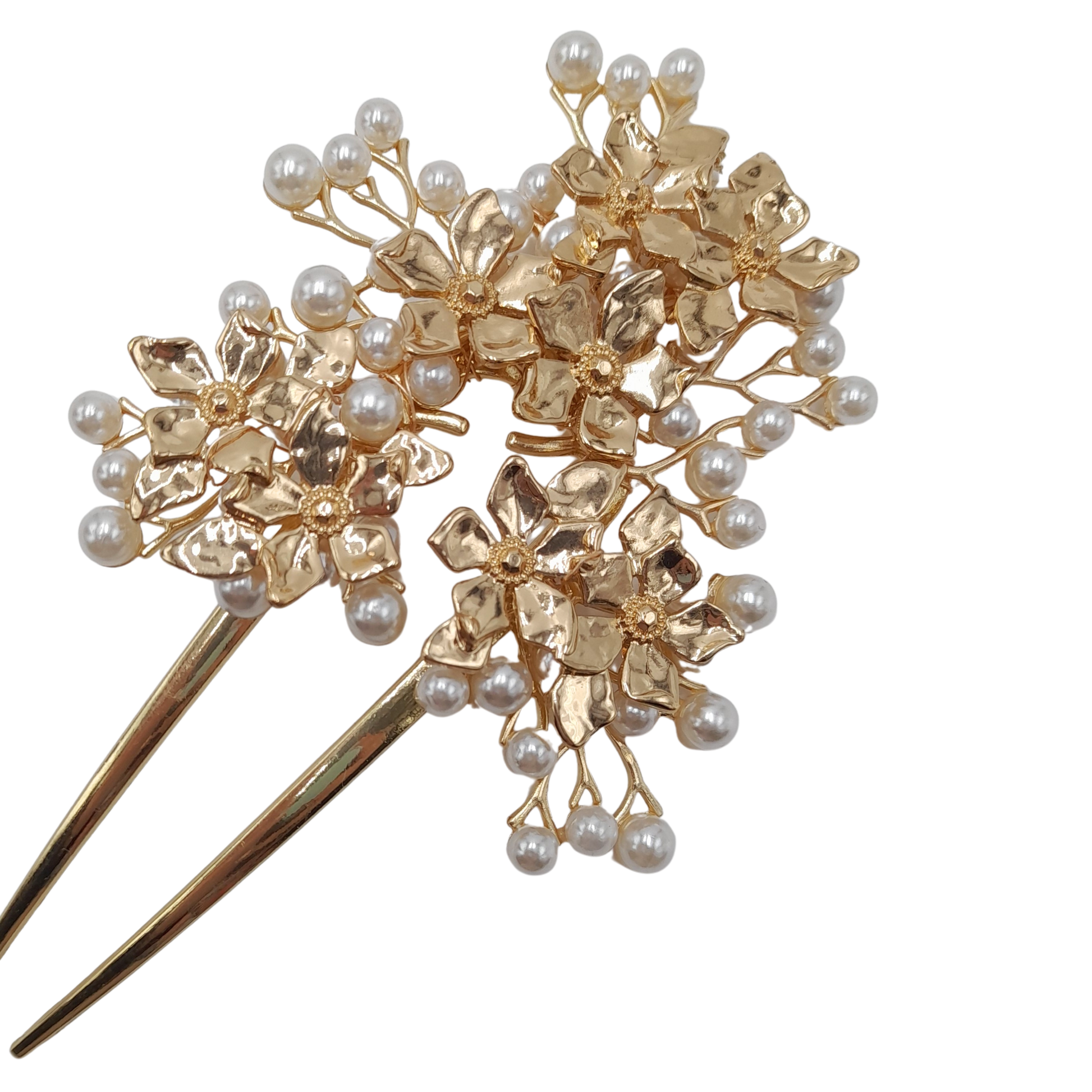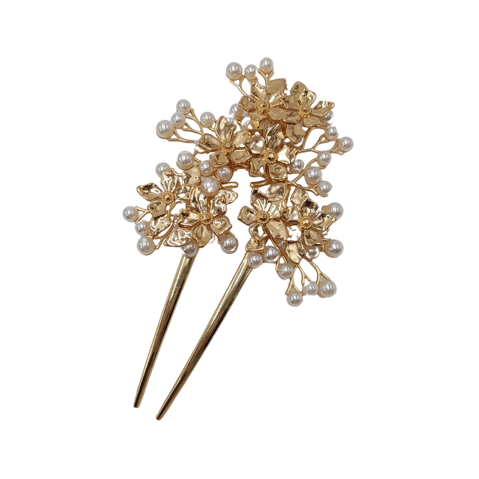 Peineta dorada adornada con perlas , flores y ramas. Un diseño celestial que ilumina el peinado con un aire romántico y sofisticado.