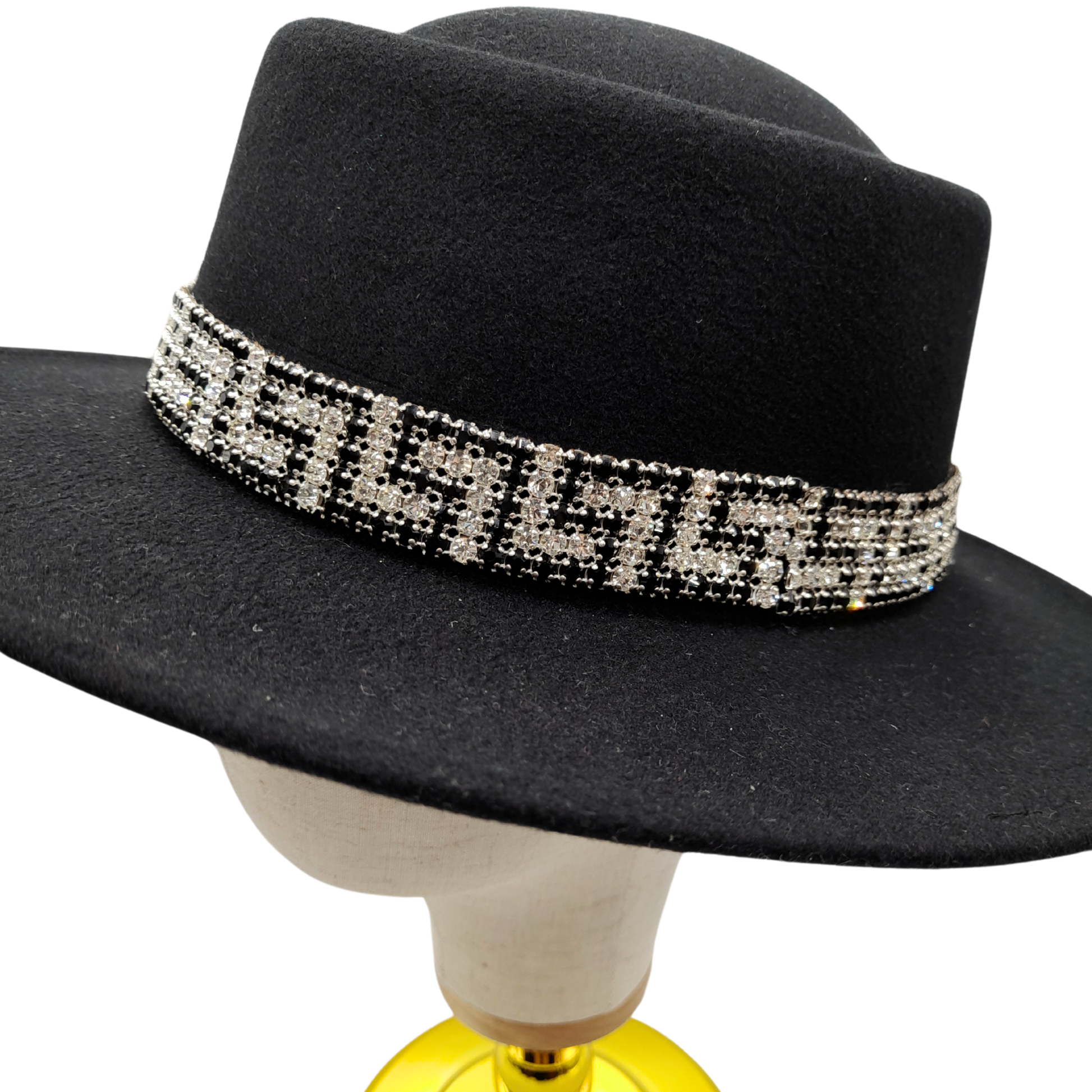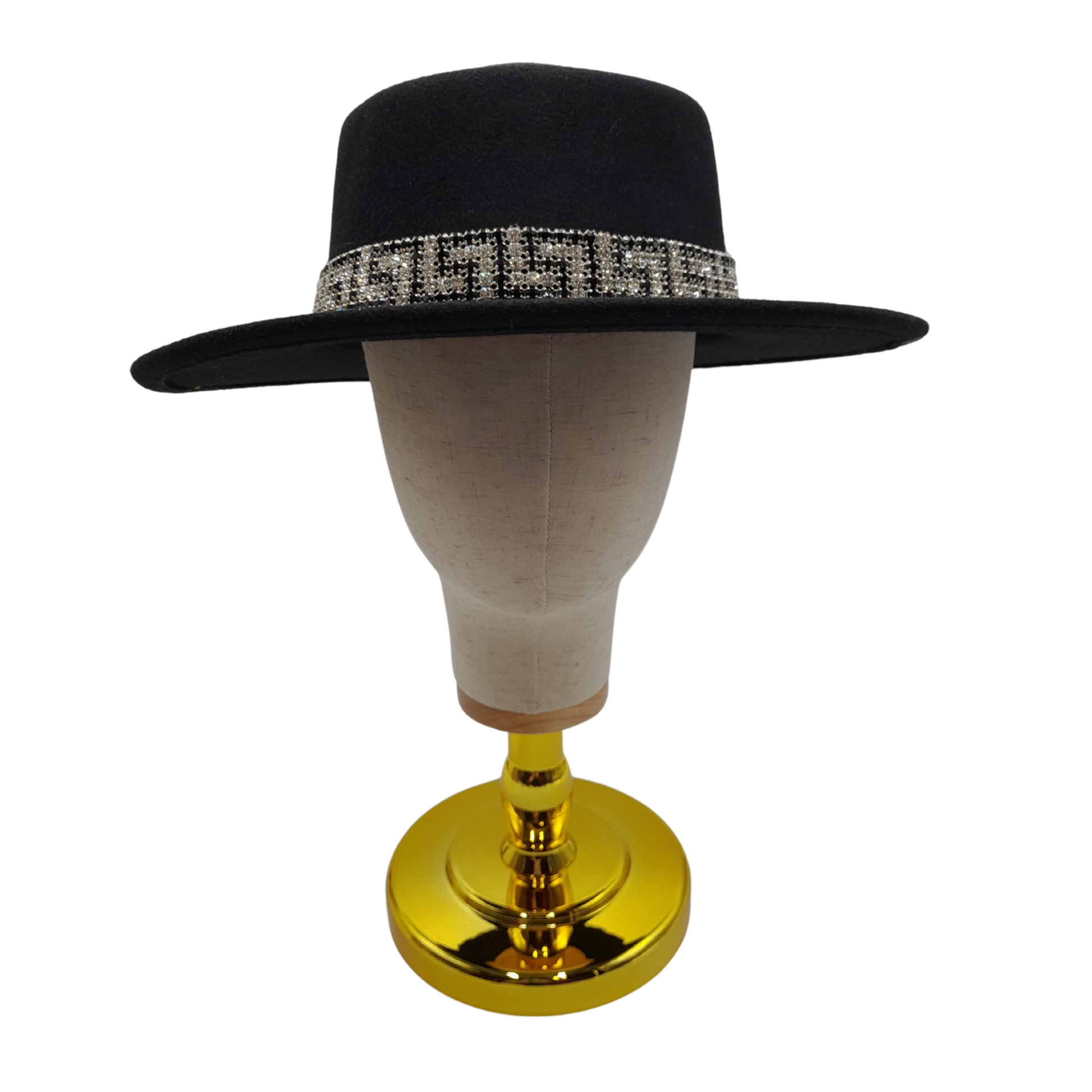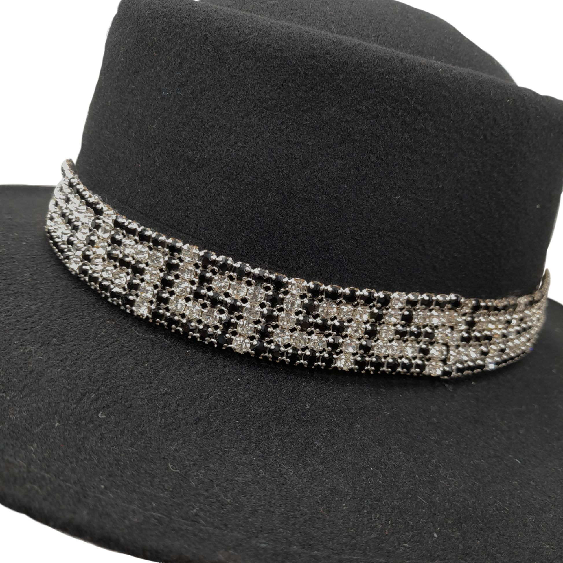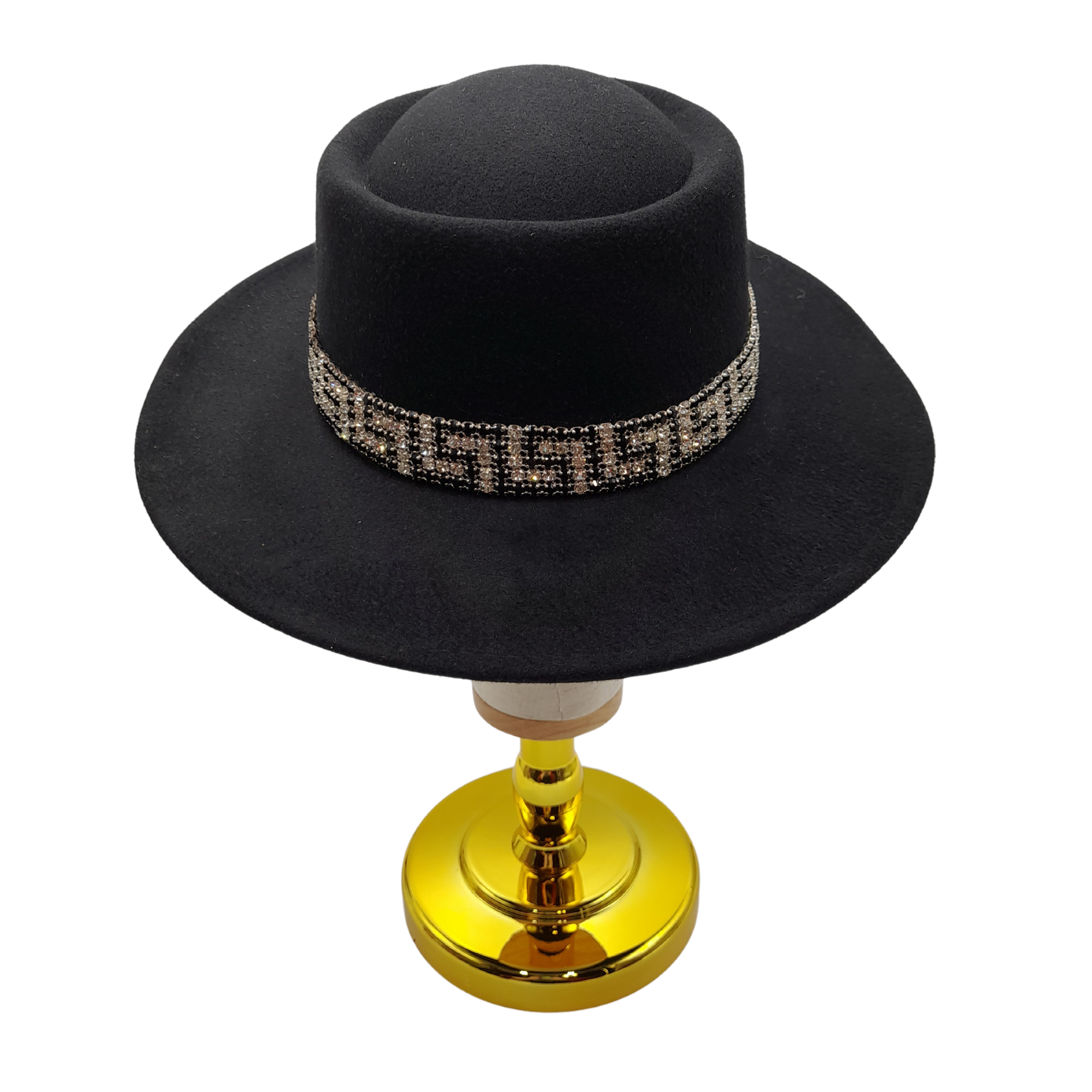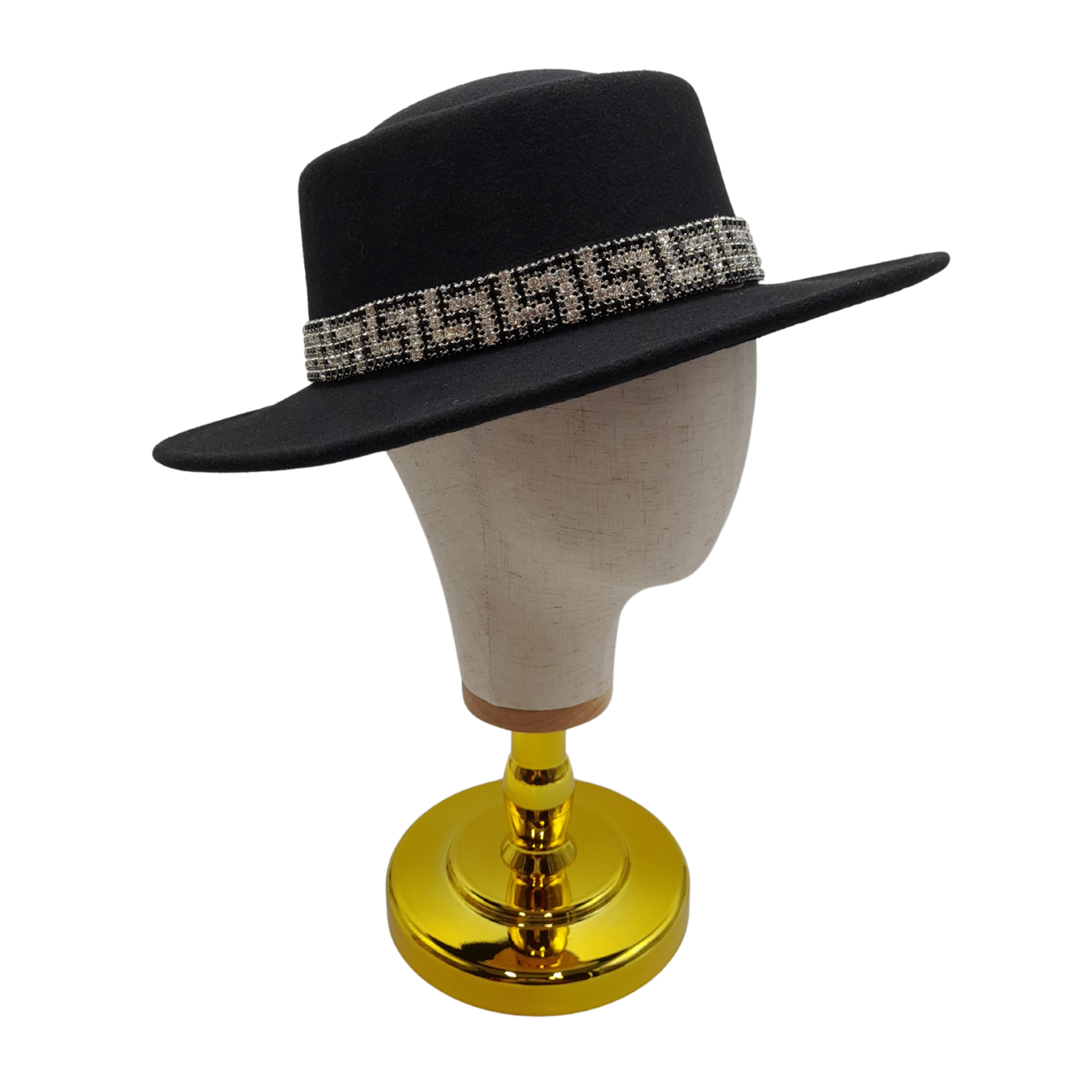 Sombrero pork pie en color negro, adornado con cinta de mostacillas que aporta un detalle brillante y sofisticado, ideal para realzar cualquier estilo con un toque elegante y moderno.