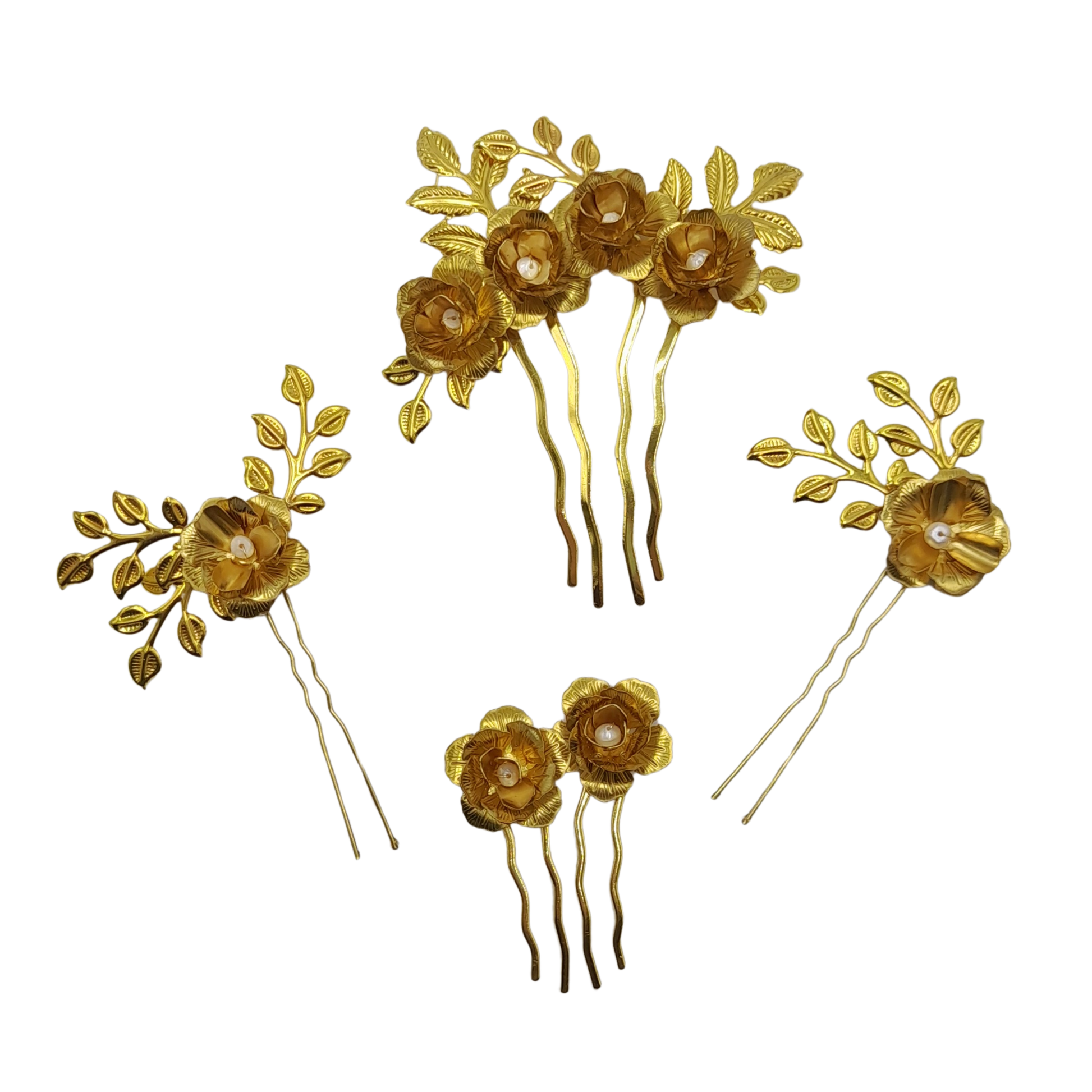 Set de horquillas doradas, decoradas con flores y hojas metálicas. Una pieza versátil y luminosa que aporta un toque delicado y sofisticado al peinado nupcial.