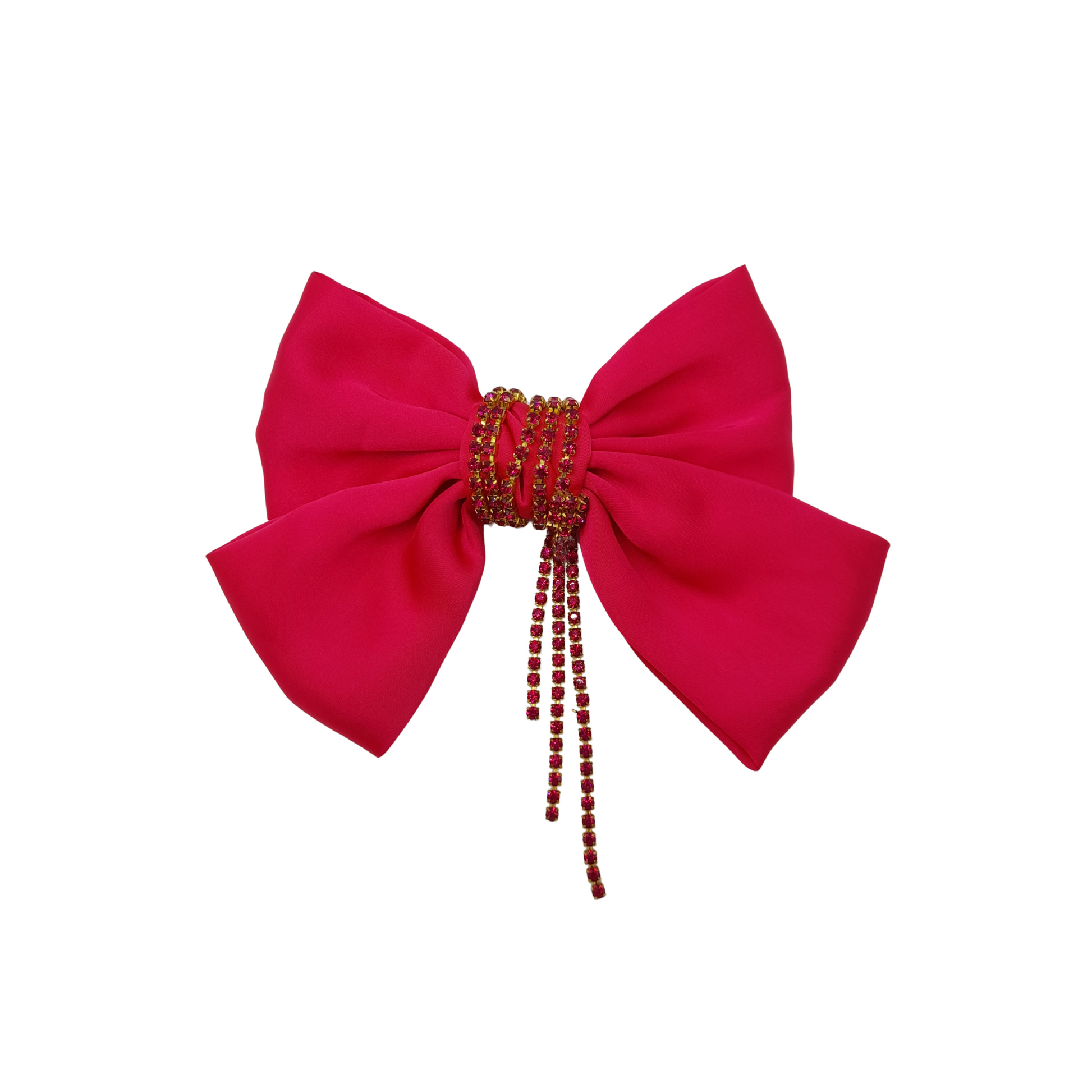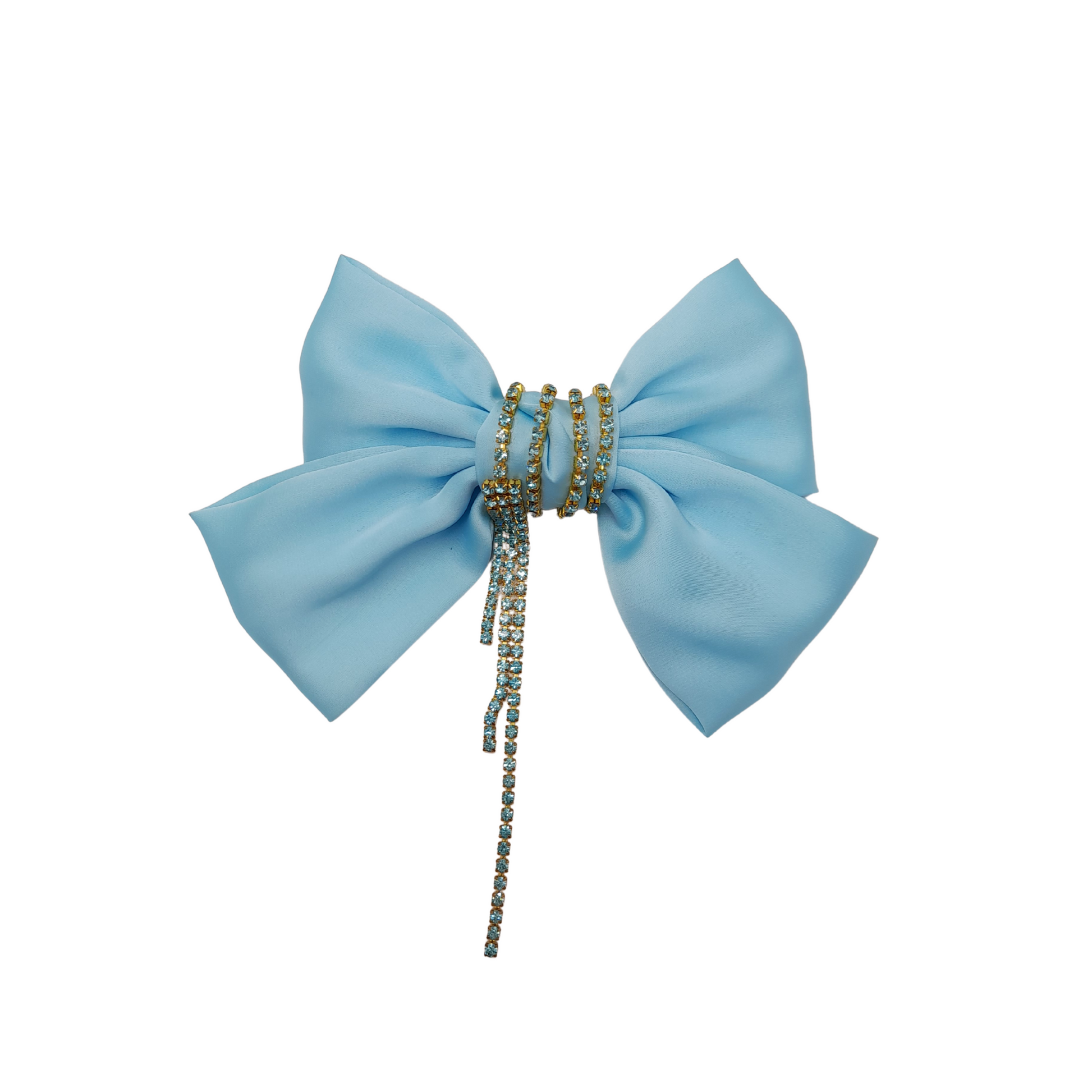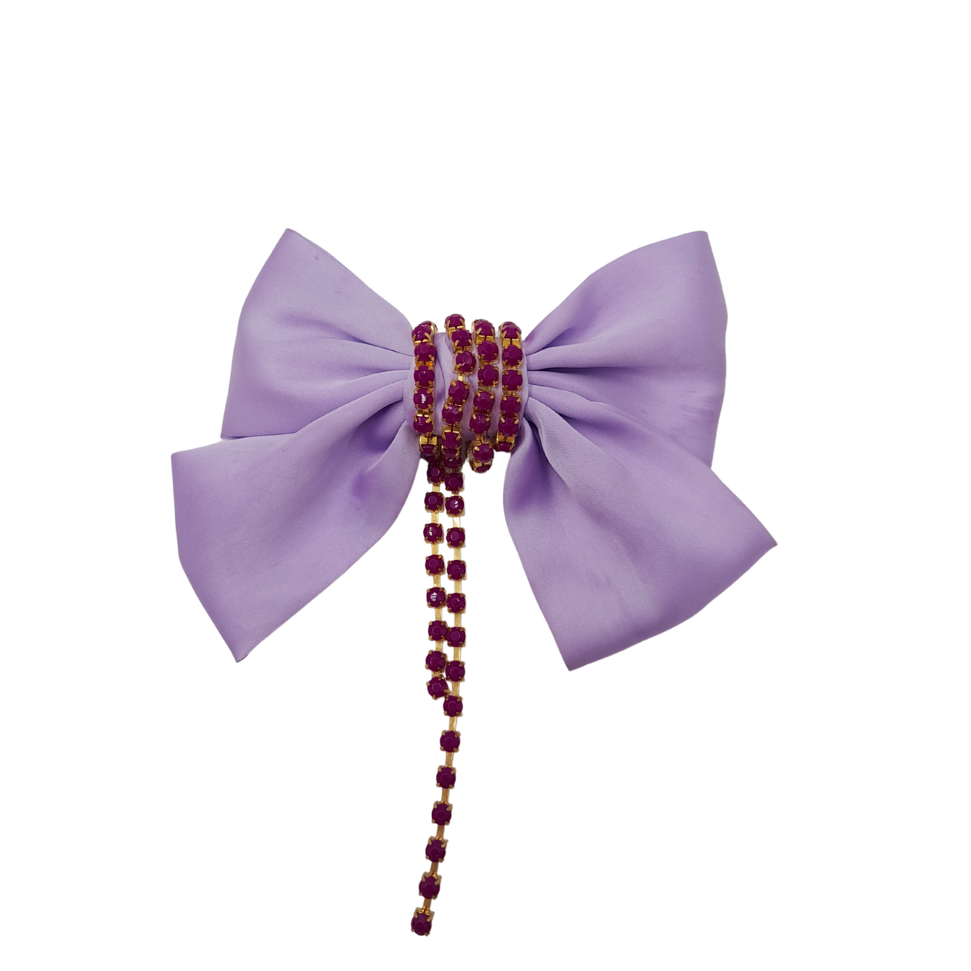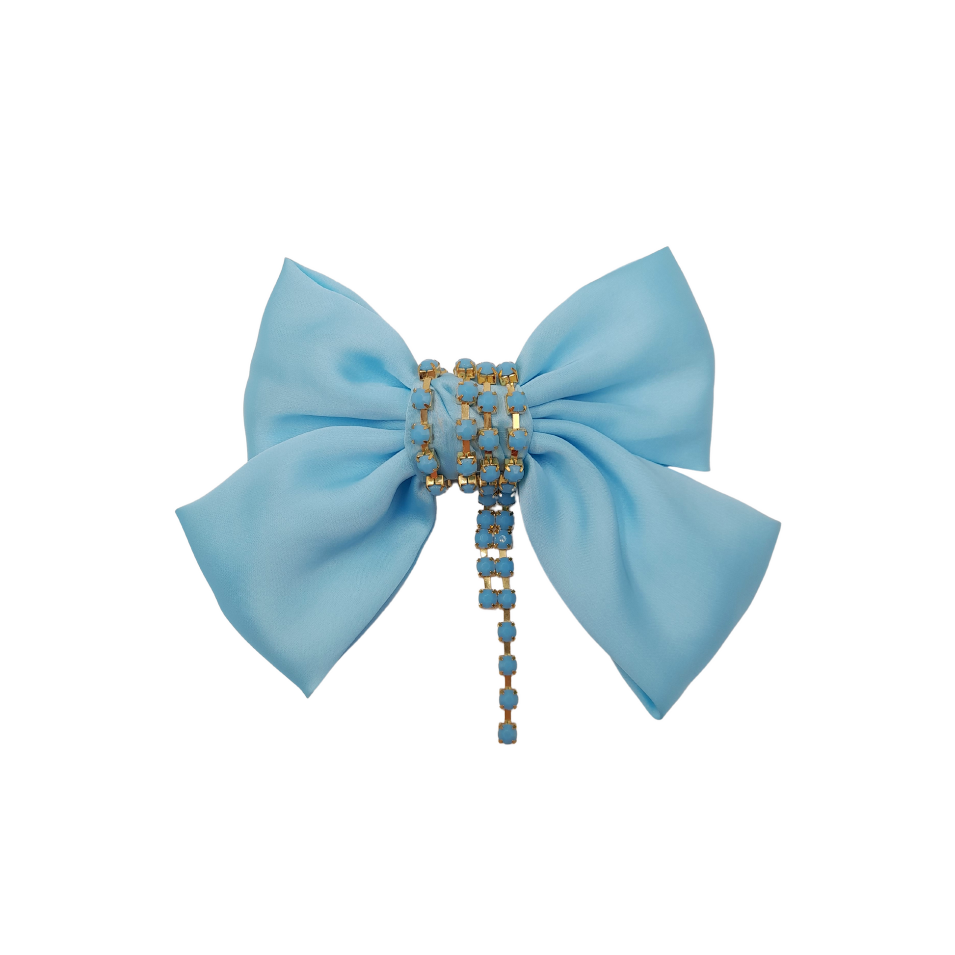 Traba con lazo confeccionado en satén de acabado suave y brillante, decorado con una cadena de strass que aporta un toque de brillo delicado y elegante al diseño
