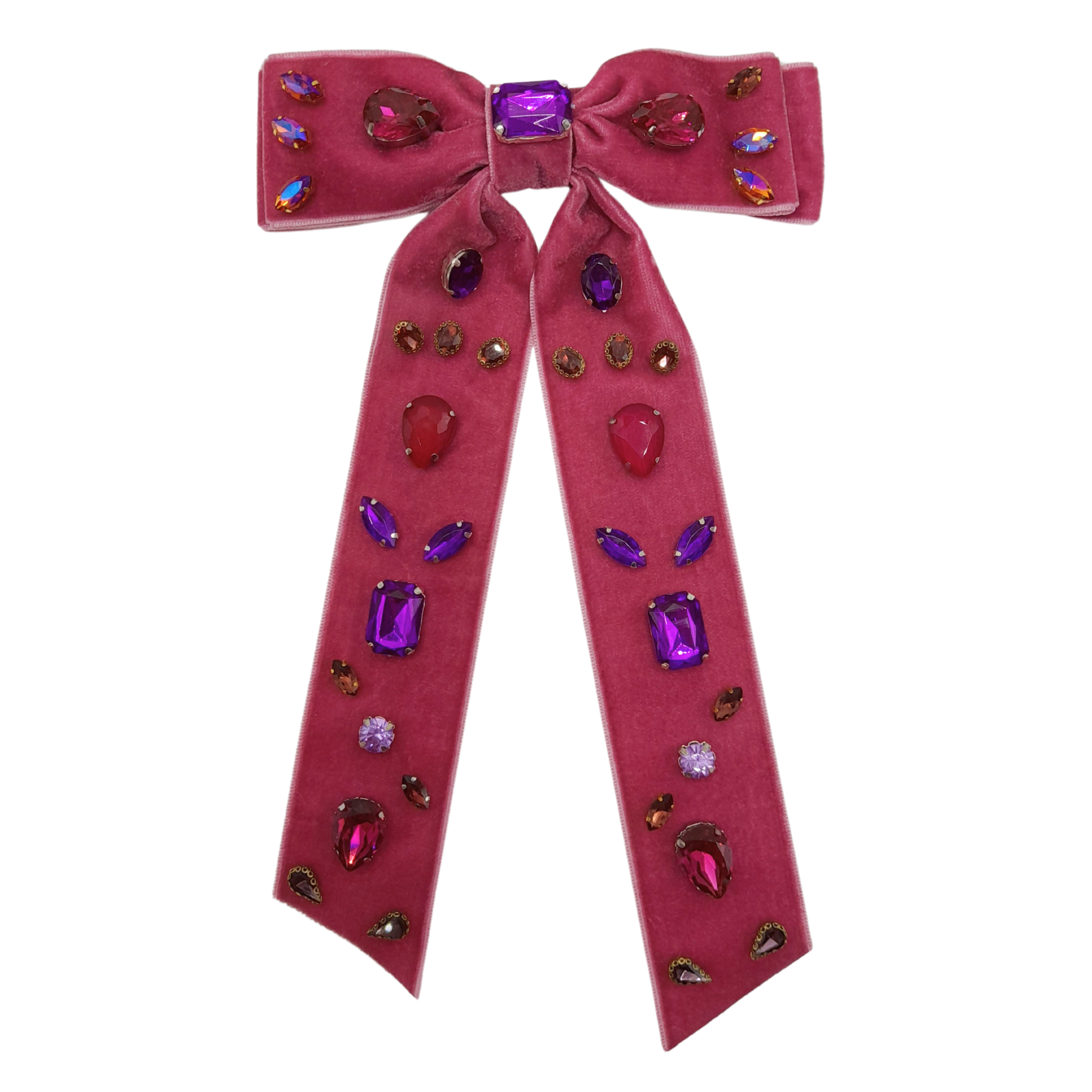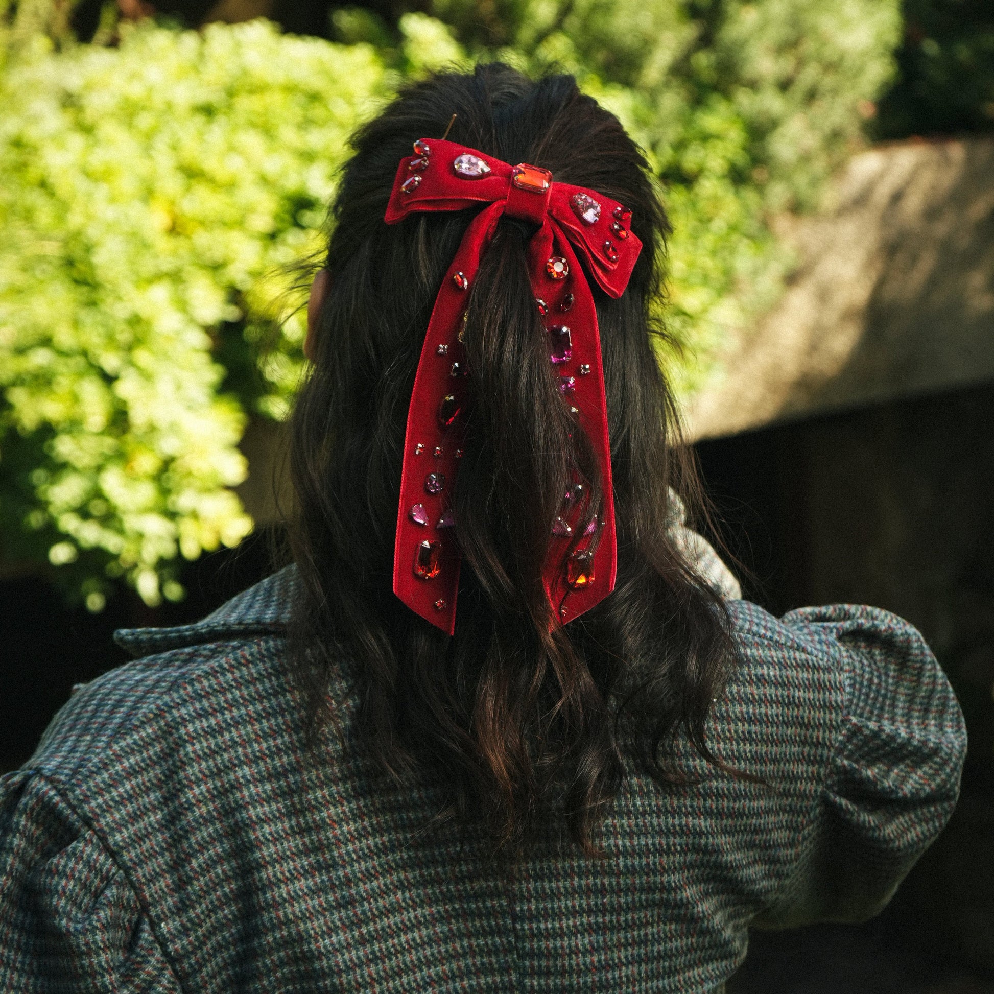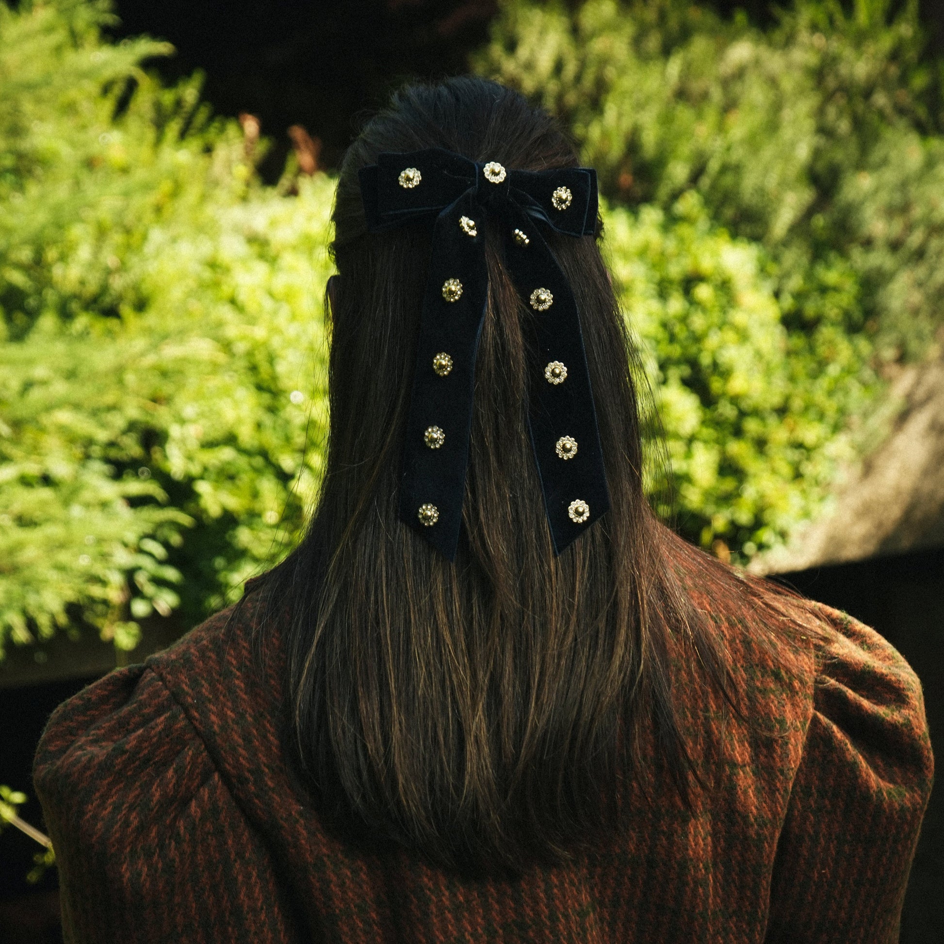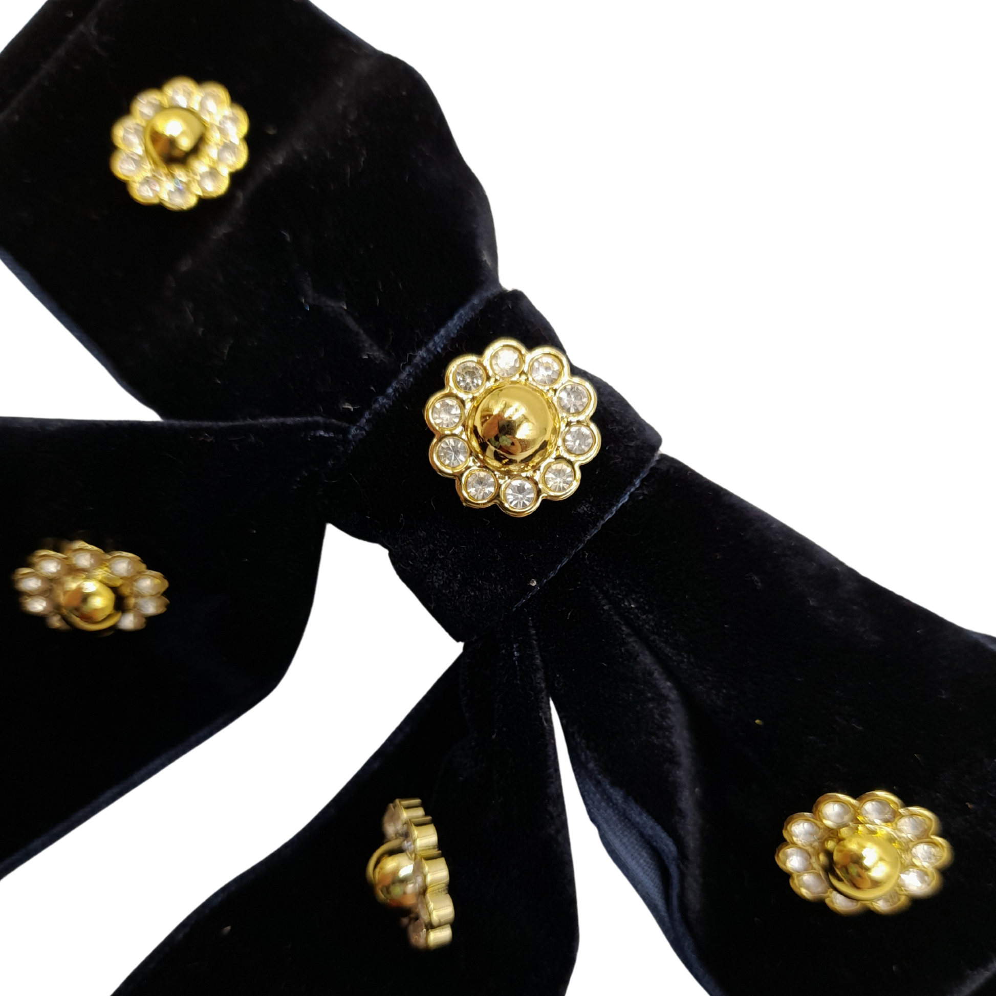 Traba en lazo doble con tiras, confeccionada con cinta de terciopelo y decorada con aplicaciones y piedras que aportan brillo y sofisticación, perfecta para realzar cualquier peinado con un toque elegante y glamuroso.