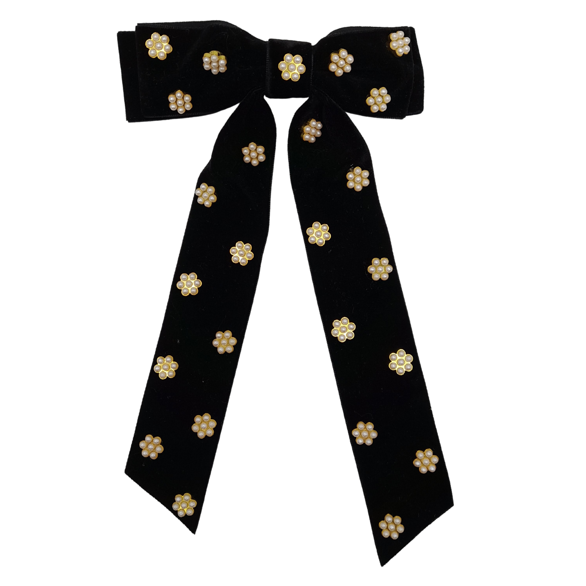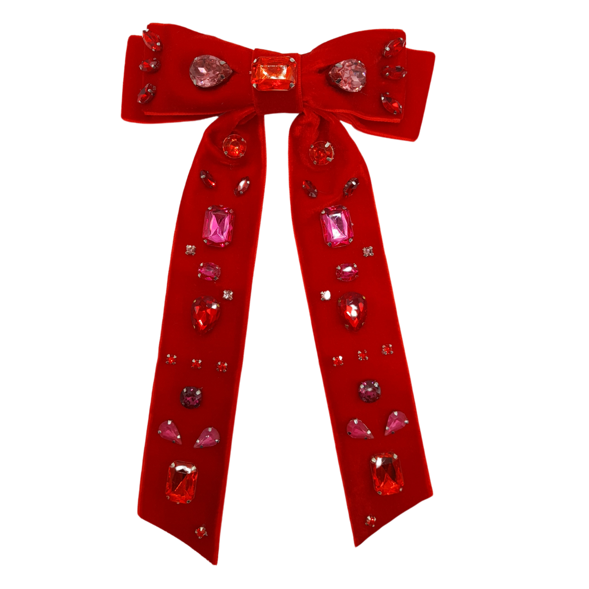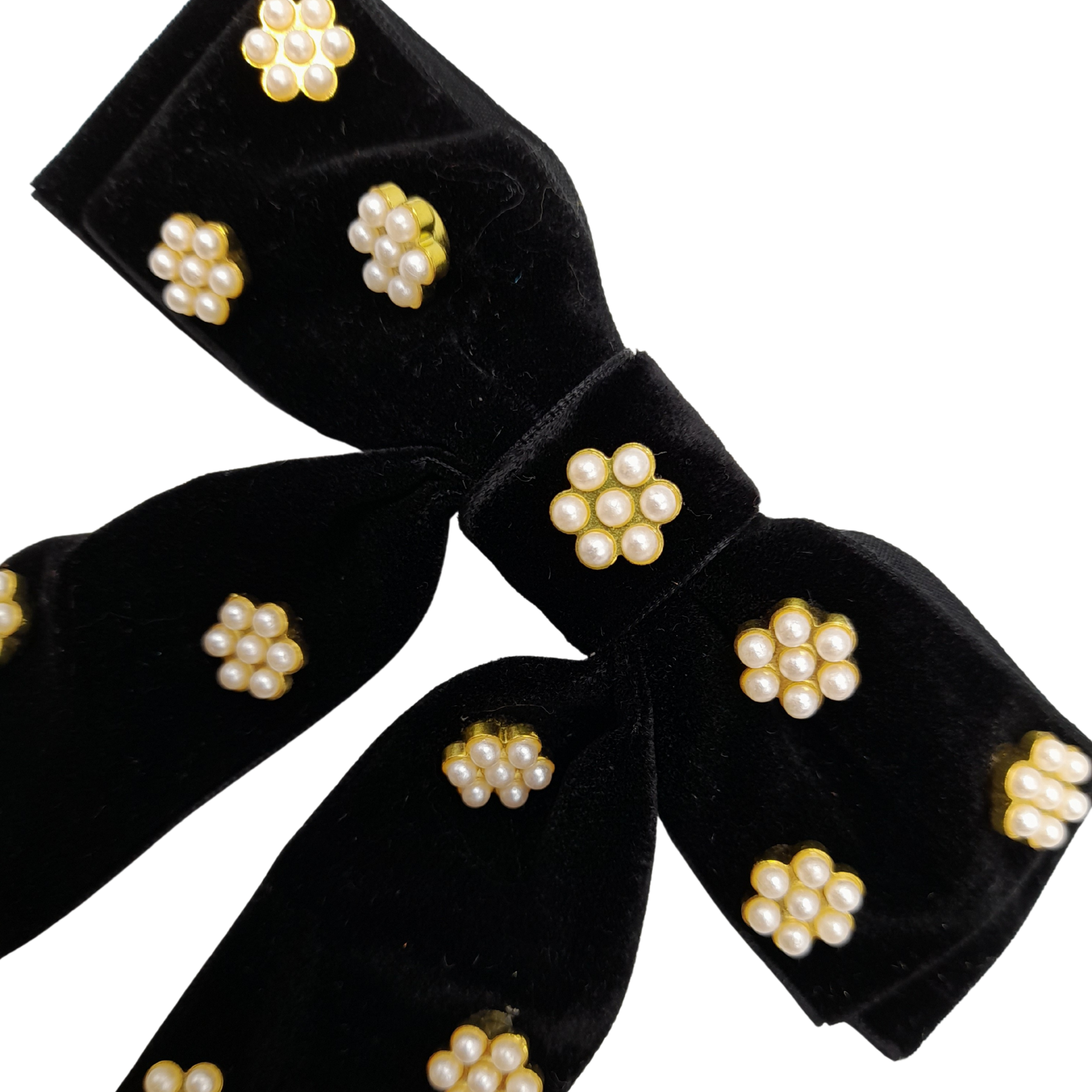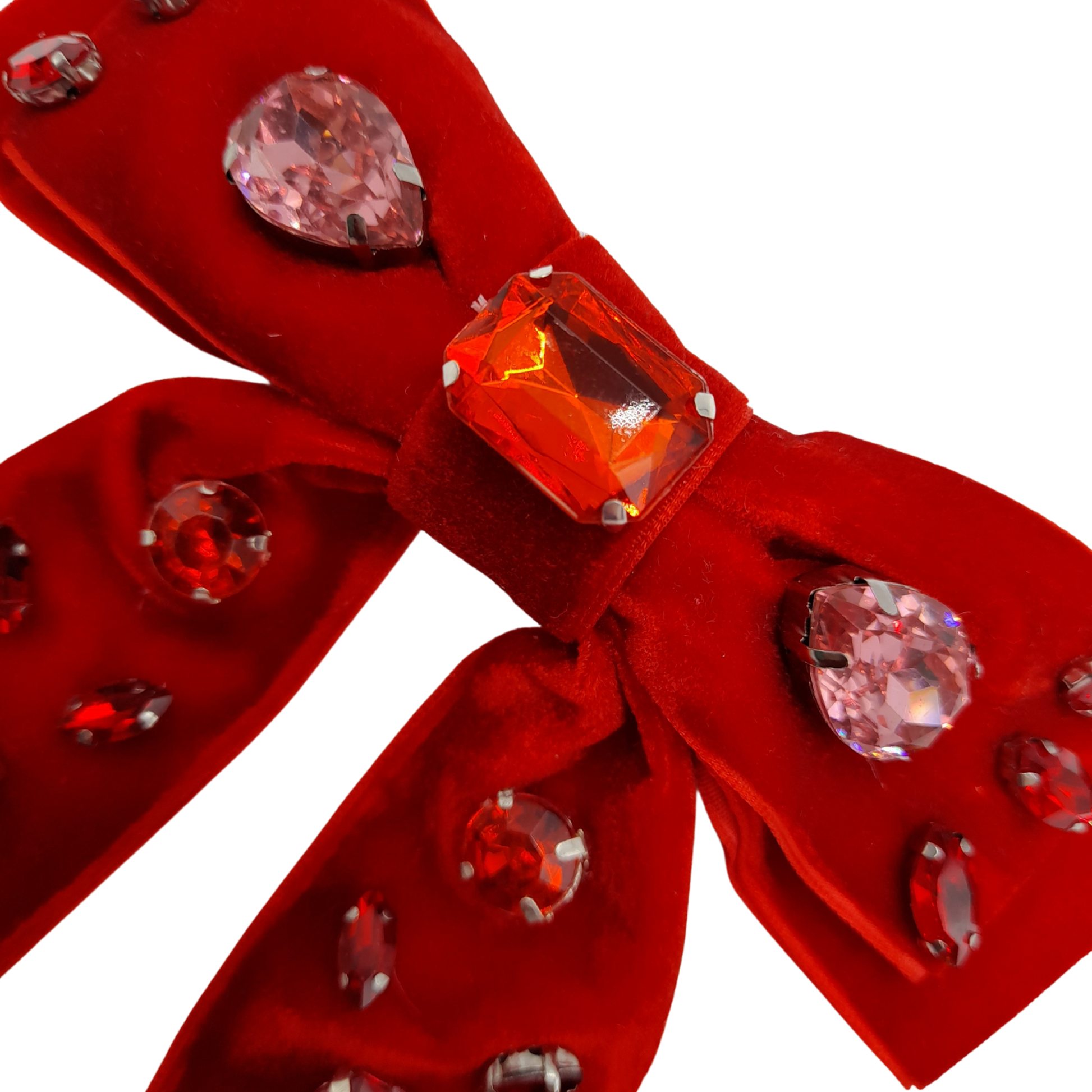 Traba en lazo doble con tiras, confeccionada con cinta de terciopelo y decorada con aplicaciones y piedras que aportan brillo y sofisticación, perfecta para realzar cualquier peinado con un toque elegante y glamuroso.