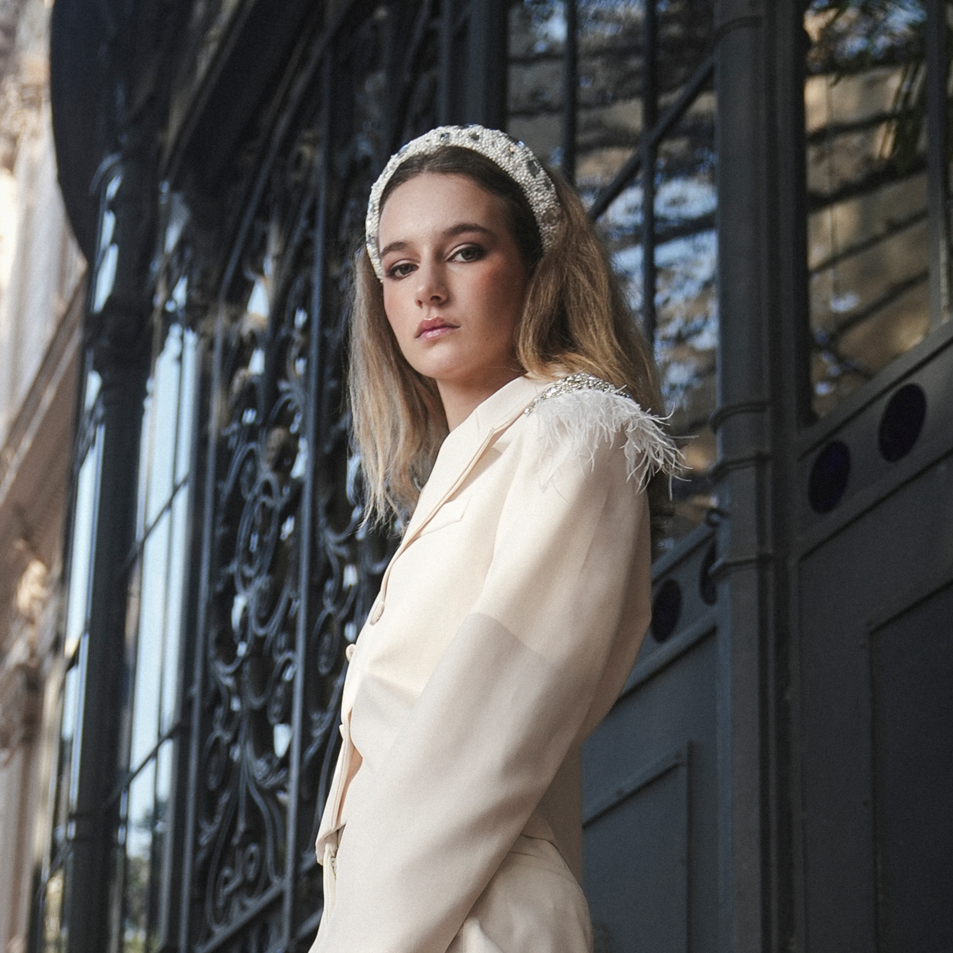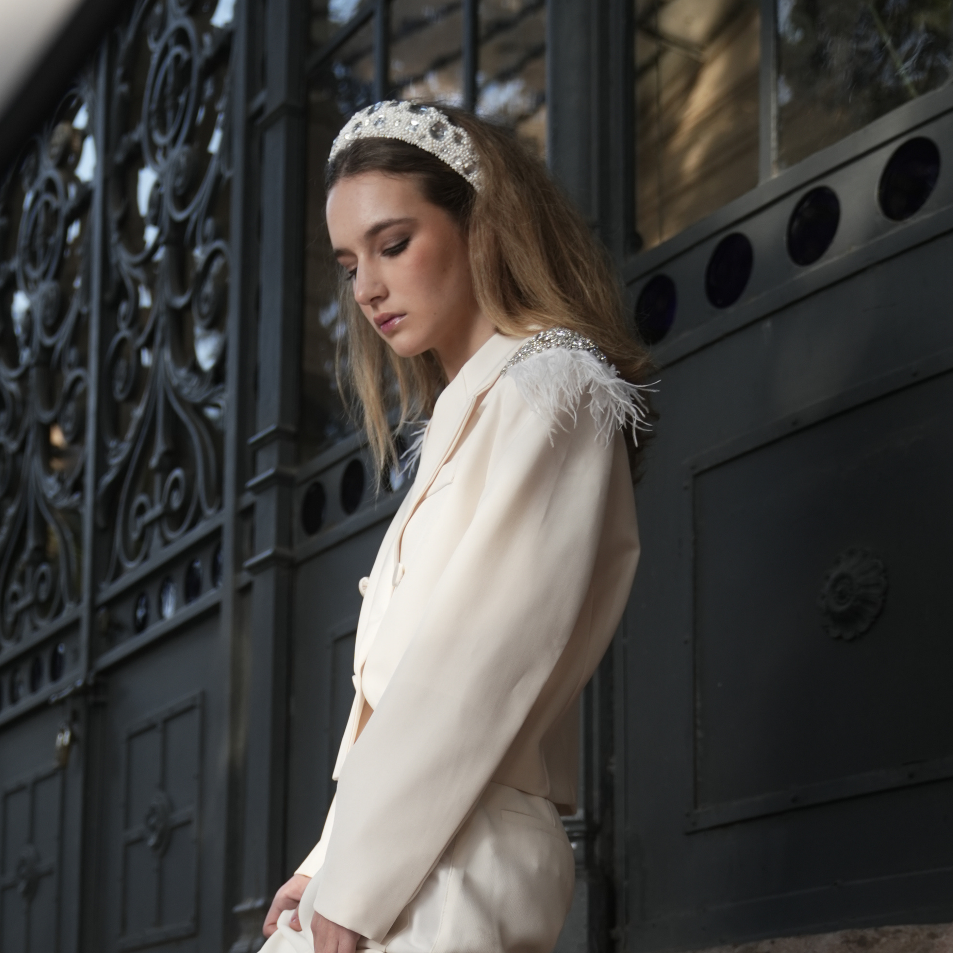 Diadema alta confeccionada en tela de pedrería, que aporta un toque de brillo y elegancia al peinado. Ideal para novias que buscan un accesorio sofisticado y delicado.