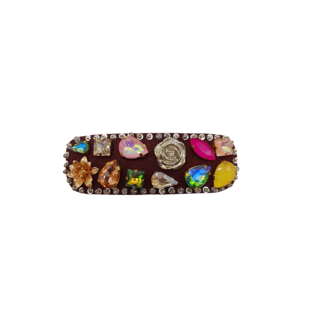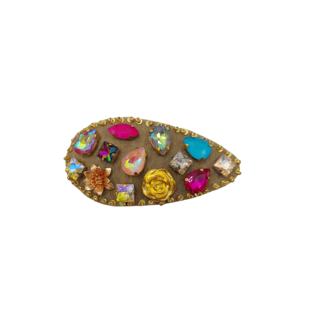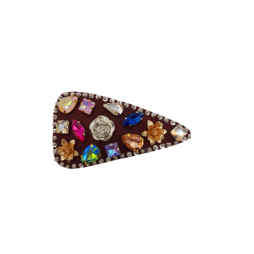 Pinzas en variadas formas geométricas, cuidadosamente bordadas a mano con mostacillas y pedrería en tonos diversos. Cada pieza mide 9 cm de largo por 5 cm de ancho, destacando por su brillo sutil y diseño único, perfectas para complementar peinados con estilo y personalidad.
