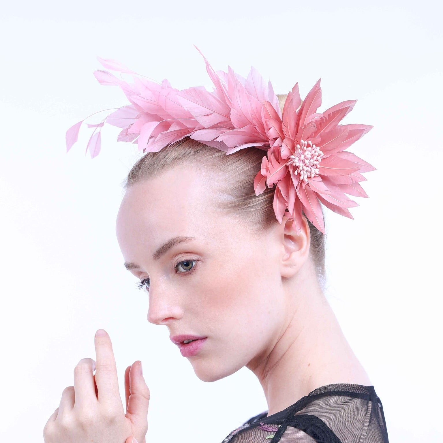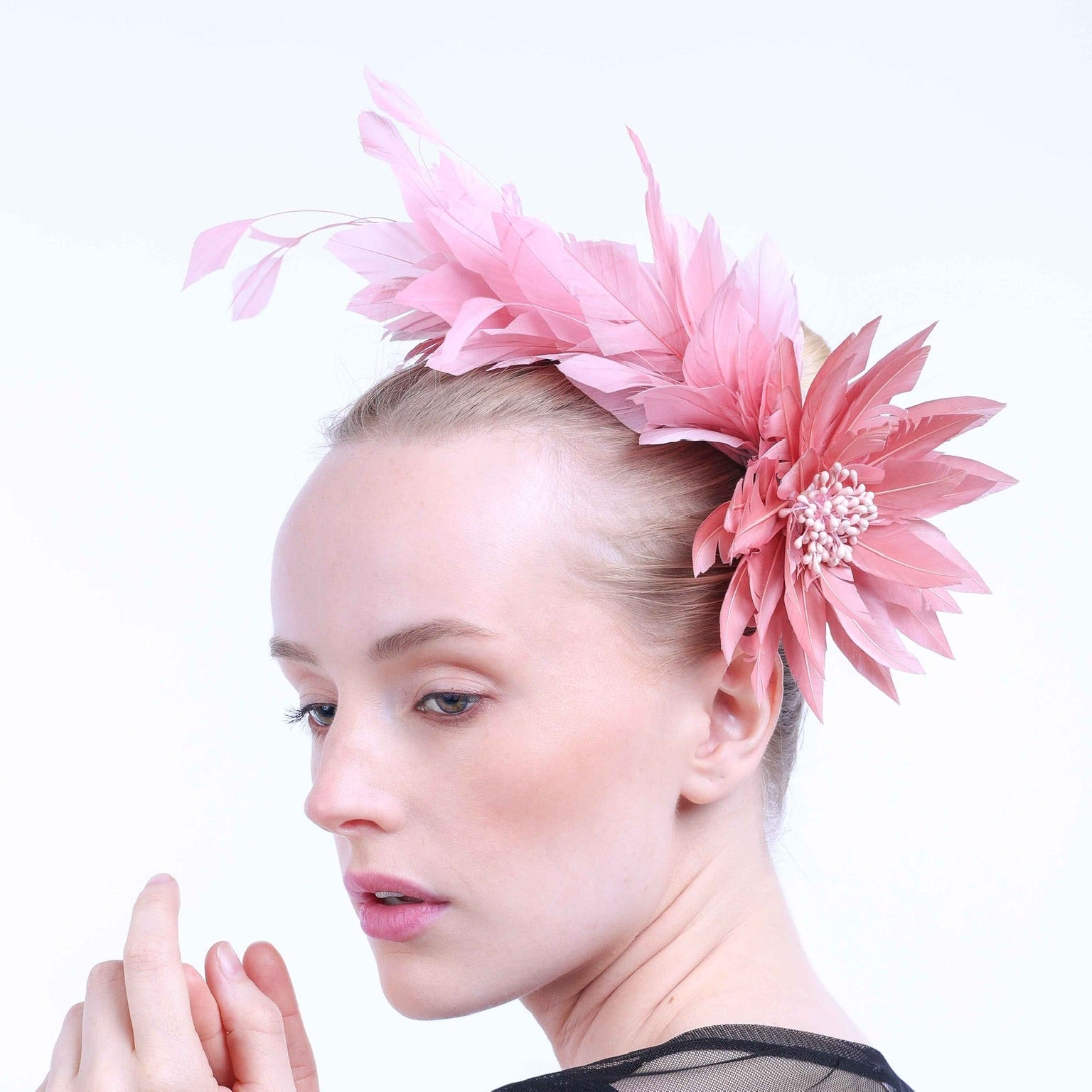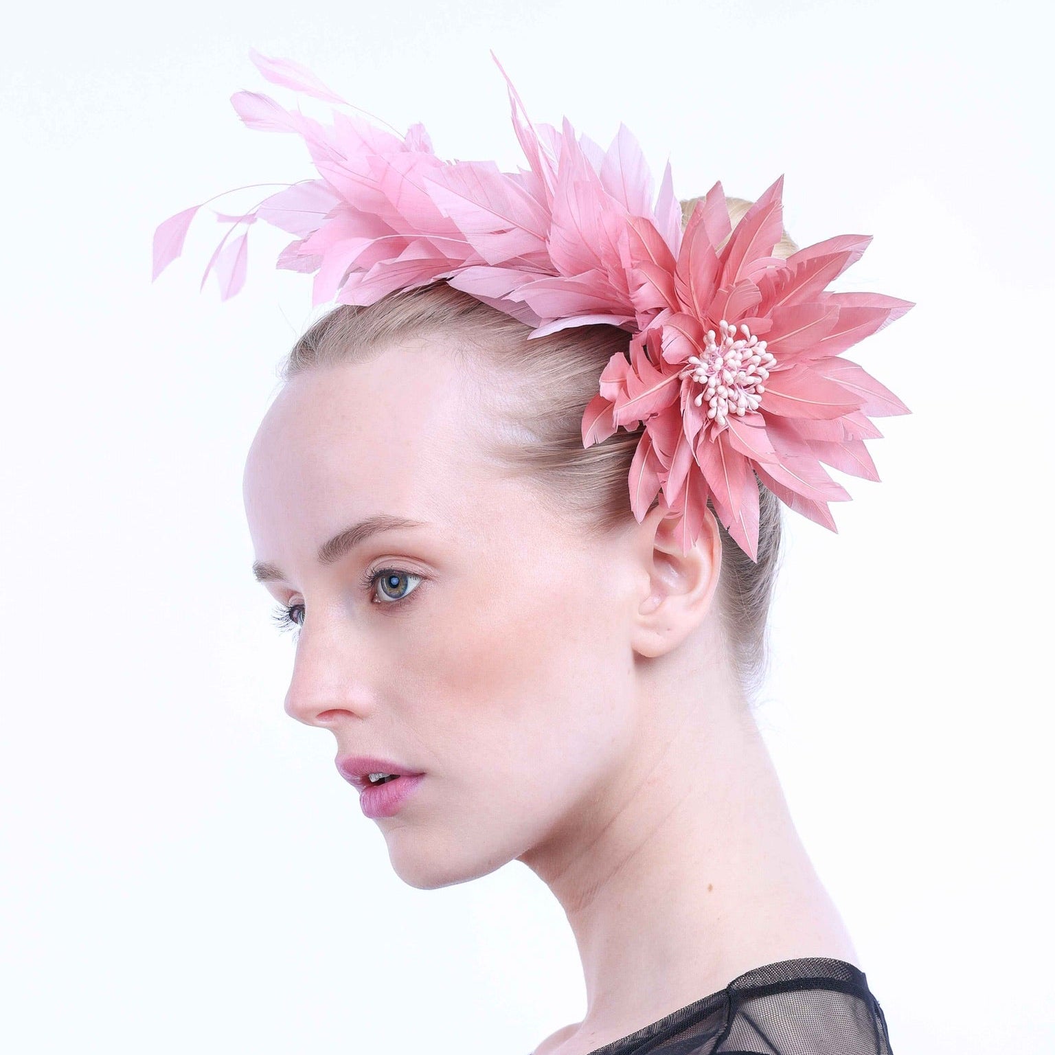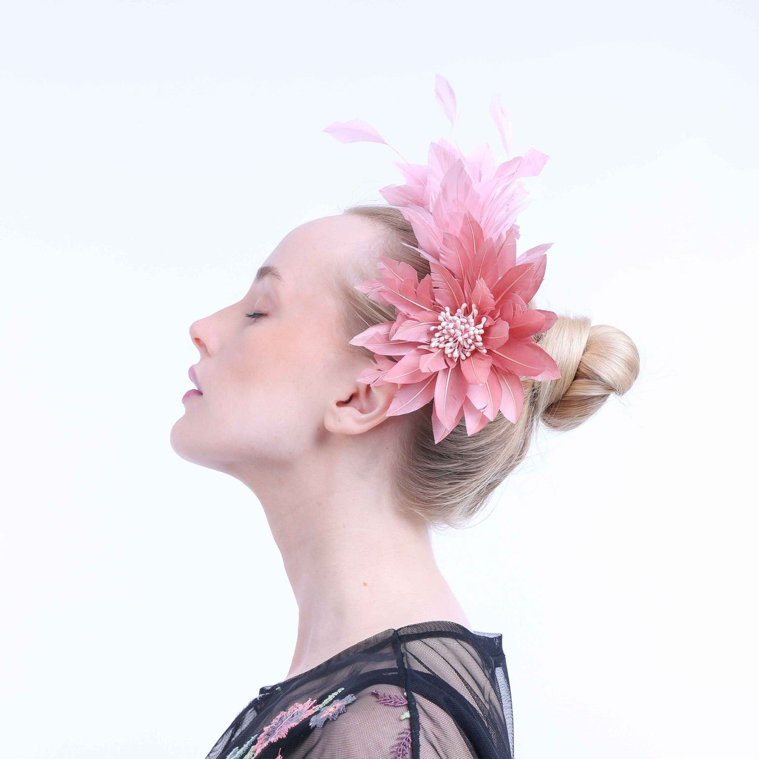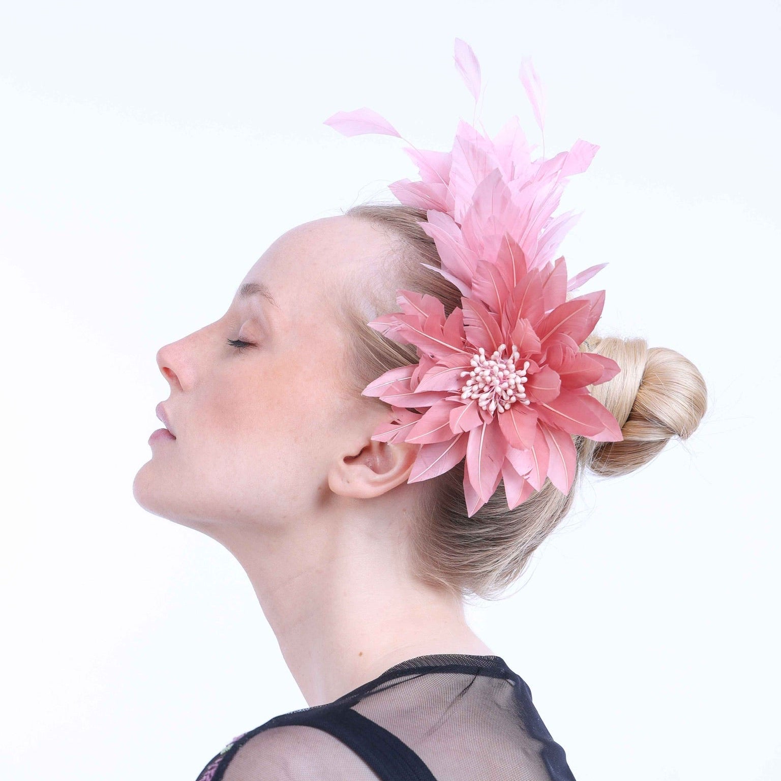 Tocado Peineta Lateral Palo Rosa, compuesto por un ramillete de plumas de gallo y una flor artesanal con pistilos a juego. Diseñado para colocarse lateralmente con peineta, es el complemento ideal para eventos especiales.