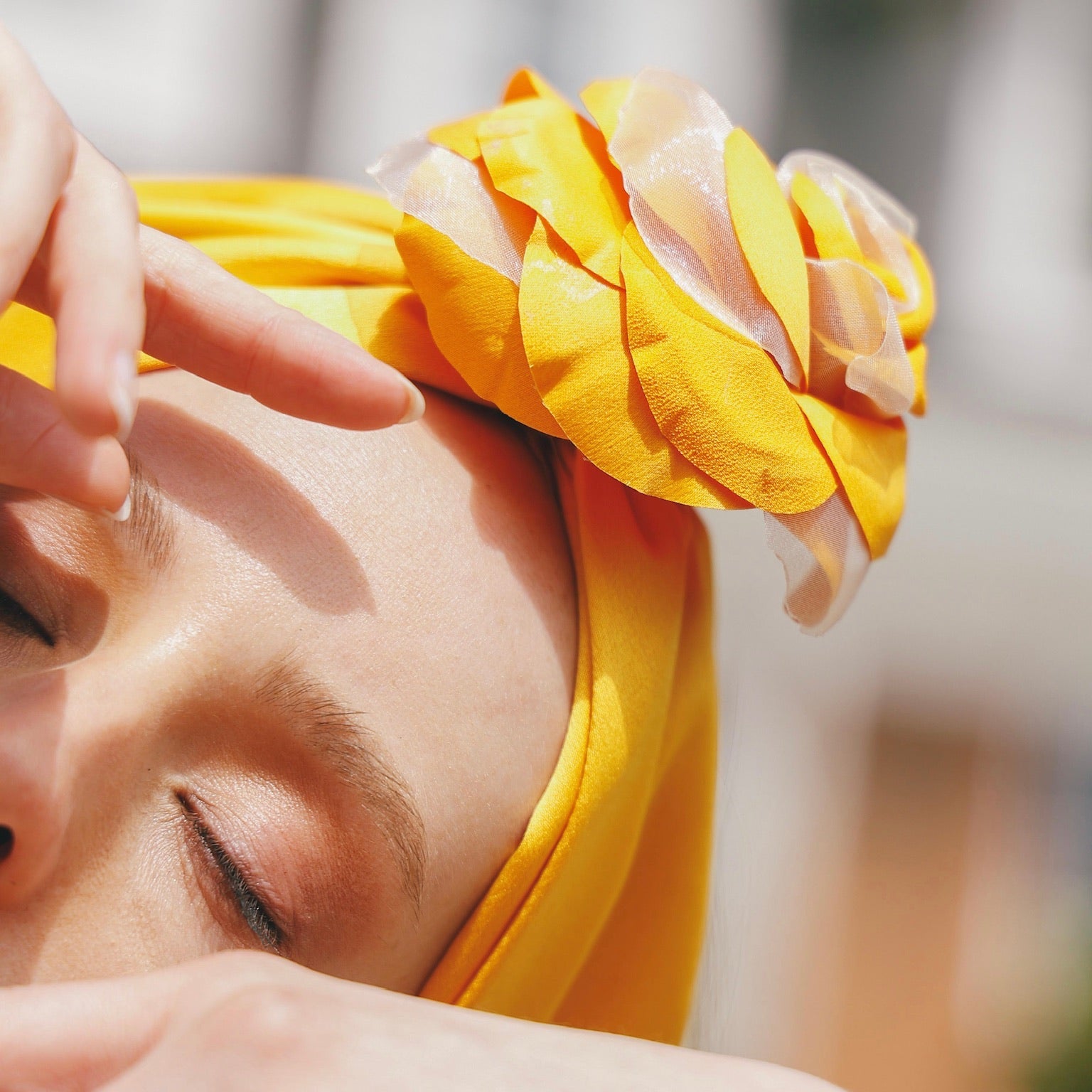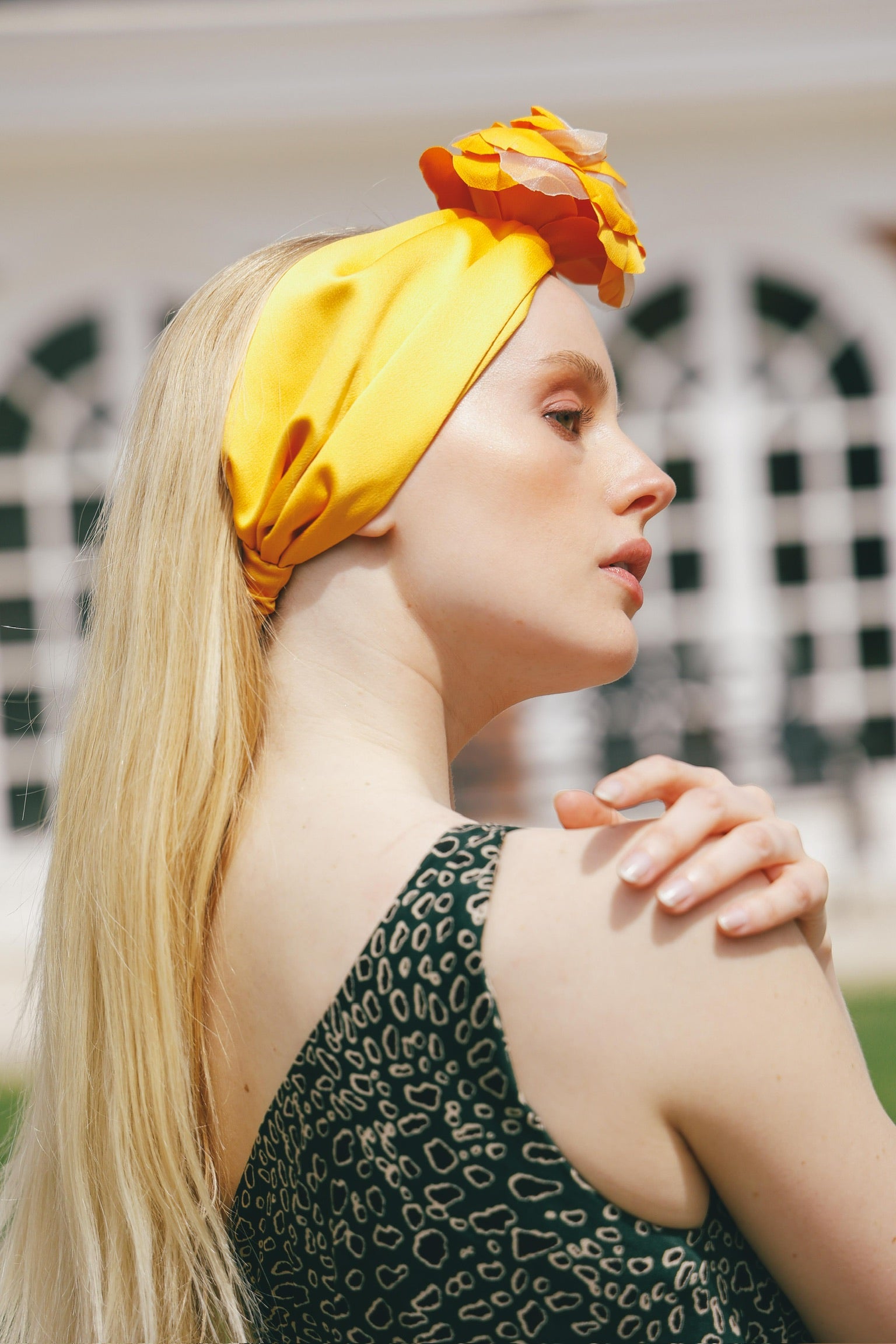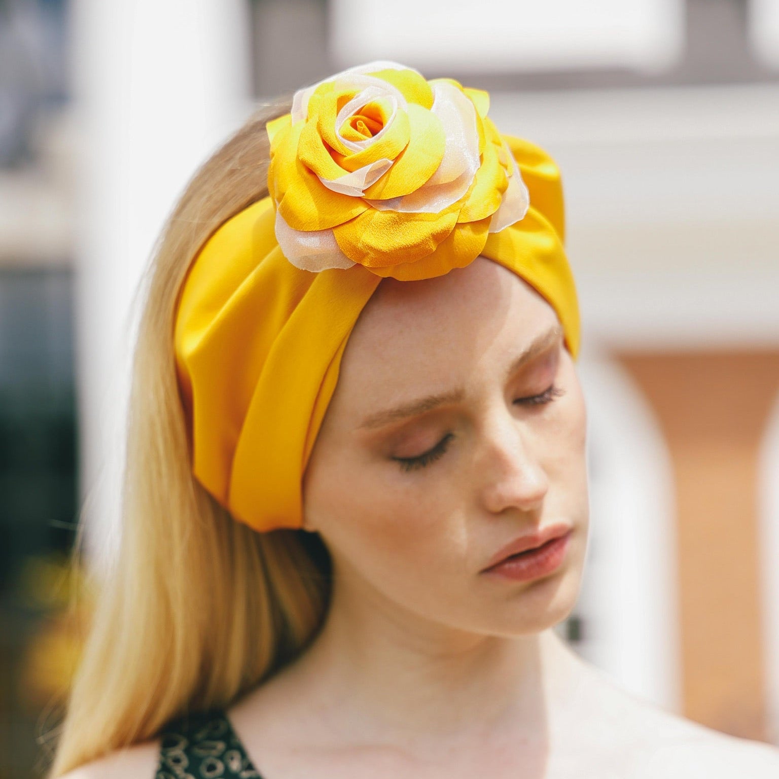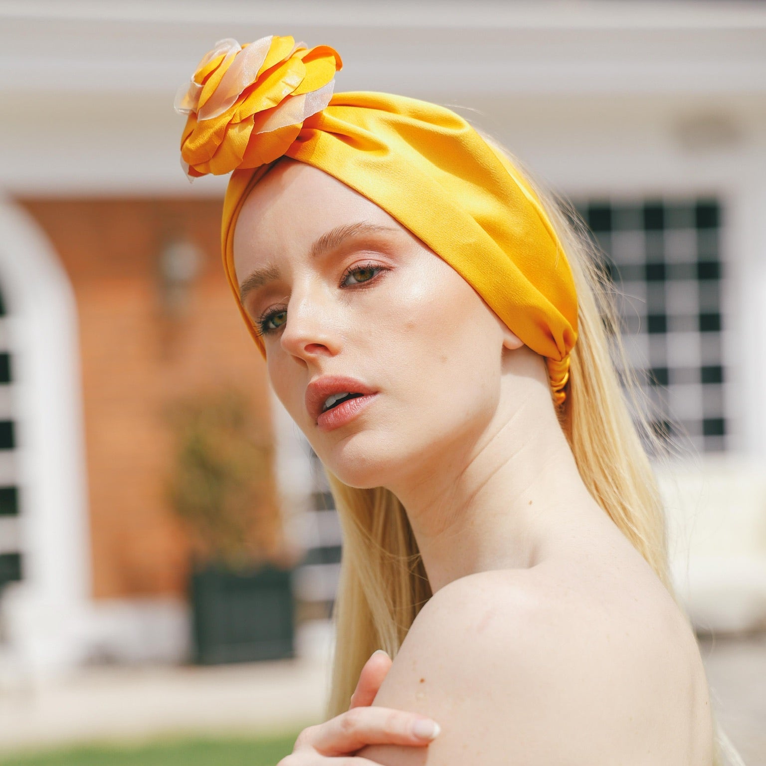 Turbante confeccionado en crepé de seda, con una flor central que aporta un toque romántico y femenino. Cuenta con elástico en la parte posterior para un ajuste cómodo, ideal para complementar looks sofisticados con estilo y suavidad.