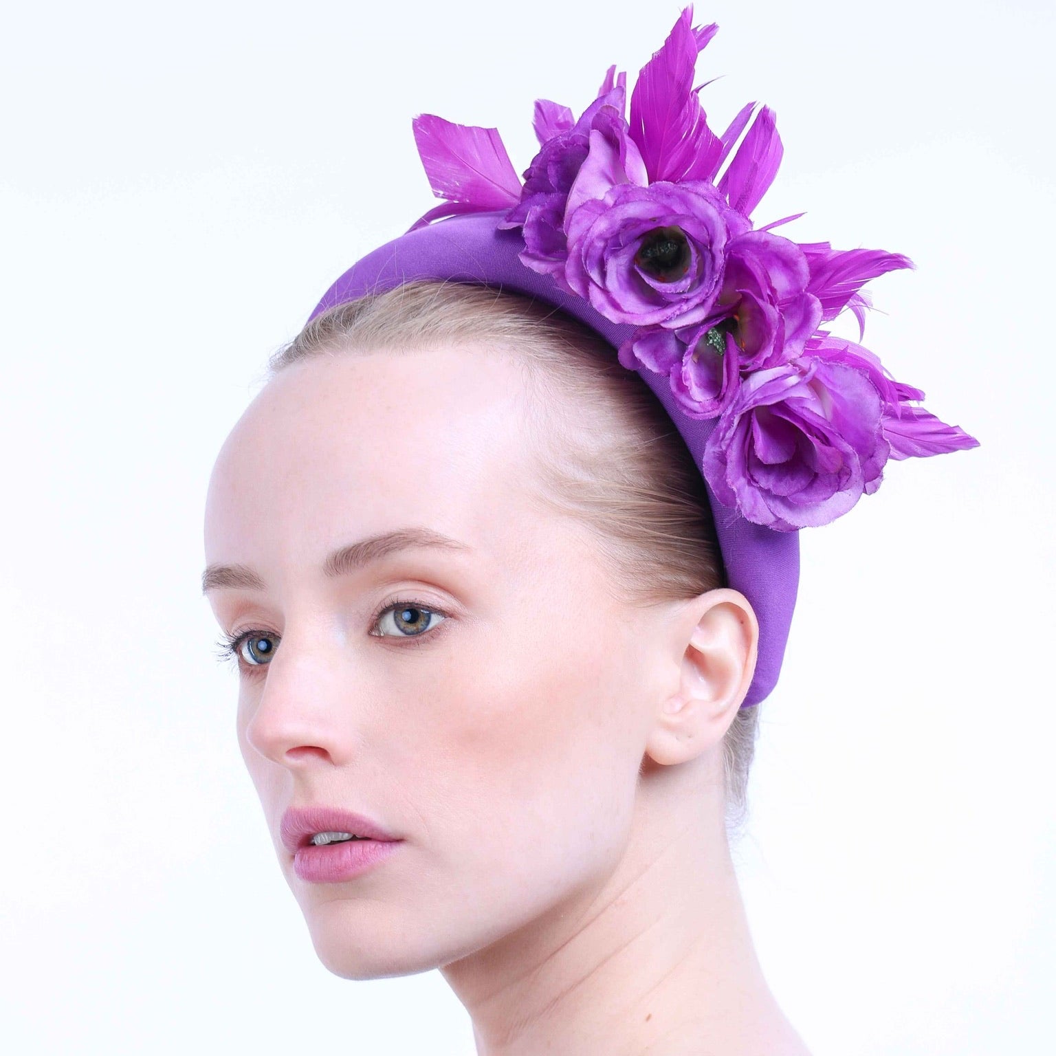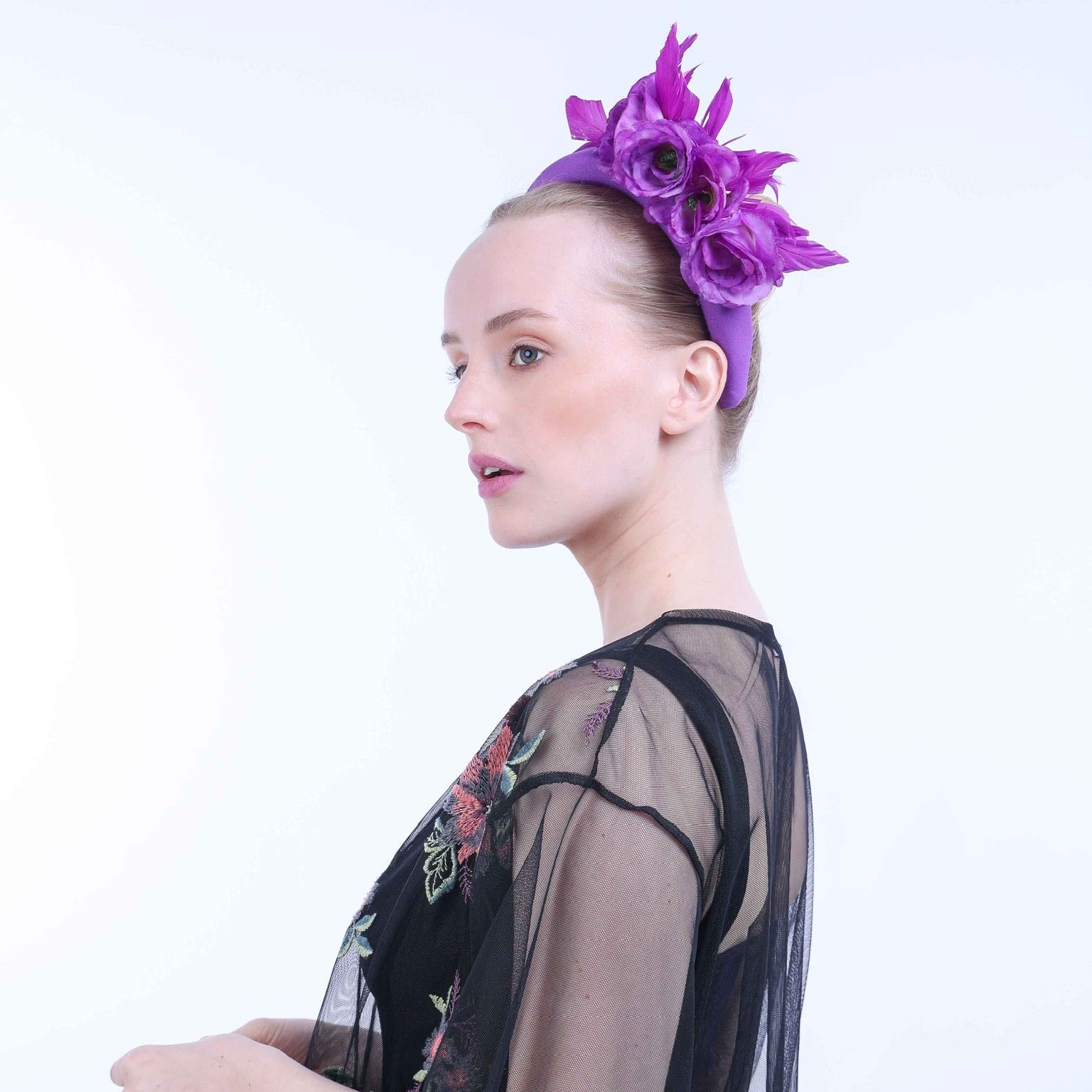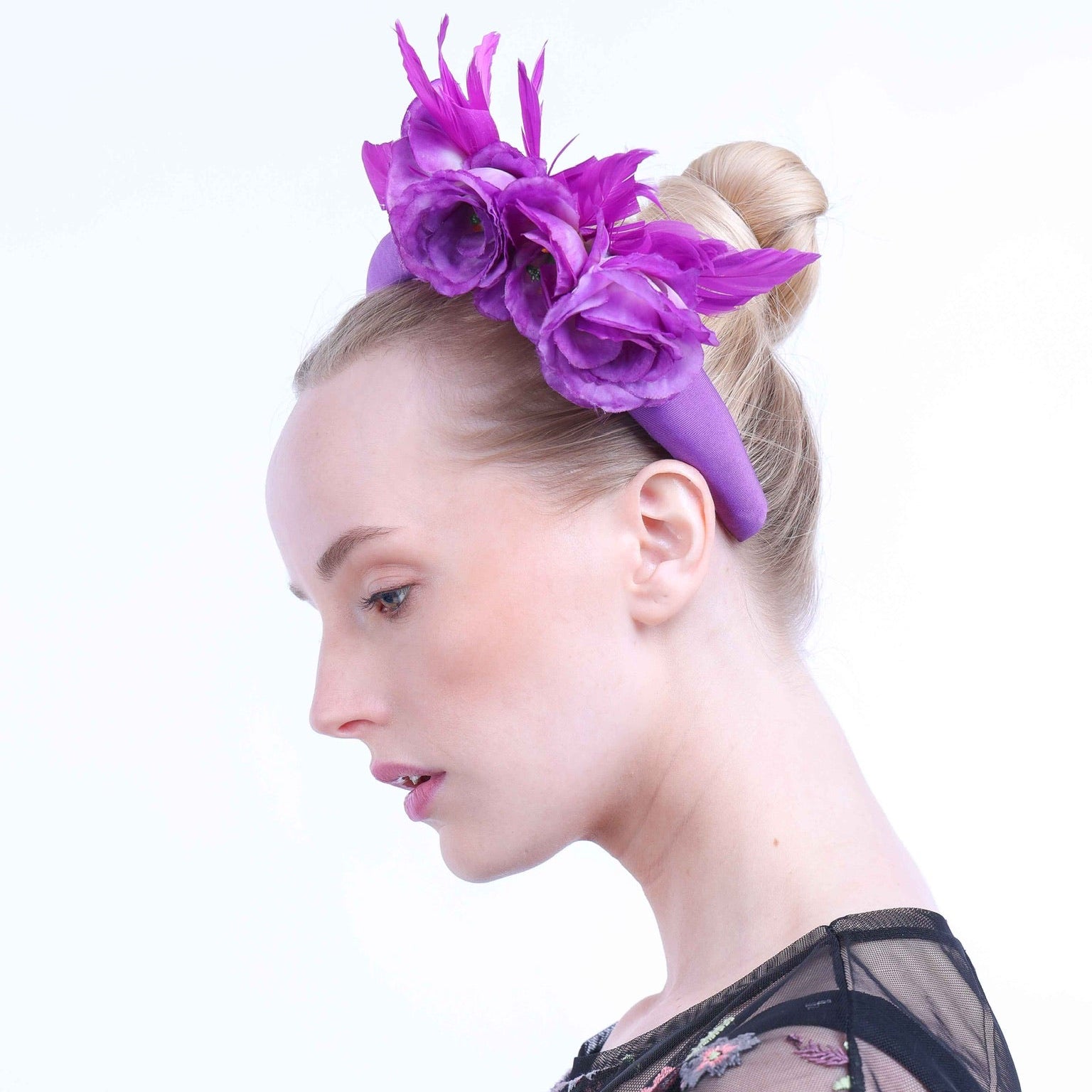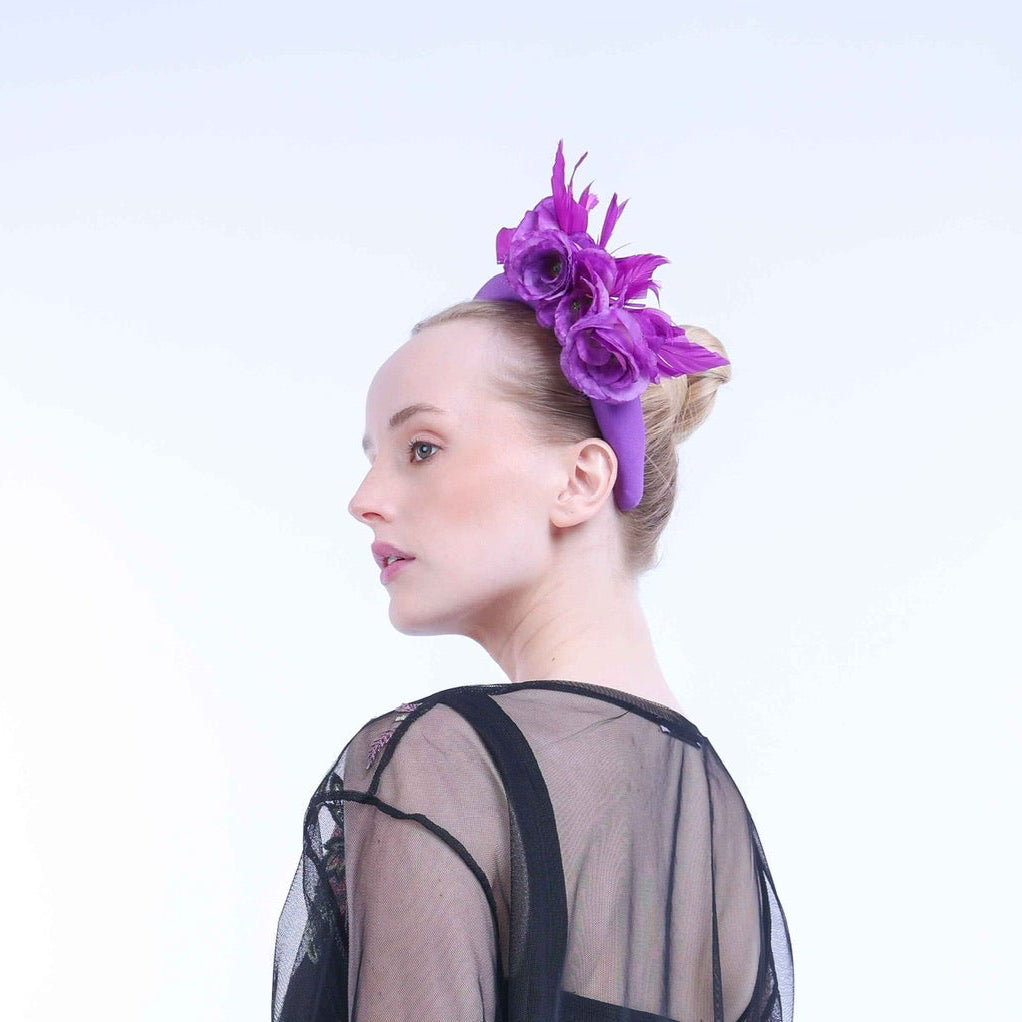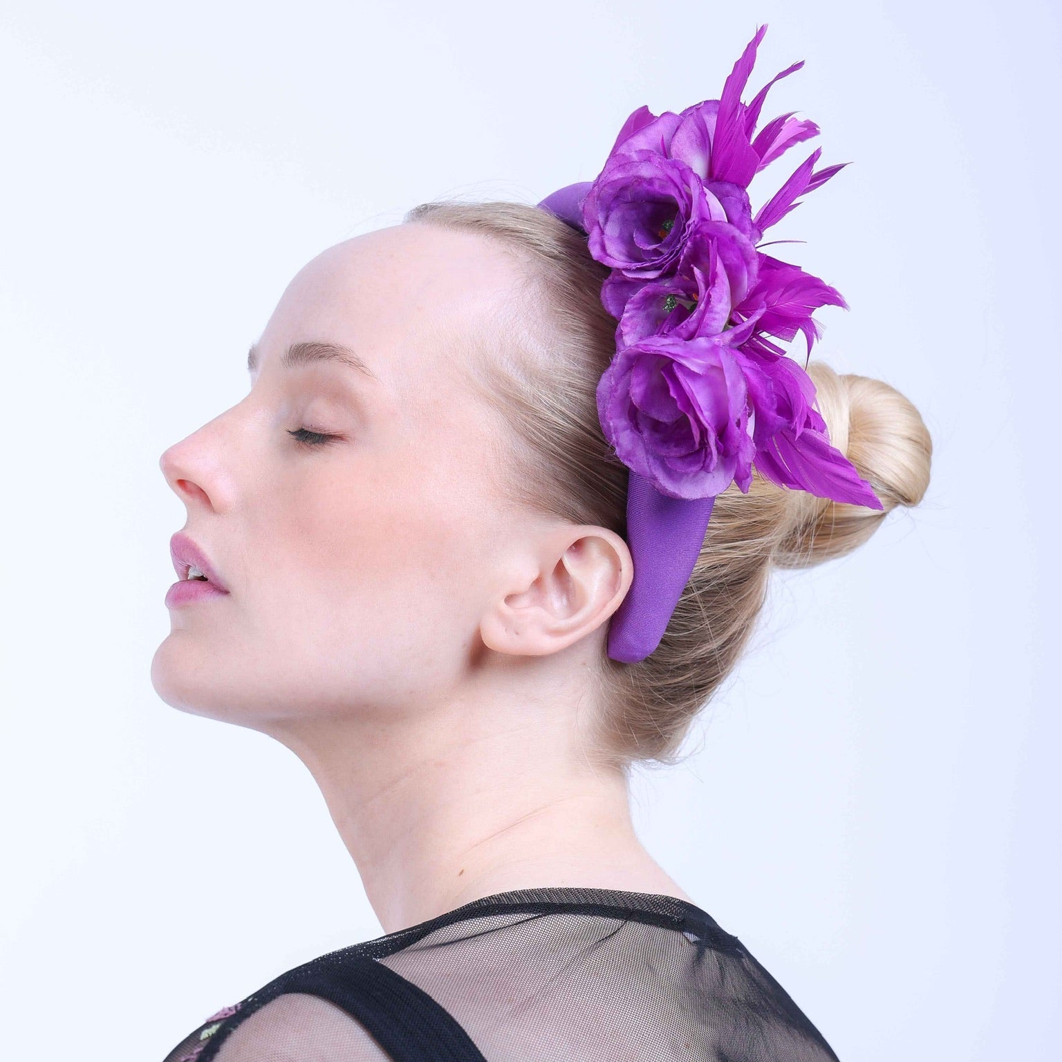 Diadema ancha de satén en tono morado, adornada en el lateral con un conjunto de flores y plumas que aporta un toque sofisticado y femenino. Ideal para ocasiones especiales, esta pieza destaca por su color intenso y su diseño delicado y expresivo.