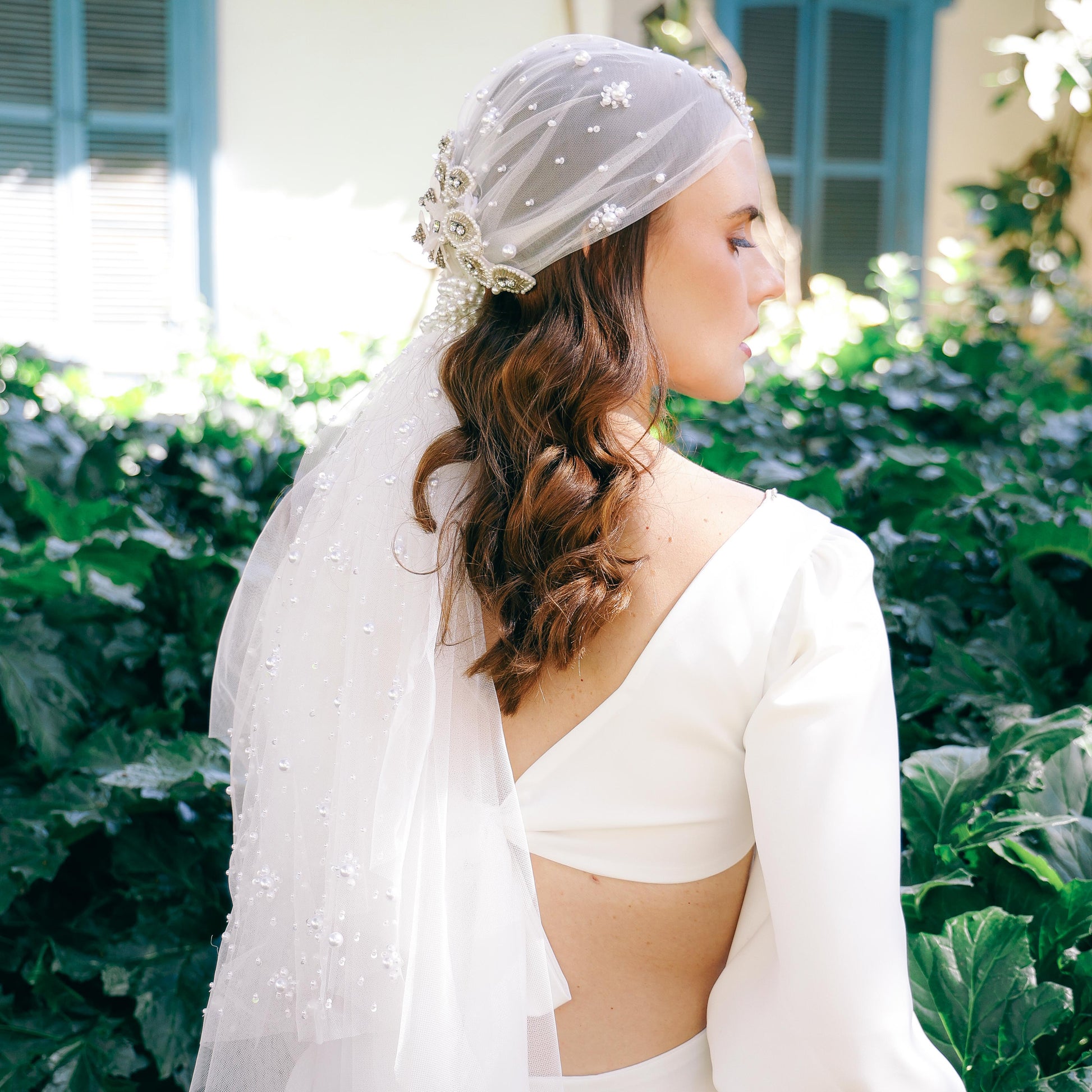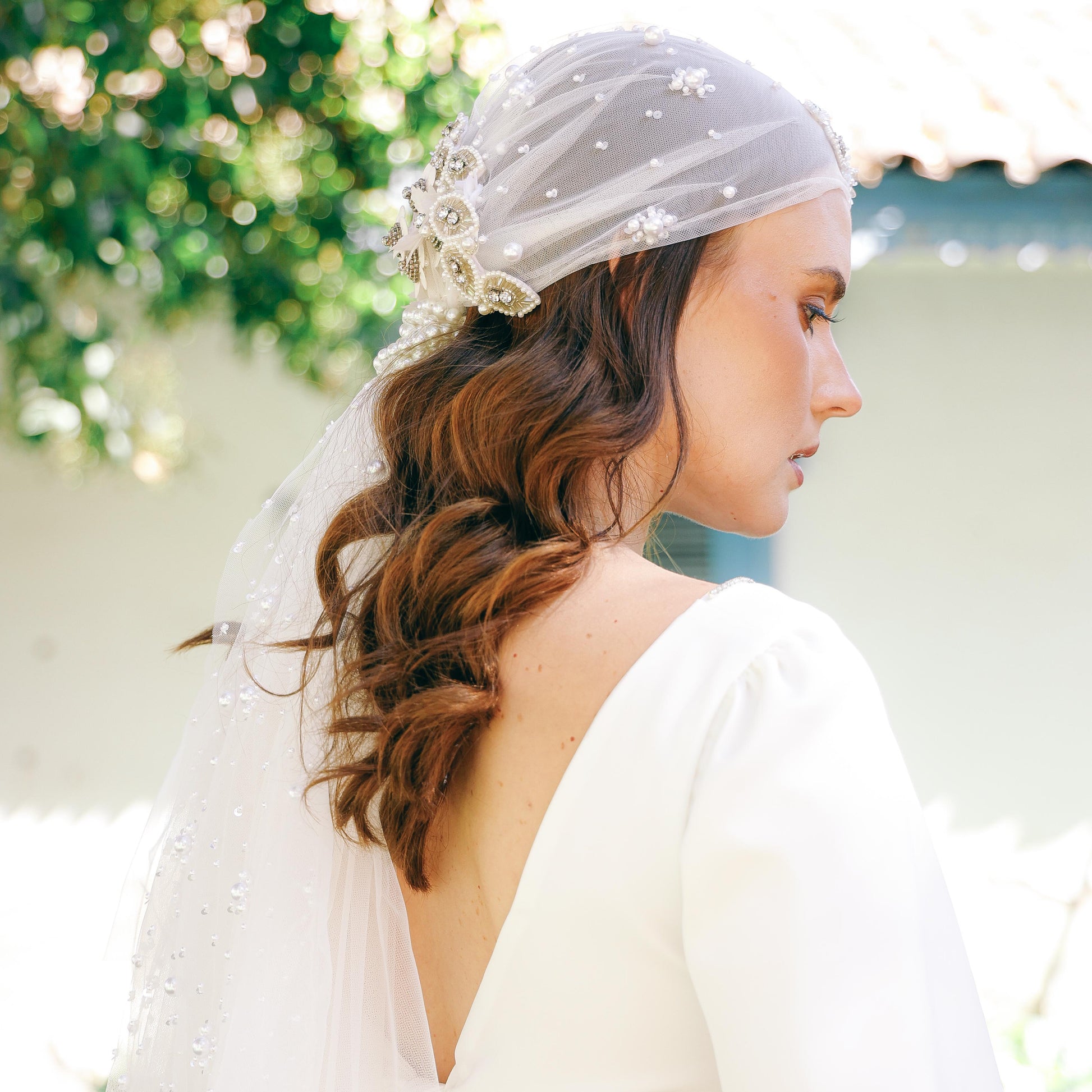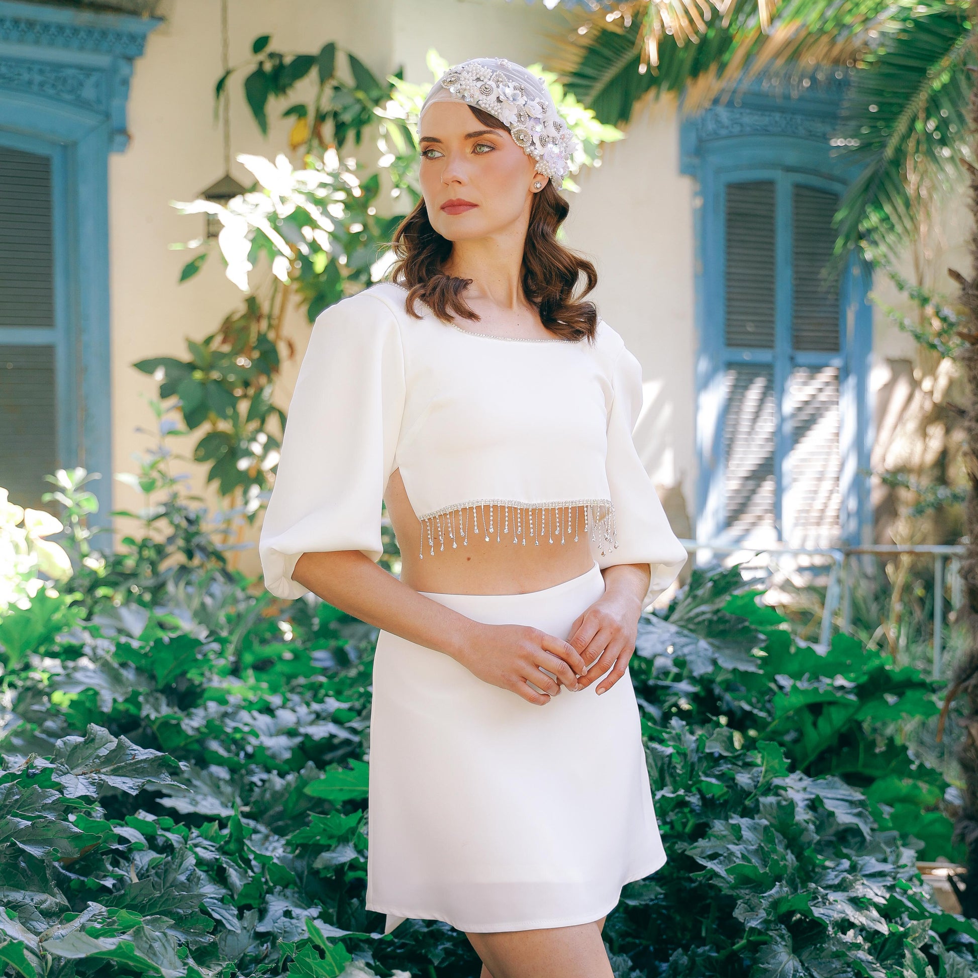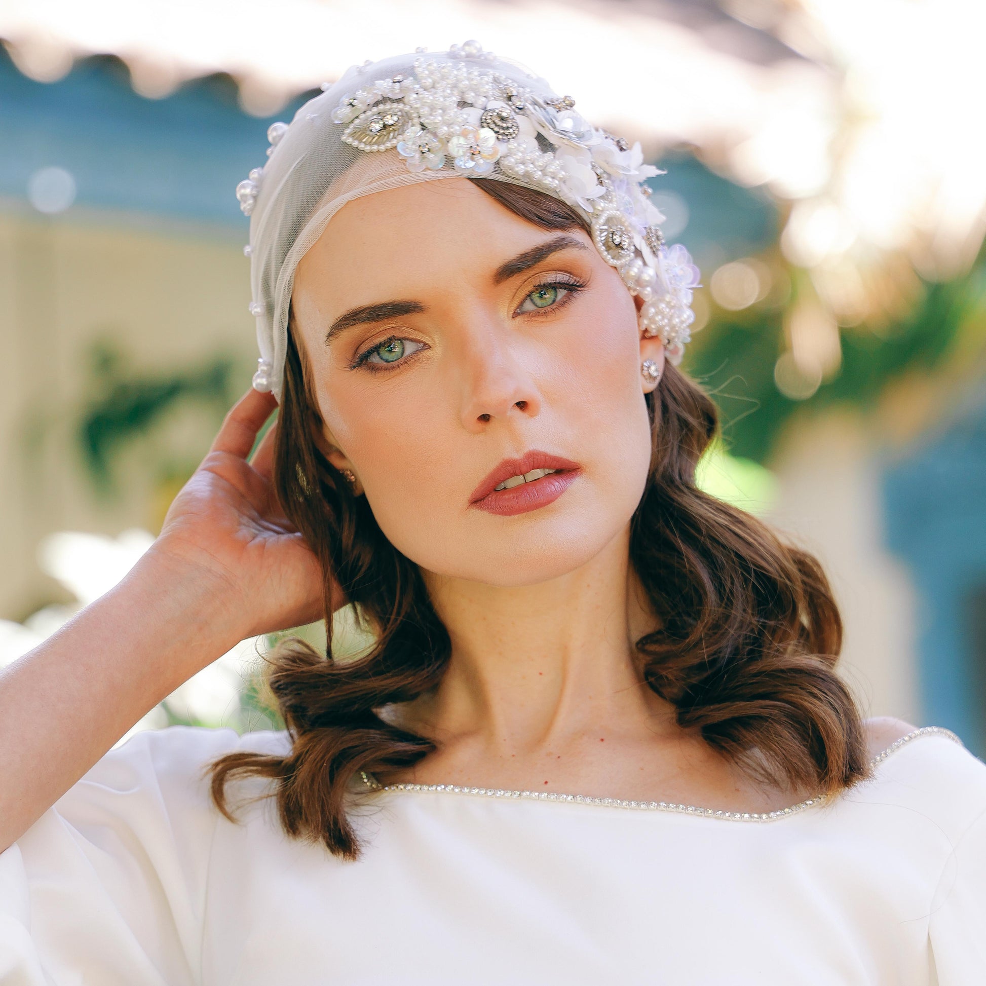 Turbante de tul adornado con aplicaciones de pedrería bordada, y amarrado con una banda elástica de perlas. Un accesorio sofisticado y único, que combina suavidad, brillo y elegancia