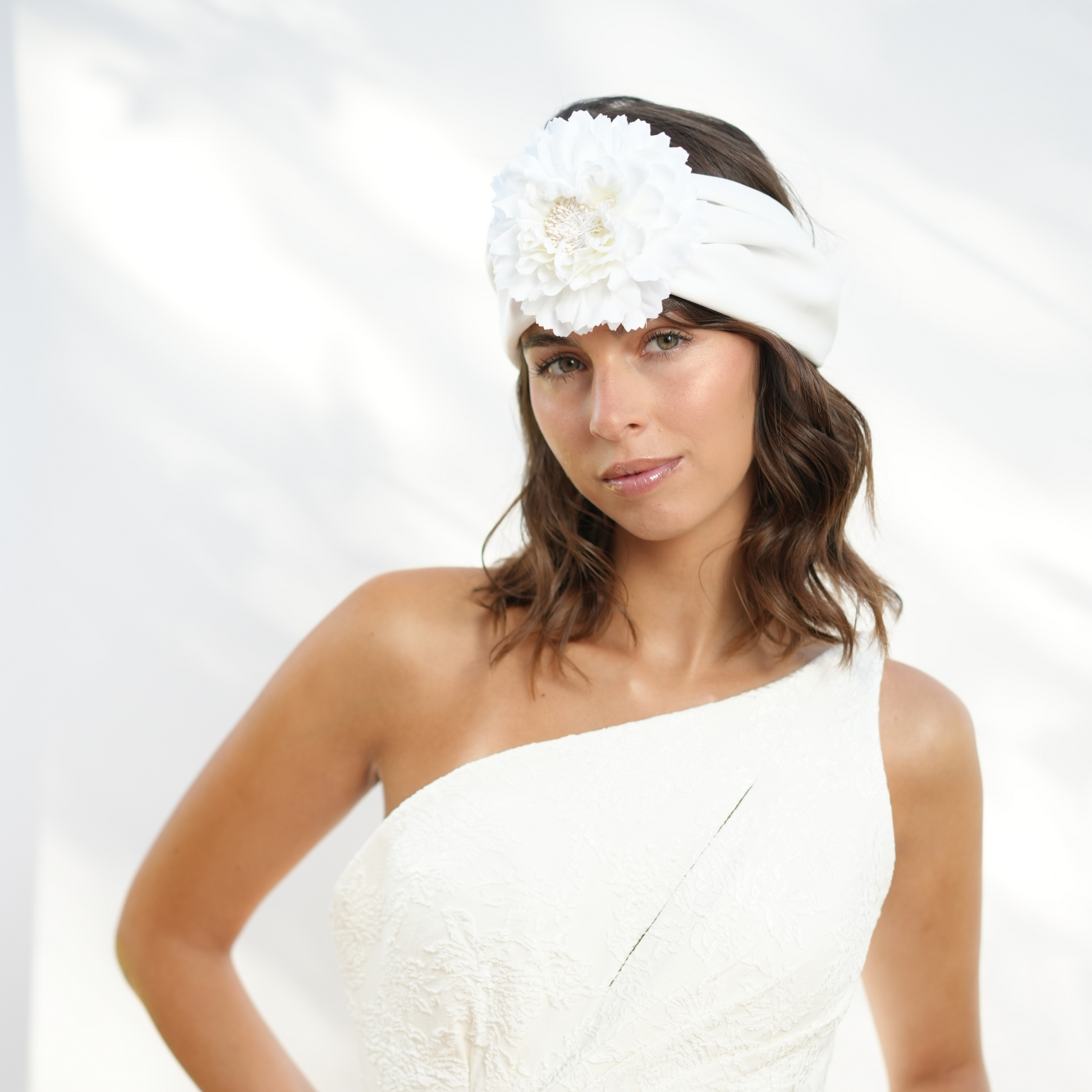 Turbante confeccionado en crepé de seda, con una flor central que aporta un toque romántico y femenino. Cuenta con elástico en la parte posterior para un ajuste cómodo, ideal para complementar looks sofisticados con estilo y suavidad.