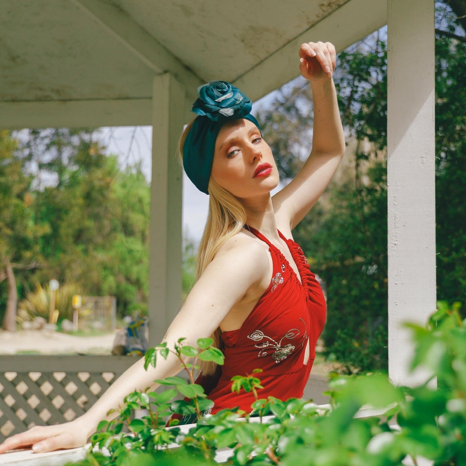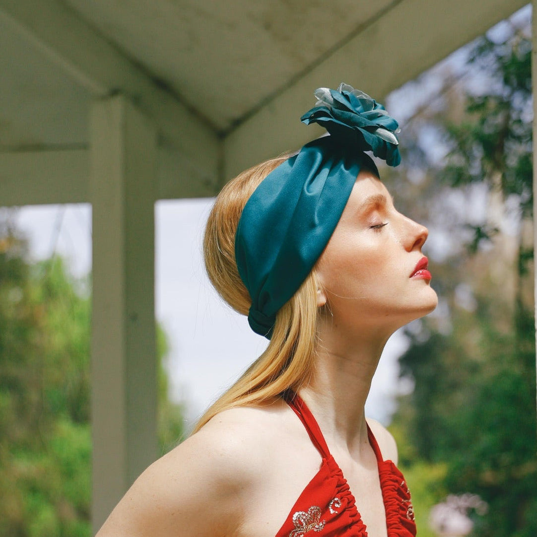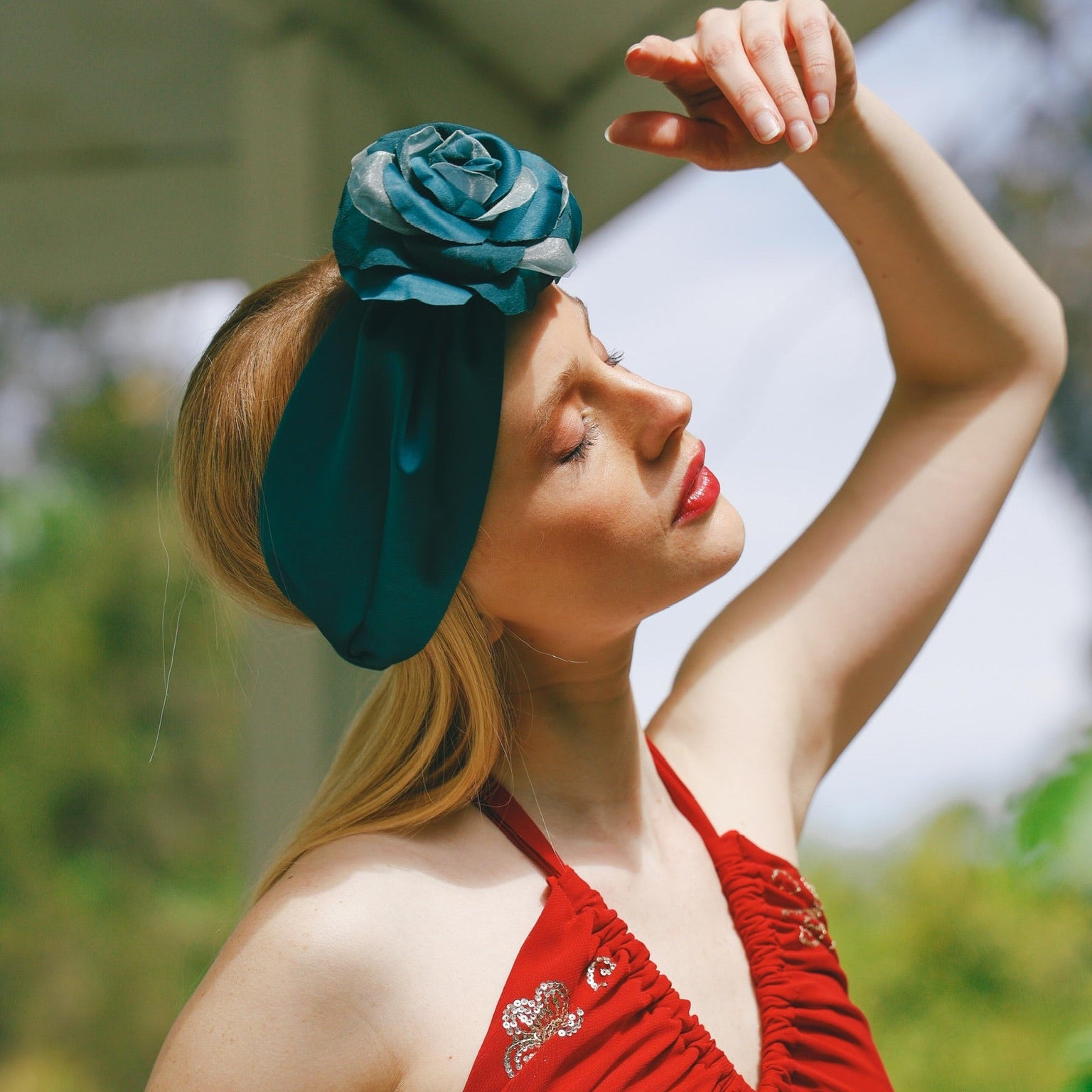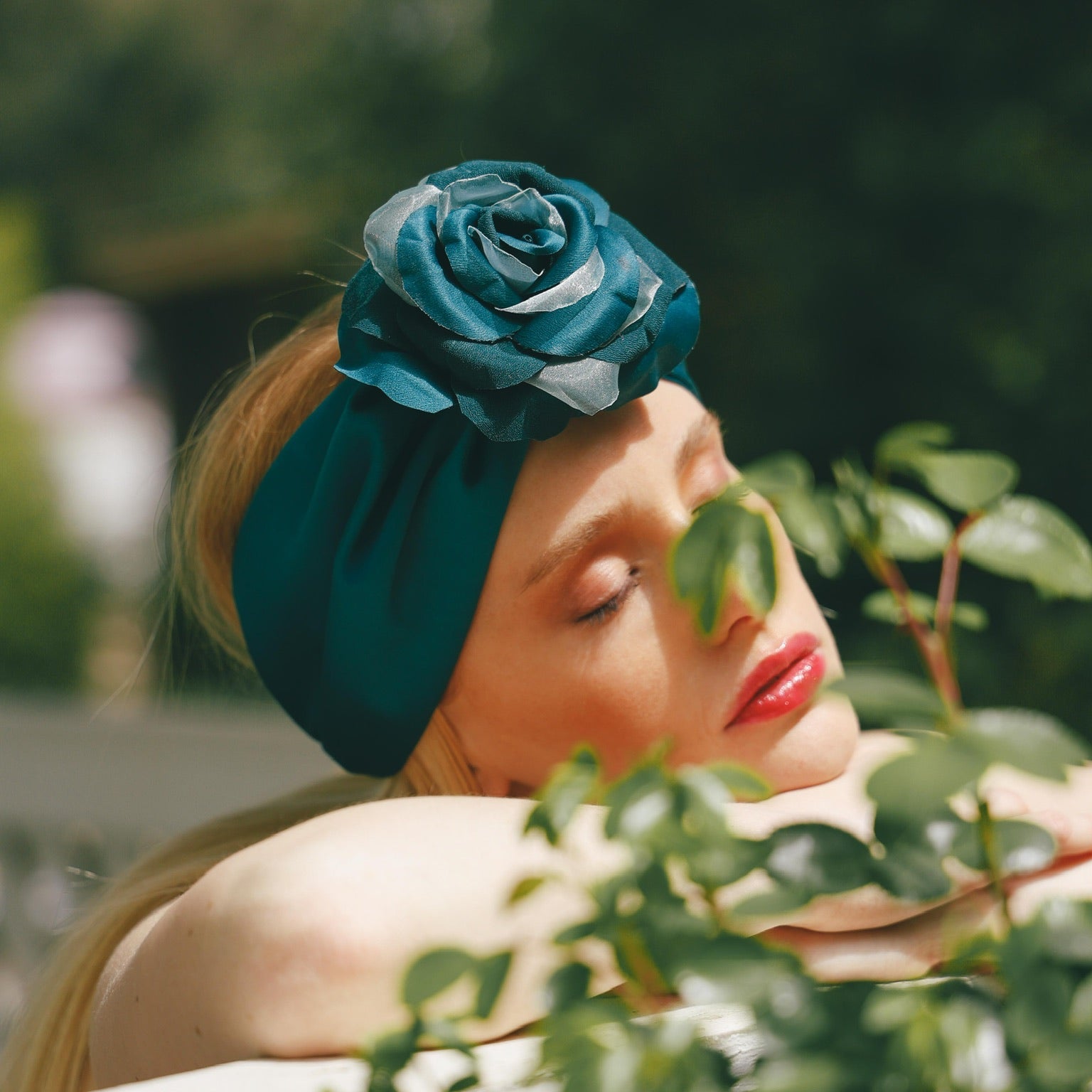 Turbante confeccionado en crepé de seda, con una flor central que aporta un toque romántico y femenino. Cuenta con elástico en la parte posterior para un ajuste cómodo, ideal para complementar looks sofisticados con estilo y suavidad.