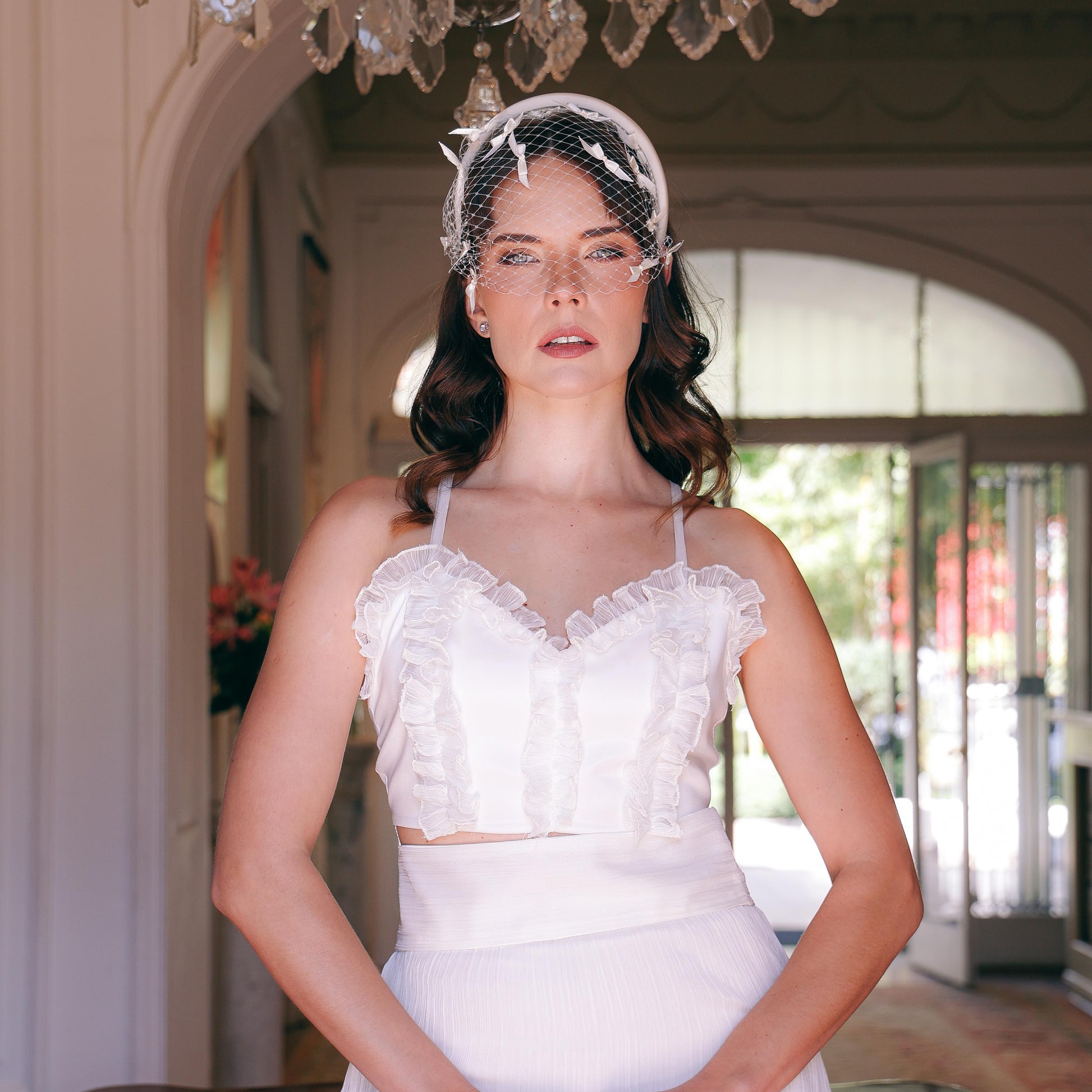 Diadema alta, confeccionada con tul simple y adornada con pequeños lazos de satín.